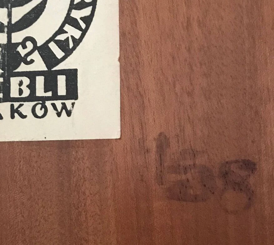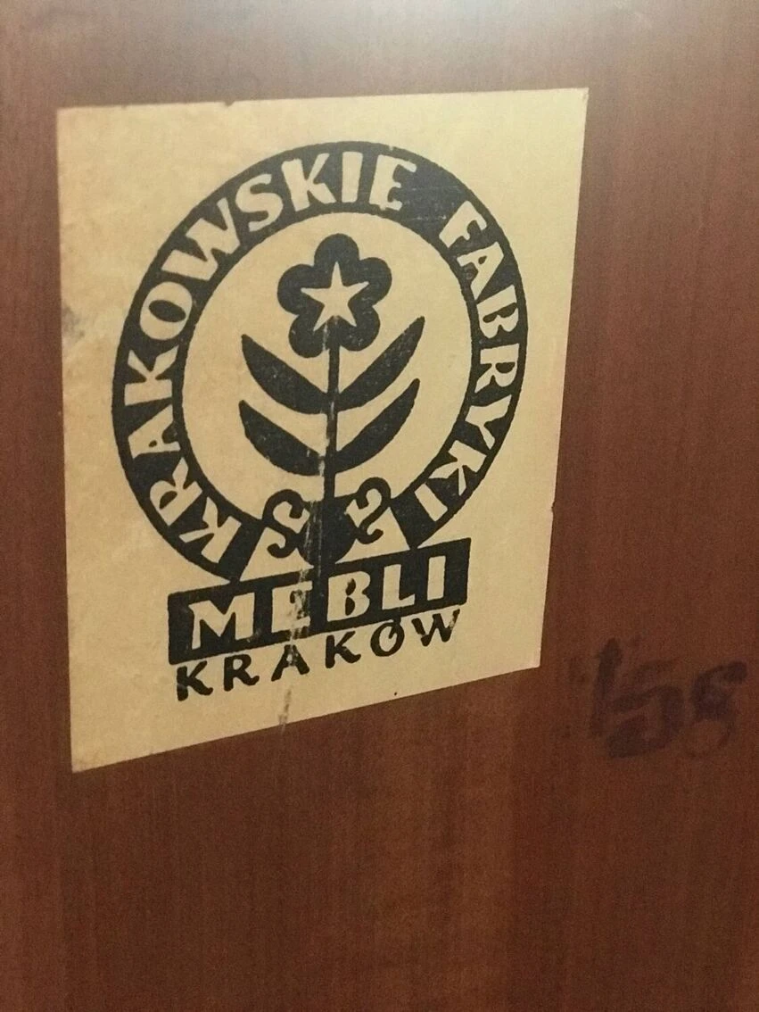 Large display cabinet published in the 1950s by the Krakow (Poland) publisher Krakowskie Fabryki Mebli Krakow (label and number present on the back of the cabinet). Very large storage capacity on 8 levels. Important detail: original key handles in a very beautiful oval shape, sliding perfectly and locking perfectly (rare enough to be mentioned). Windows without any shine. The piece of furniture being heavy and dense, it had been fixed at height but consolidated at the four corners for safety (see photos). Very stable, nothing prevents it from being placed on the floor, on a sideboard or a chest of drawers. This is a very nice original piece.