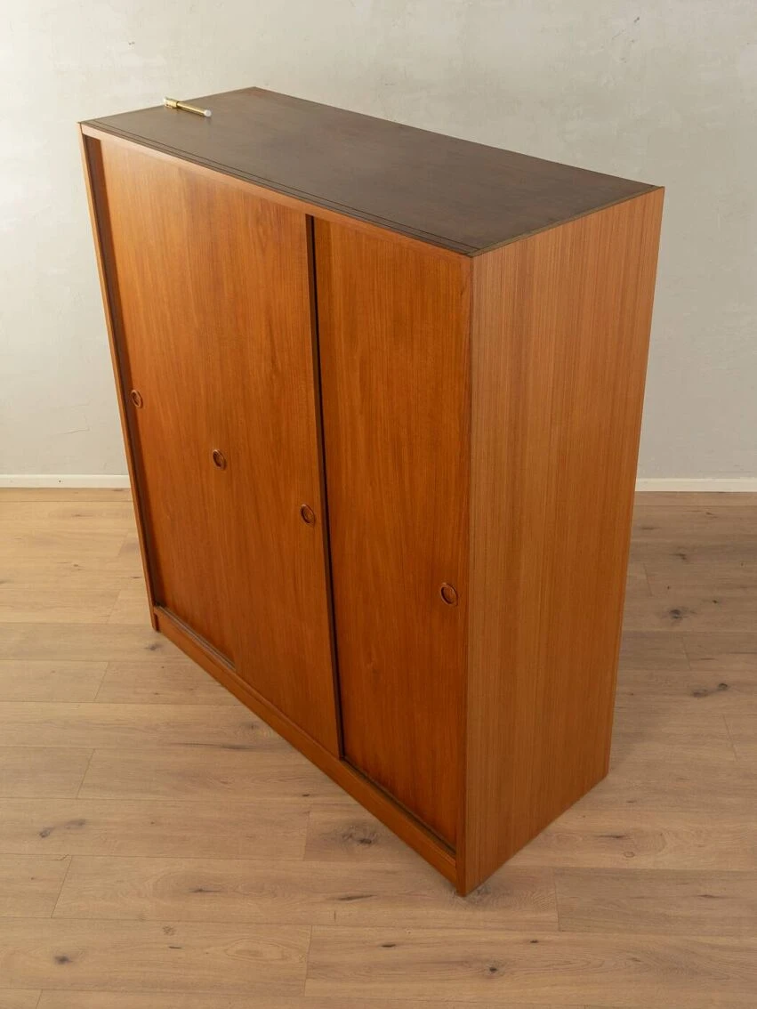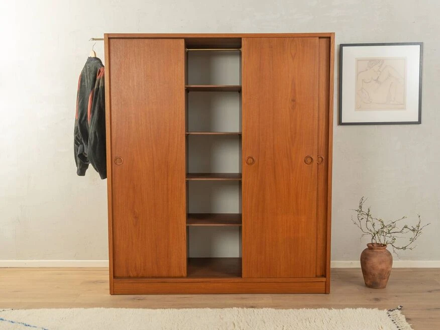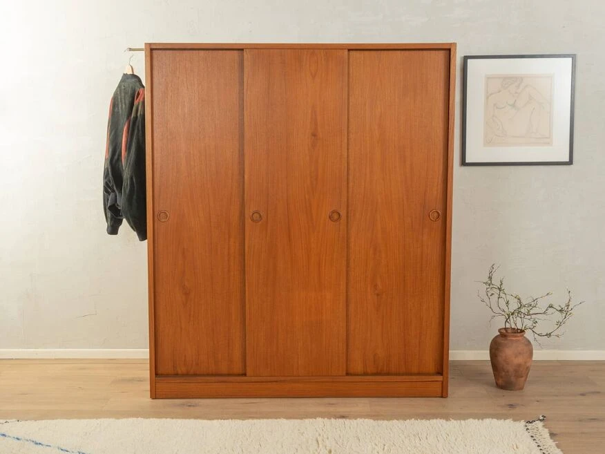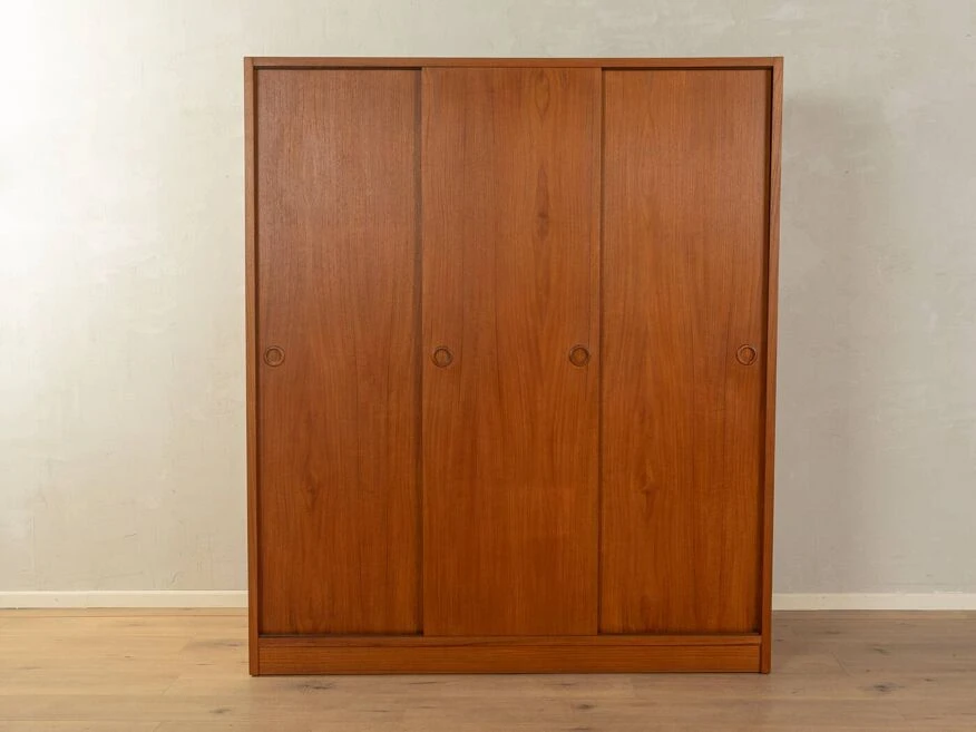 Corpus in teak veneer with three sliding doors, four shelves, three clothes rails and a base.