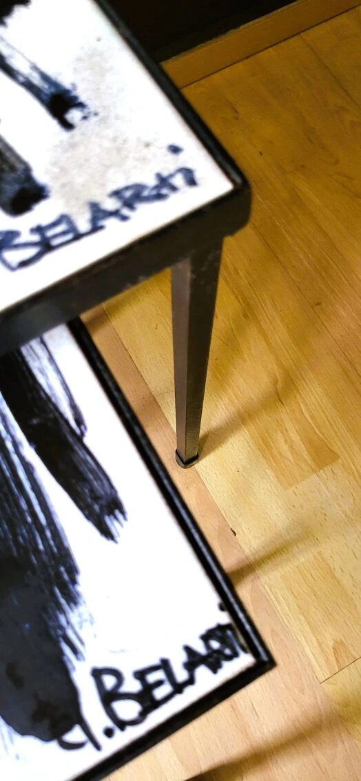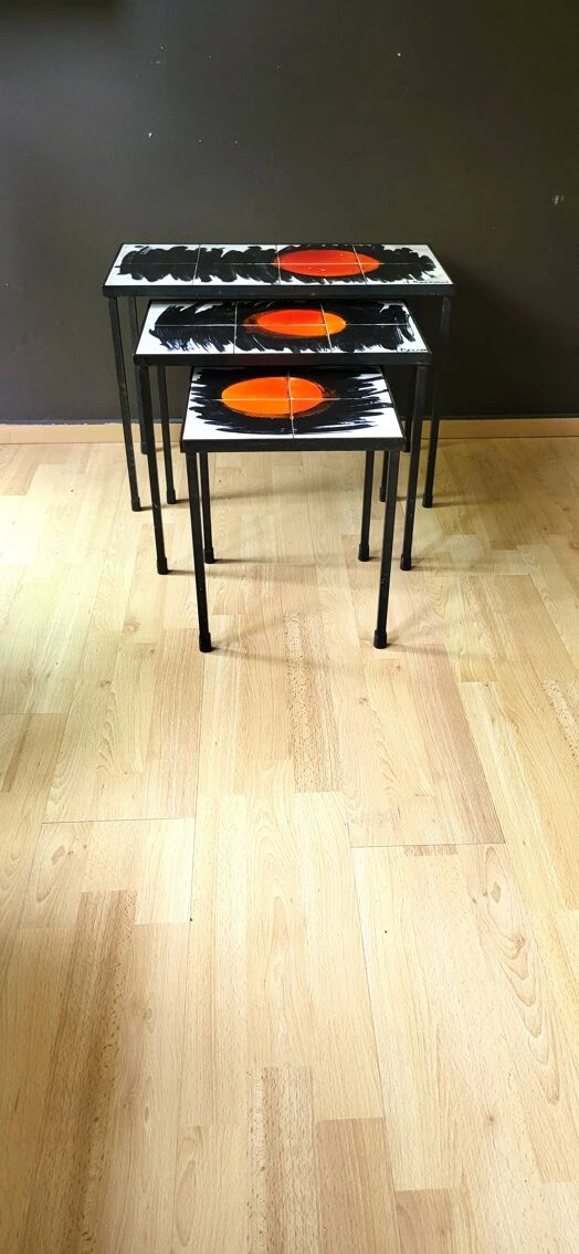 3 Belarti coffee tables in very good condition. In ceramic and wrought iron circa 1970s’ – All foot protections are present L 63 x D 32 x H 44cm L 47 x D 32 x H 41cm L 32 x D 32 x H 37cm Home delivery in Paris €75