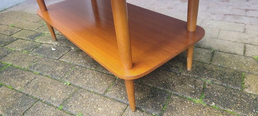 Spindle base and double top, this little seventies coffee table doesn’t stop there!