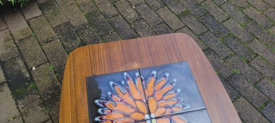 In teak veneer, the top offers a gray and orange floral ceramic decoration.