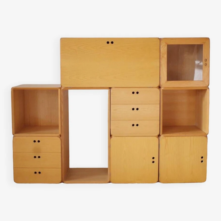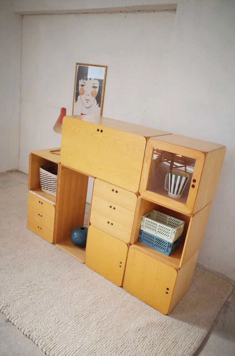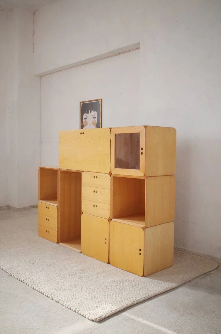 Die einzigartige mischung aus offenen und geschlossenen modulen sorgt gleichzeitig für stauraum und ausstellungsfläche.