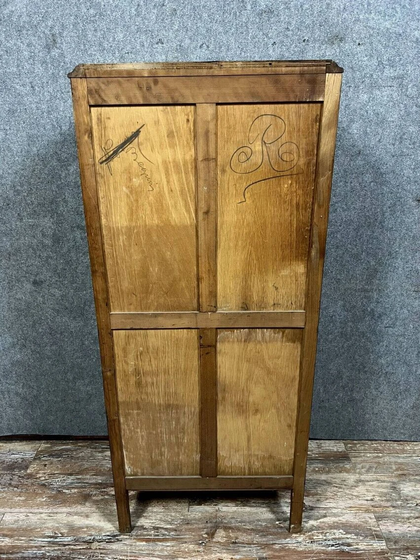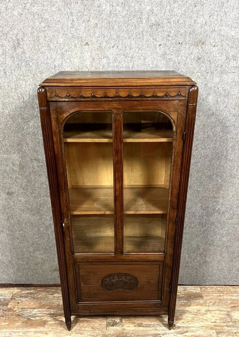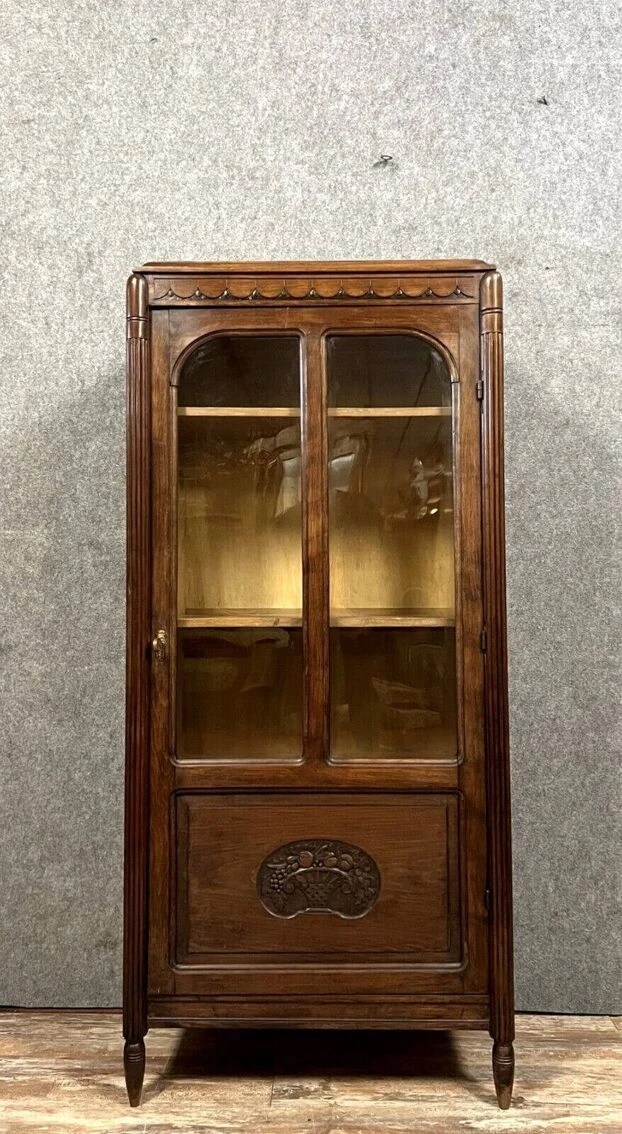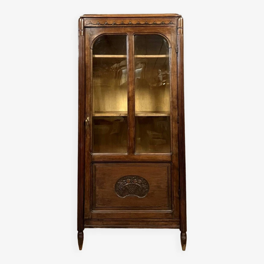 According to Maurice Dufrène: Art Deco period bookcase circa 1930 1 glass and paneled door carved with a basket of fruit sides with fluted columns arched feet h152 x 69 x 40