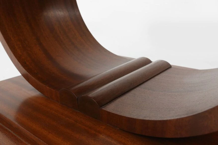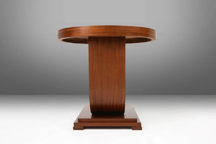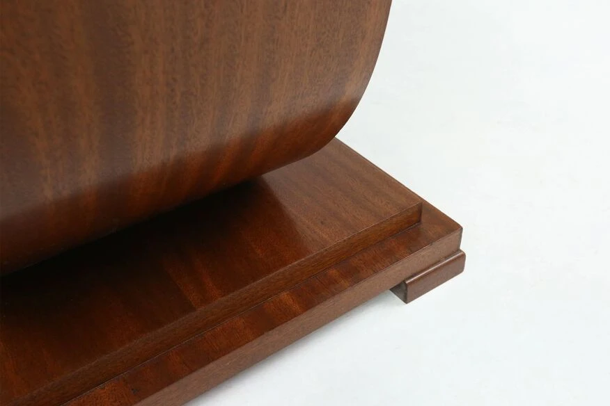 The arched shaped base with stylish crafted geometric decoration is typical for art deco furniture.