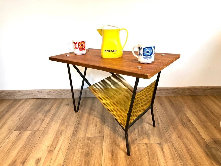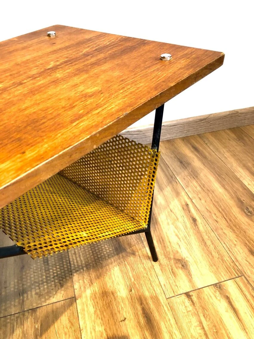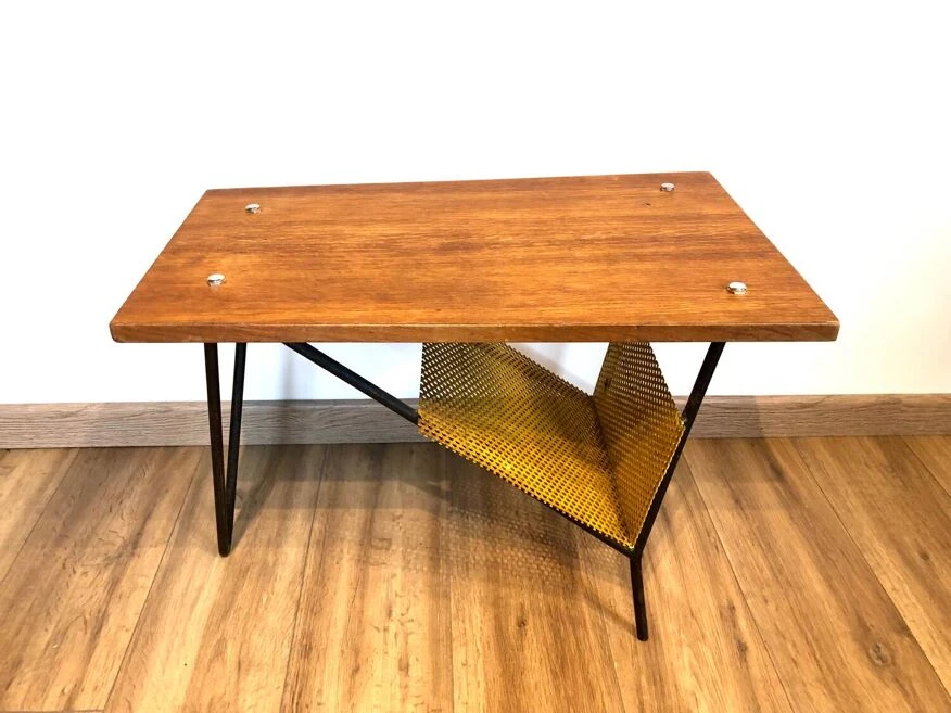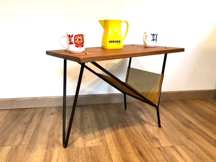 Coffee table asymmetrical wooden top mategot style perforated metal magazine holder steel tripod base dimensions 40×65 height 47 cm.