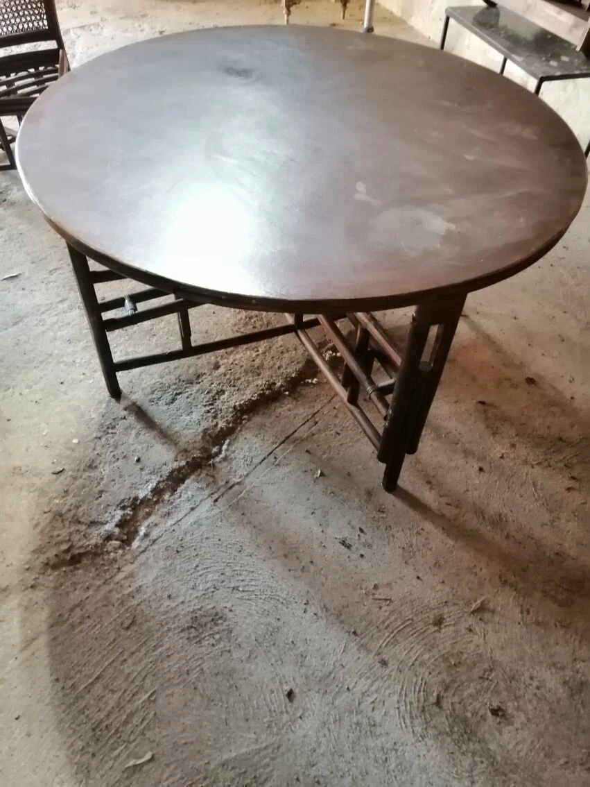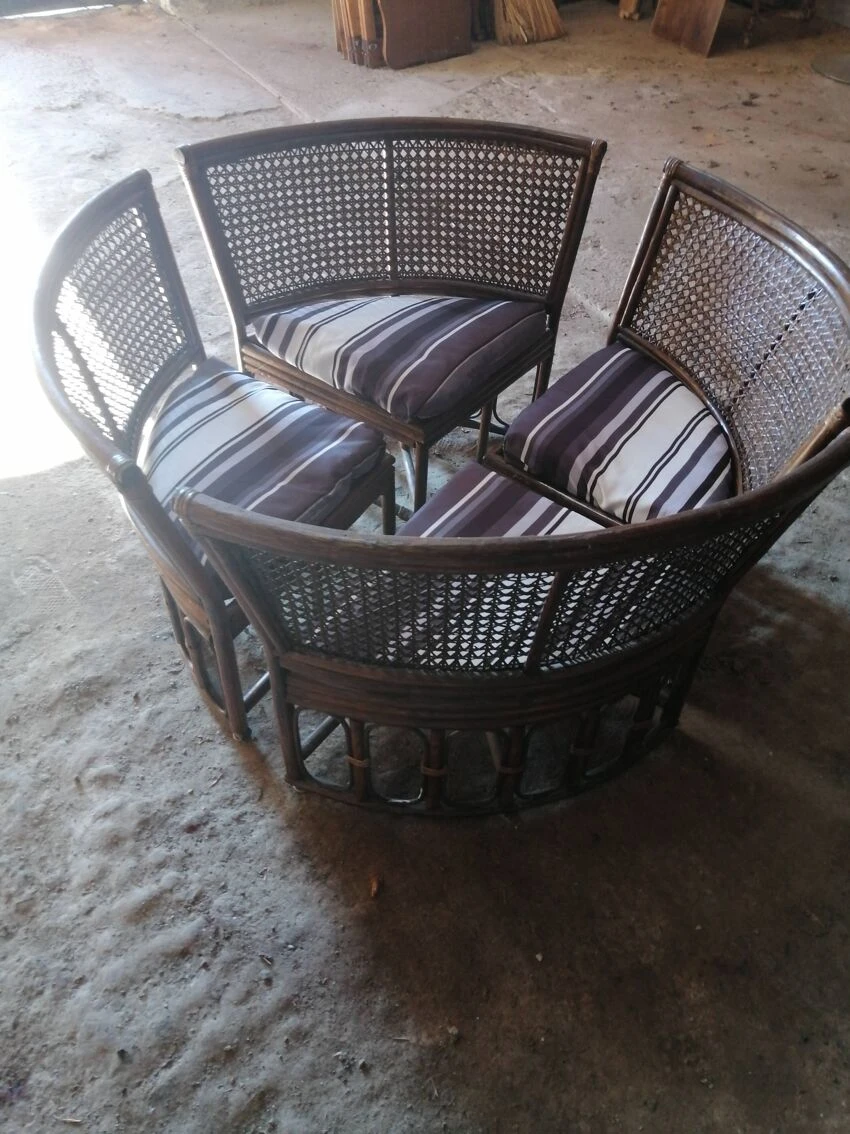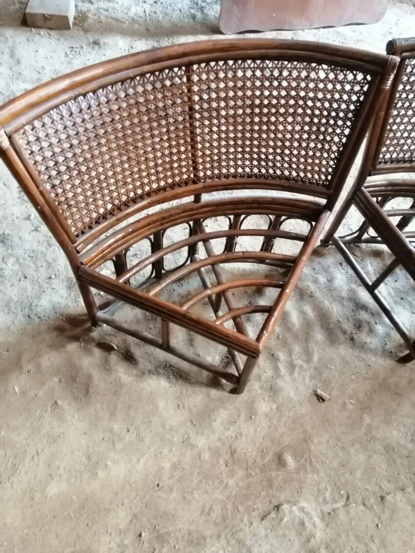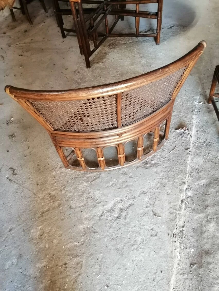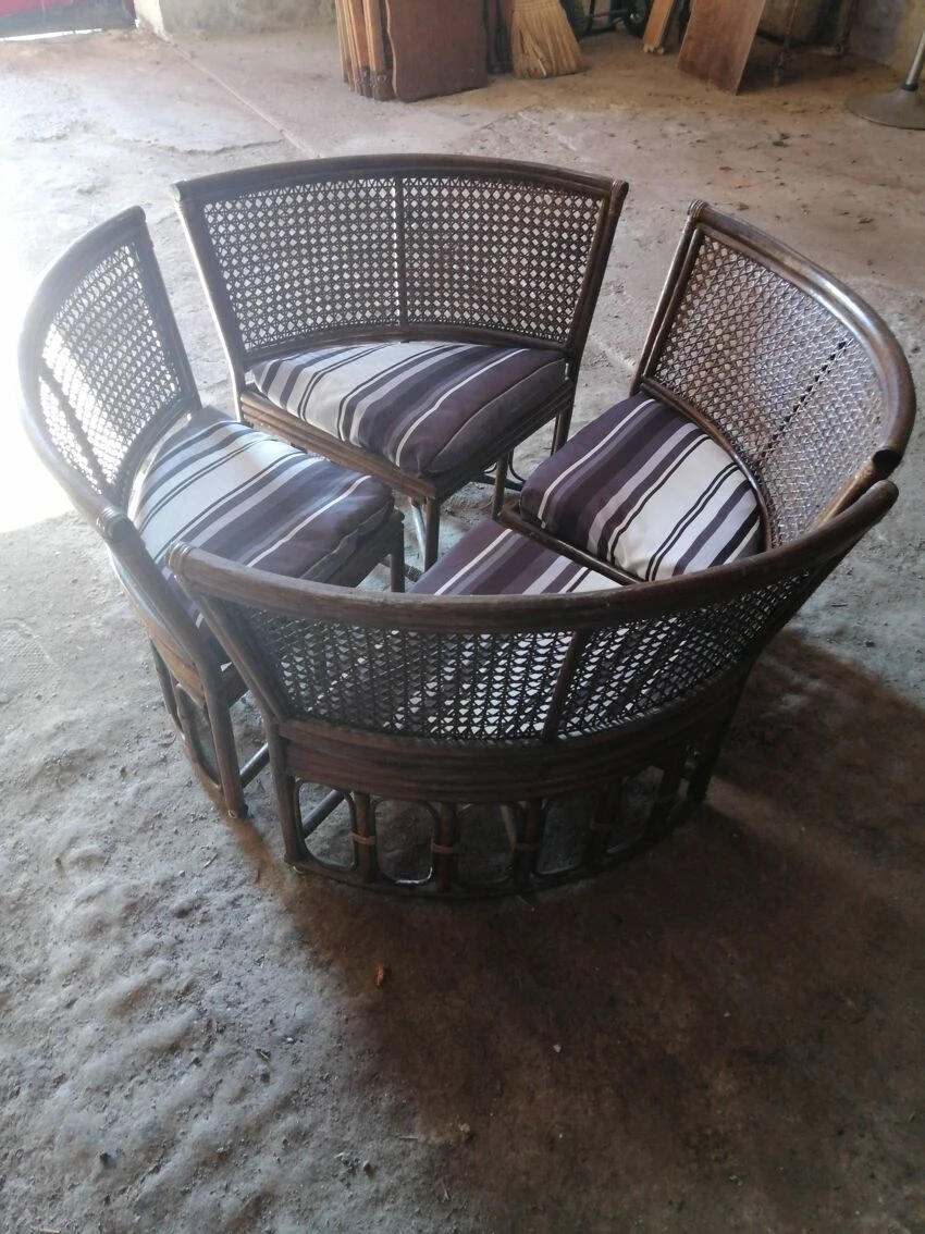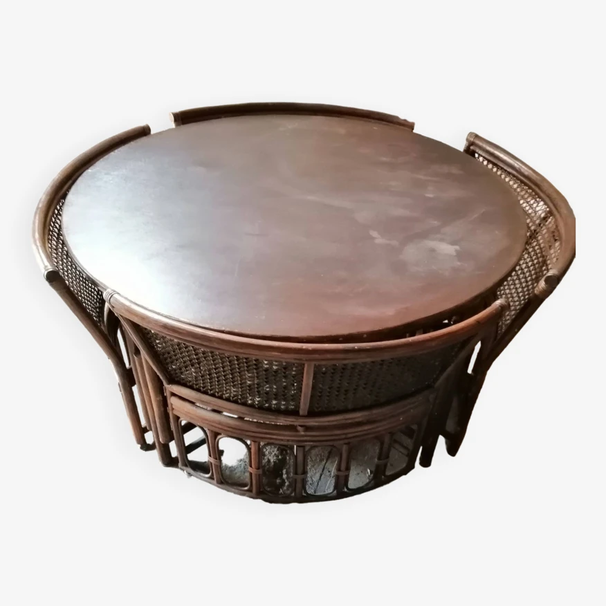 Bamboo coffee table adjustable in height using an ingenious interlocking system. Can be used as a coffee table and dining table. + corner chairs in bamboo and rattan with cushion. A trace of wear on the back of a chair. Dimensions of the table height 68 cm diameter 123 cm. Structure of the bamboo table and wooden top (with traces of wear over time) Bamboo and rattan chairs. Cushion in new condition (restore) Sold in its original state.