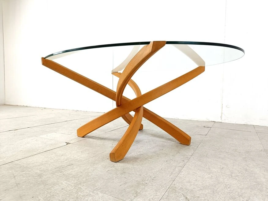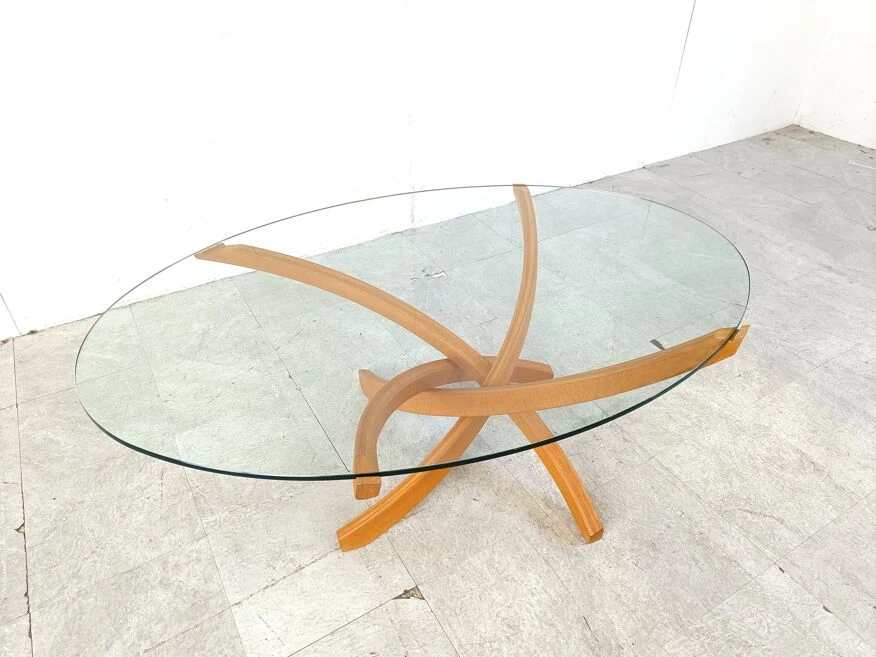 Elegant bentwood coffee table made from beech and a clear oval glass top.