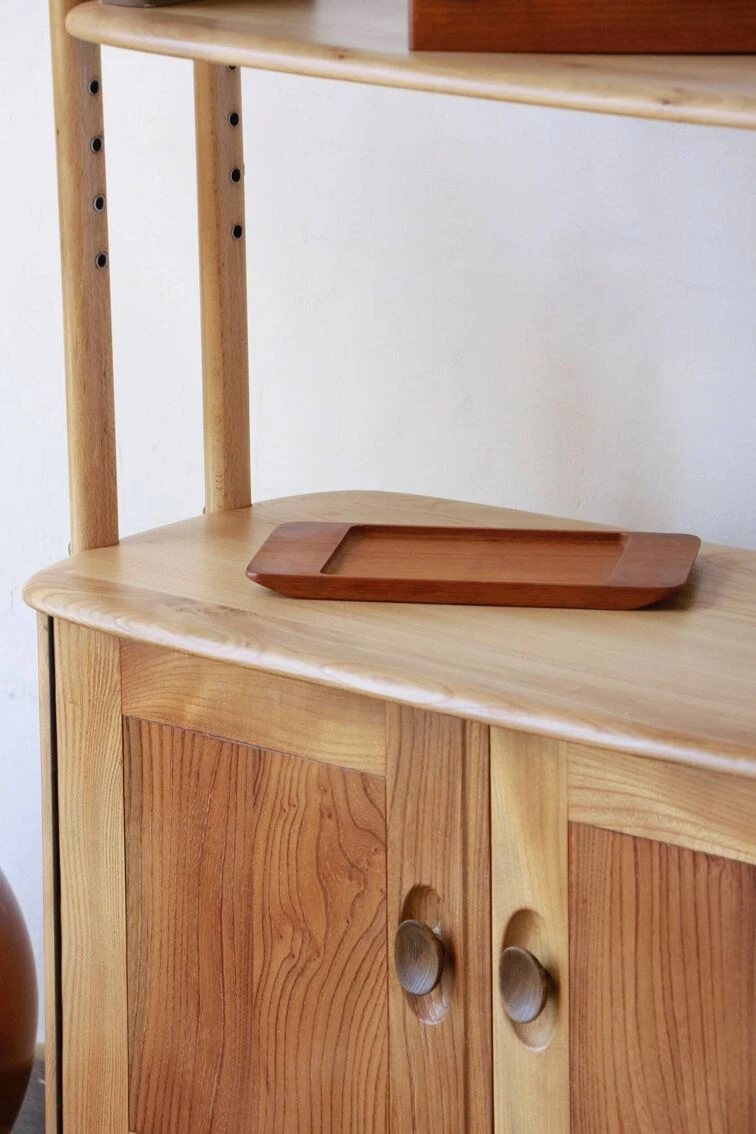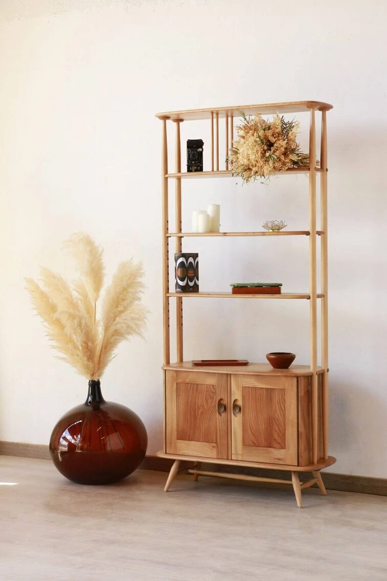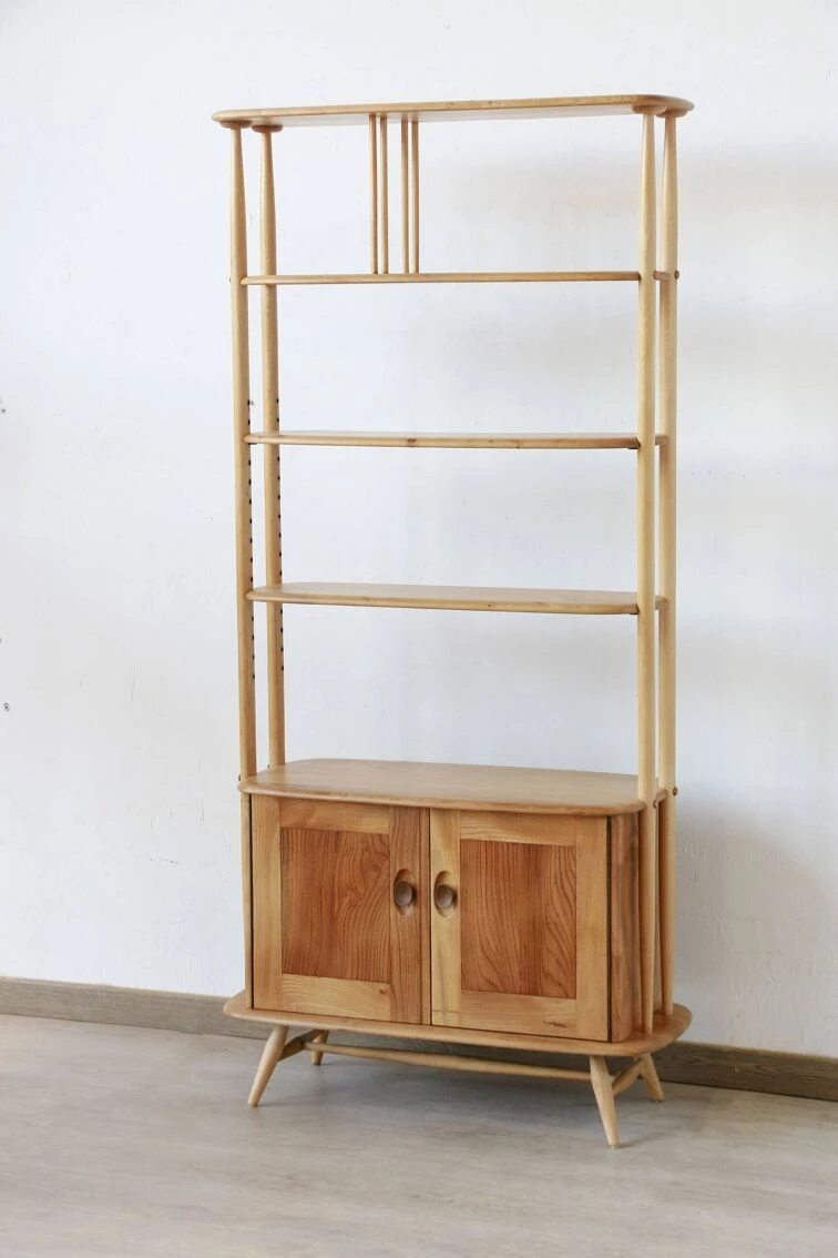 Dimensions: l 92 X d 41 X h 191 base h 17.5 cm storage with doors – l 74 X d 41 X h 42.5 model published by: ercol design: lucian ercolani origin: england period: 1950s materials: elm and beech proof of attribution: listed model – absence of marking restoration: fully checked and controlled this bookcase has been completely sanded and waxed (so as to keep the raw wood appearance) to protect and nourish the wood.