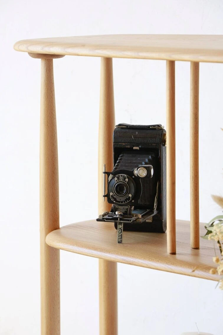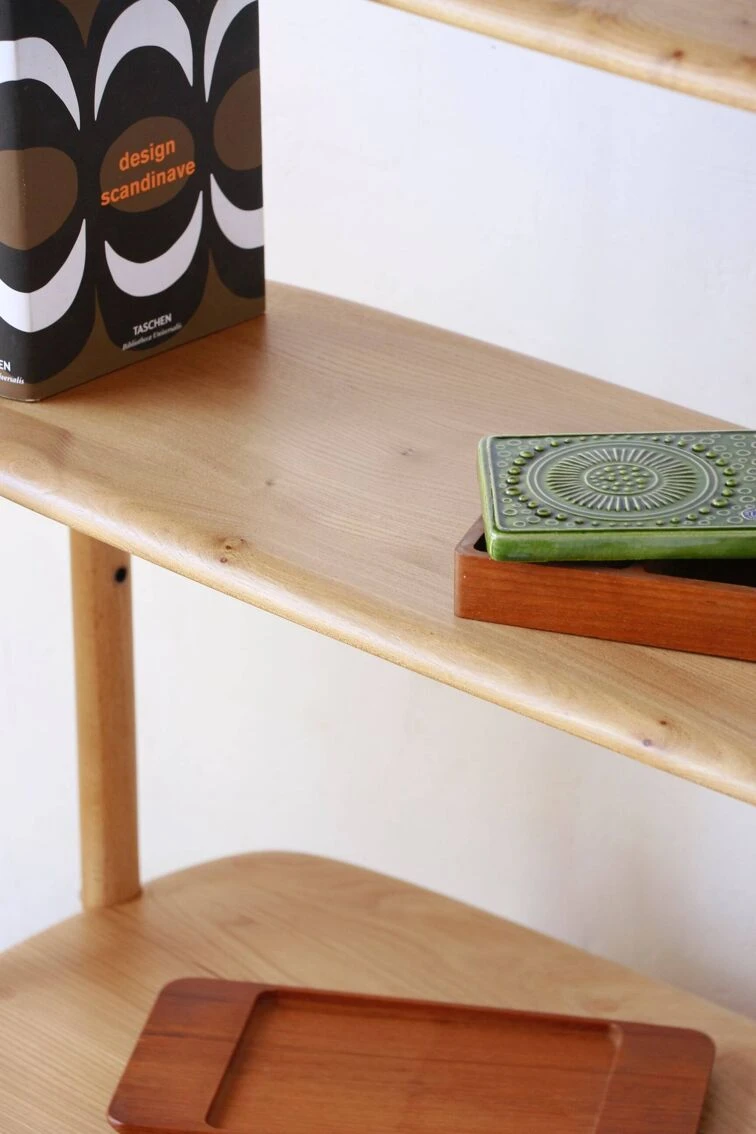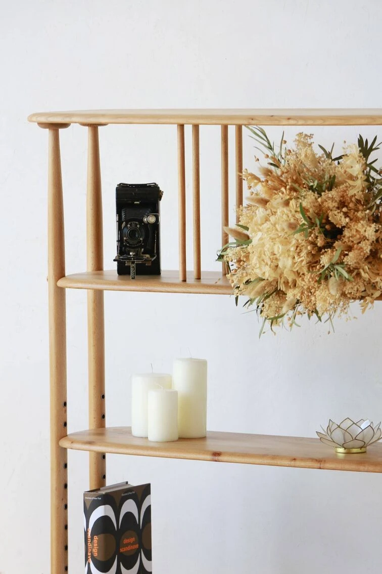 This model is made up of three shelves, two of which are adjustable and a solid elm cabinet with superb grain and with flared legs in solid beech, this versatile piece is ideal in a living room, an entrance, an office or even a bedroom.