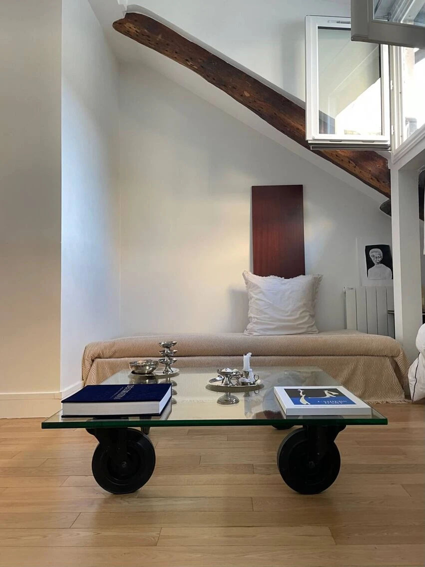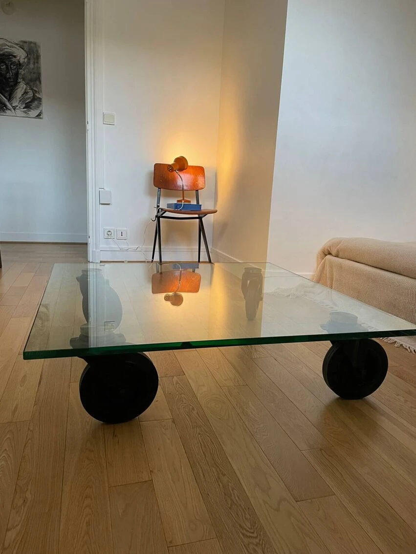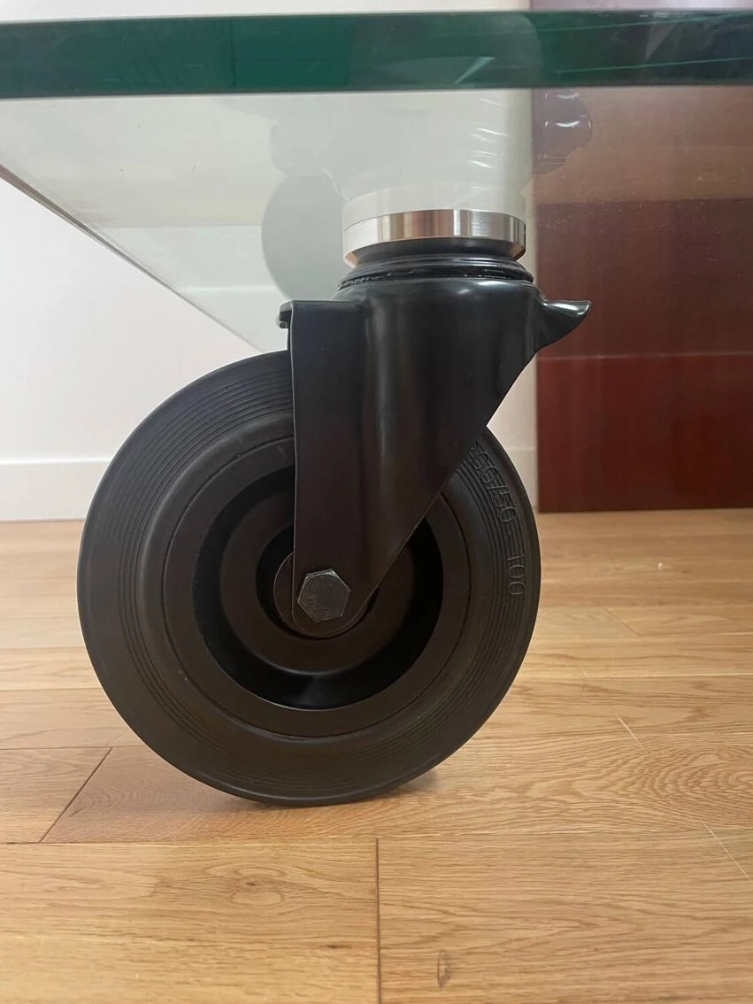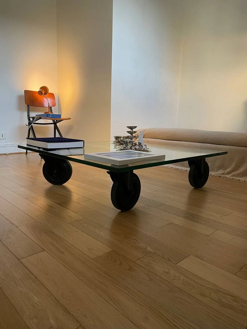 Gae Aulenti Coffee Table, Circa 1990 100 by 100cm Four black casters topped with a glass top, UV glue on metal supports Free delivery to Paris and its surrounding suburbs