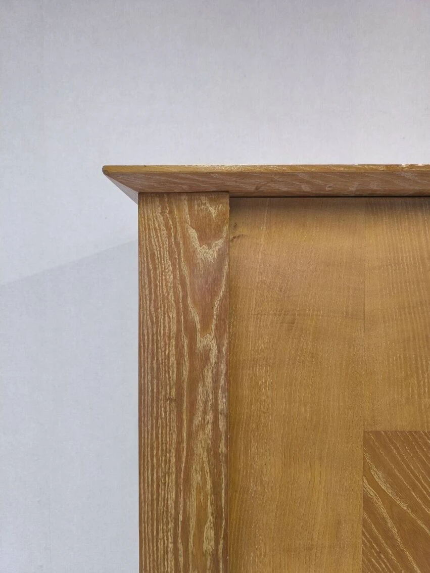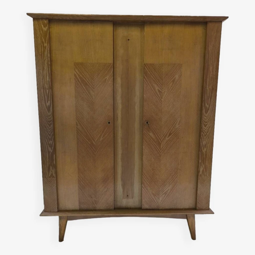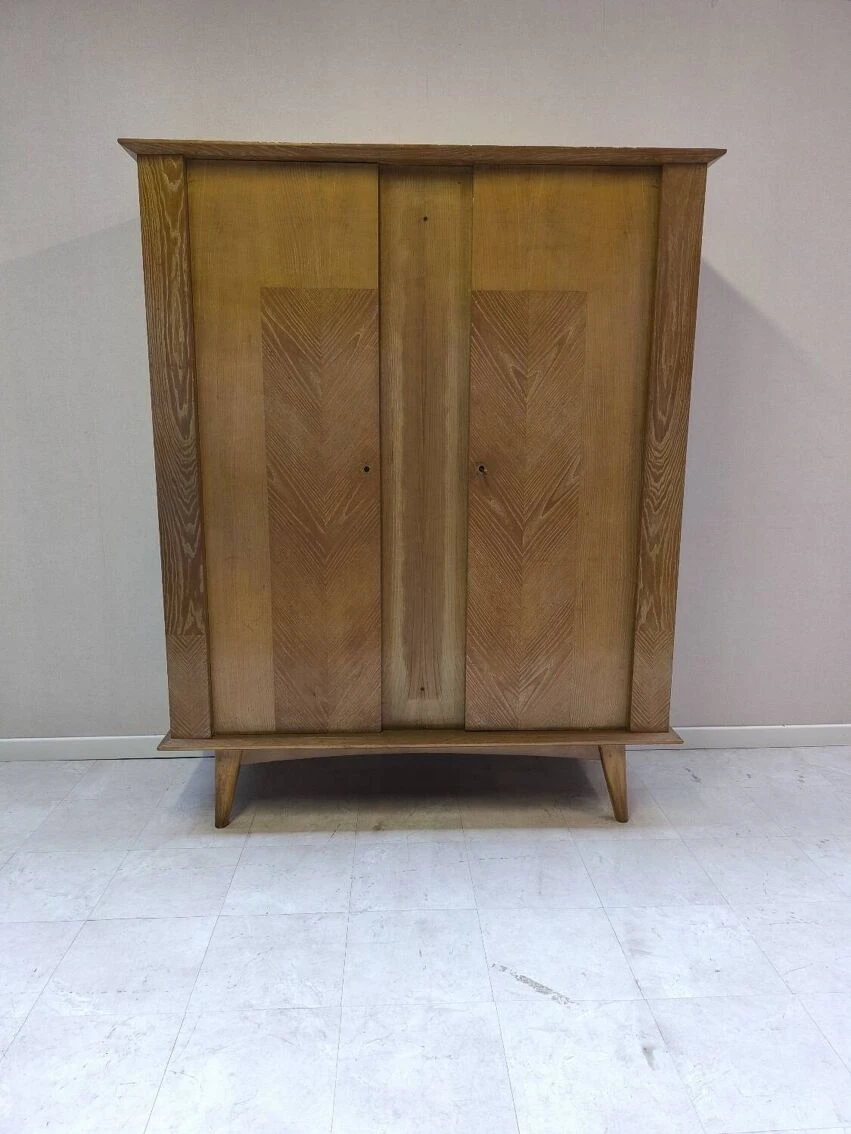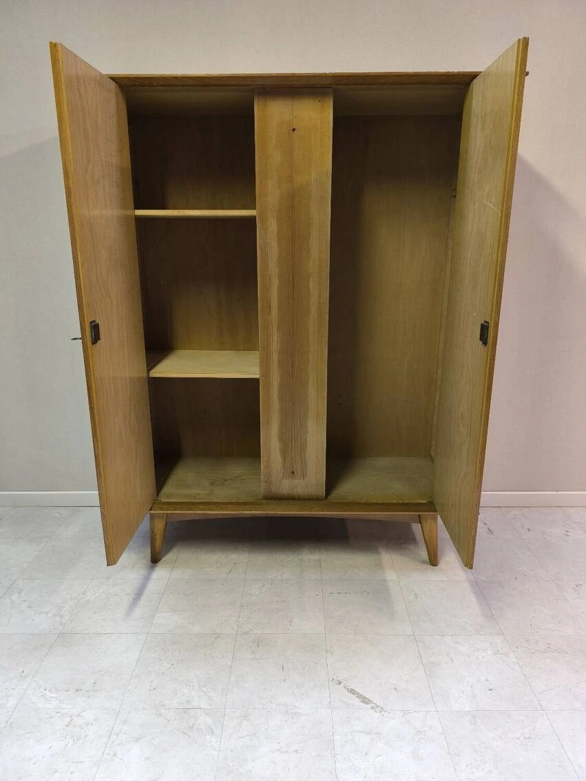 Compass foot wardrobe in blond oak from the 60s. A wardrobe space on the right and a space with two shelves on the left. The cabinet closes perfectly. Very good state. Dimensions height 180 cm width 147 cm depth 50 cm.