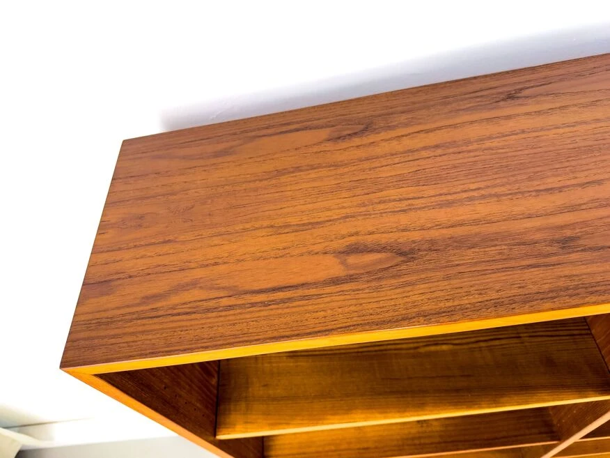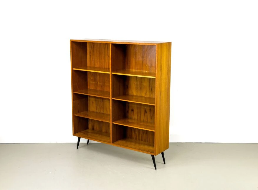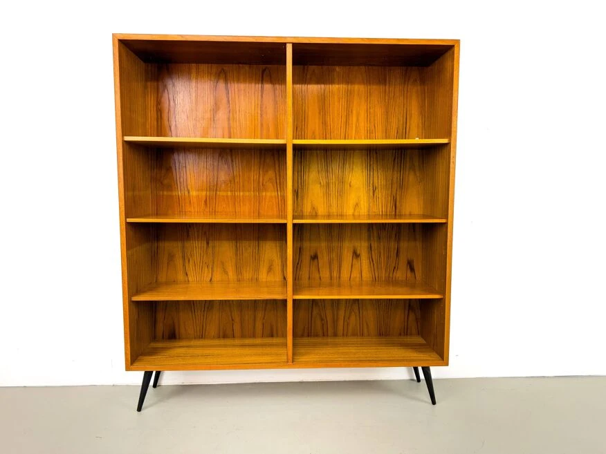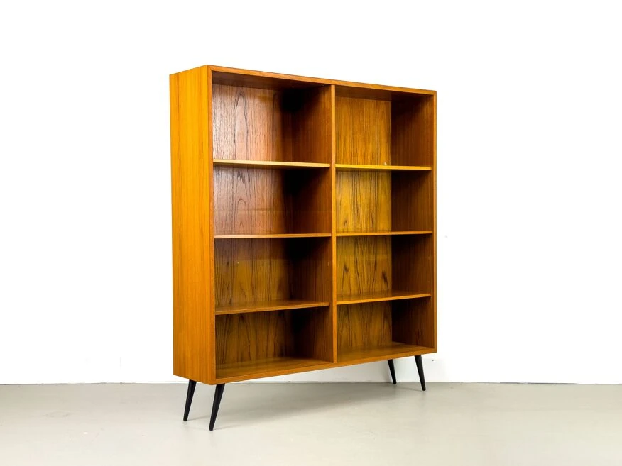 Minimalistisches Teakholz Bücherregal mit sechs Regalböden, die individuell eingelegt werden können.