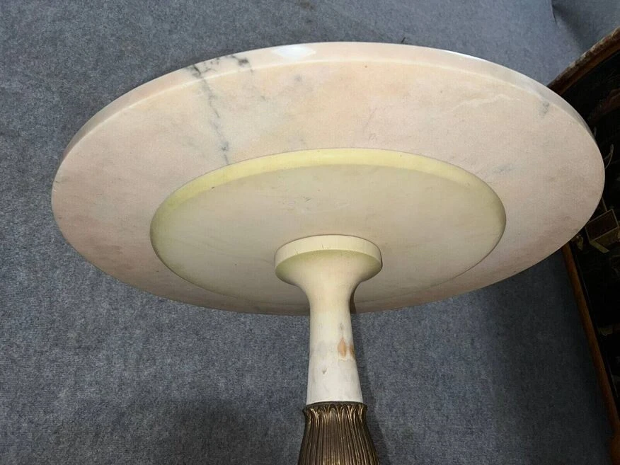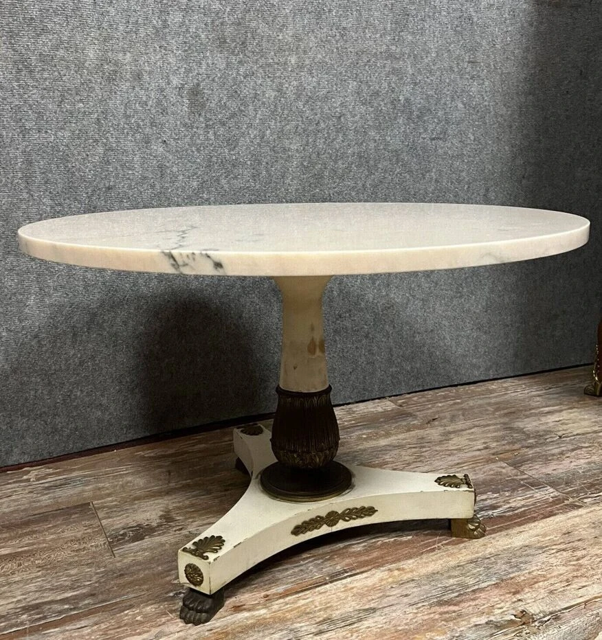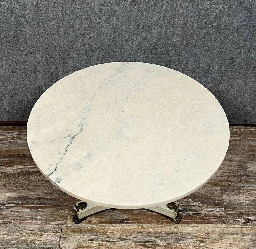 Empire style coffee table in marble, lacquered wood and gilded bronze circa 1920 circular top in white carrara marble and lacquered wood terrace abundant with gilded bronze decorations h46 X 72d.