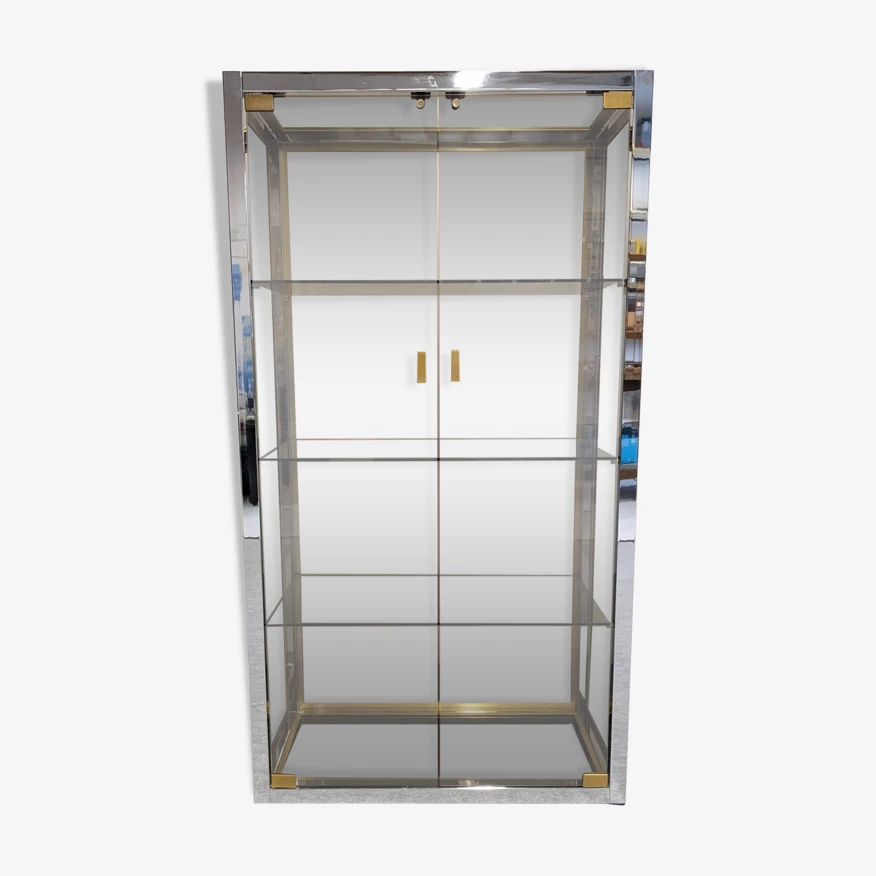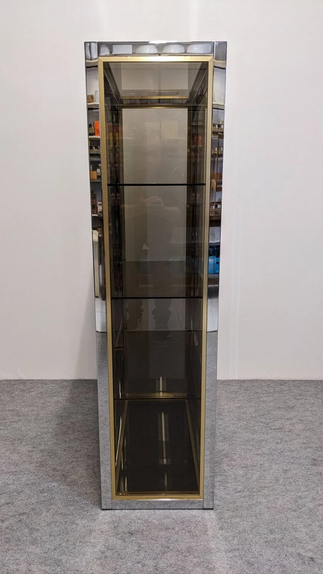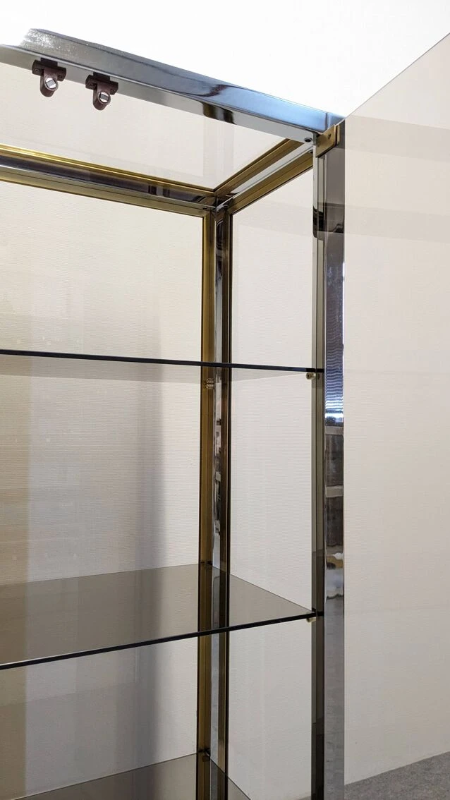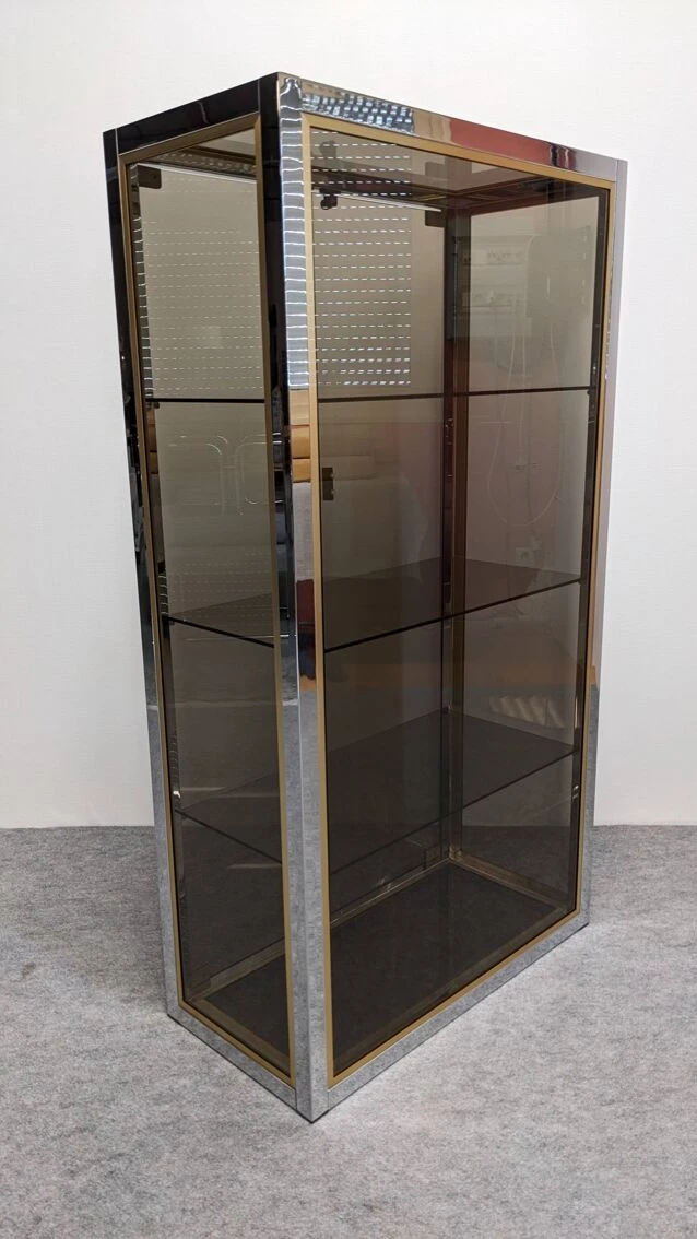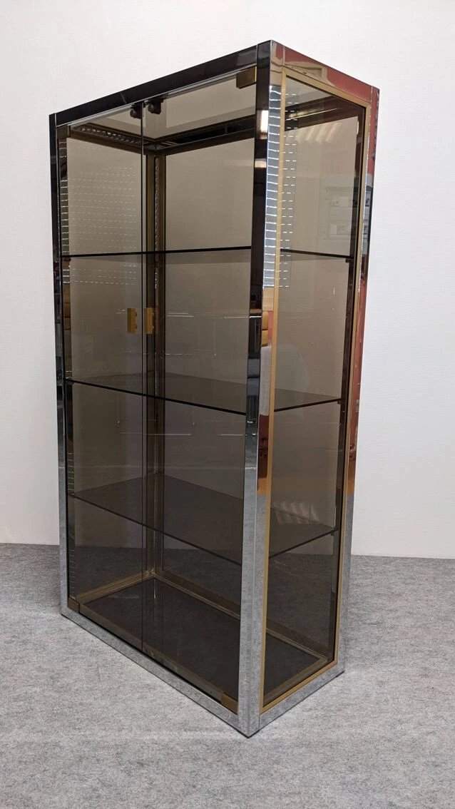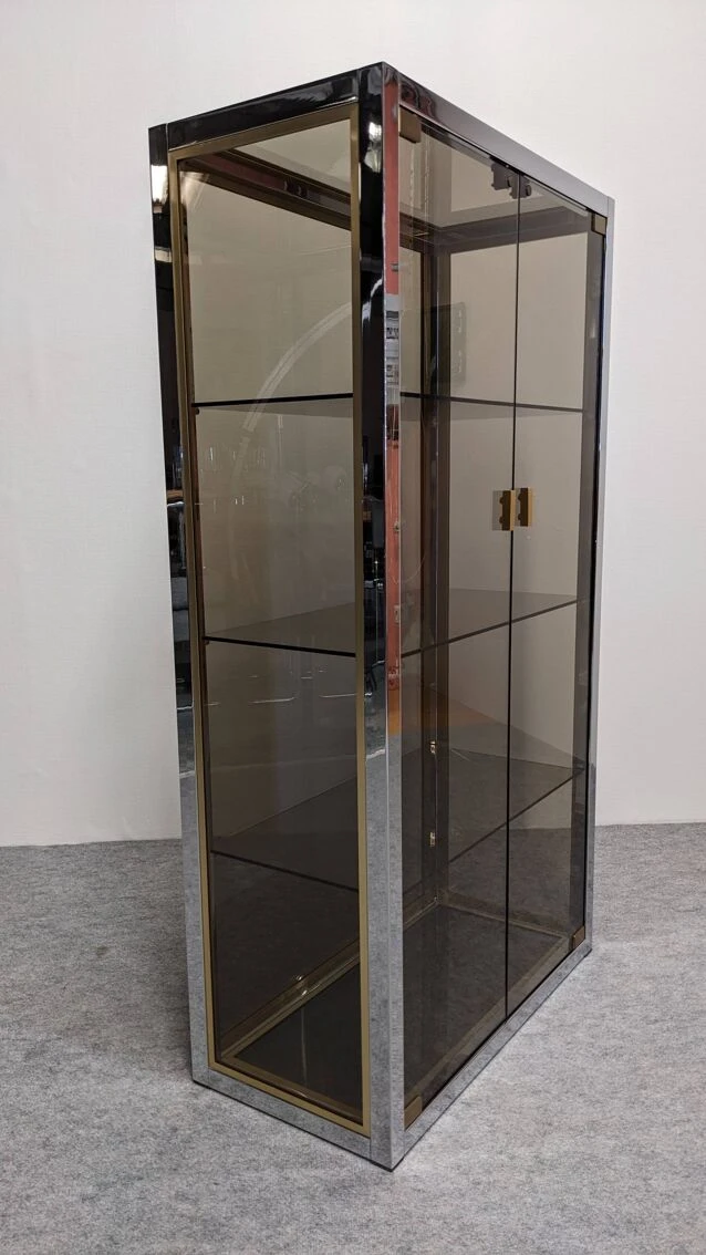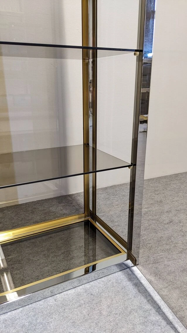Model completely in the hollywood regency style of that era with chrome metal and gilded aluminum structure, entirely glazed with smoked glass, including the bottom, allowing installation in separation of 2 rooms. 2 full height independent doors and 3 removable shelves.