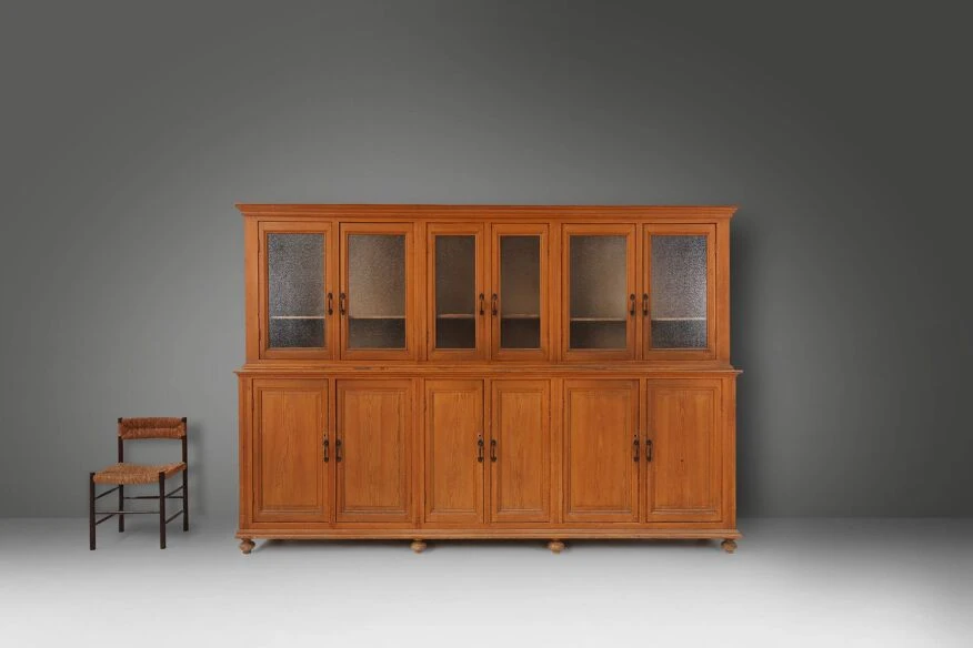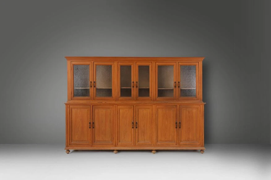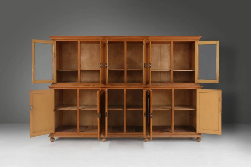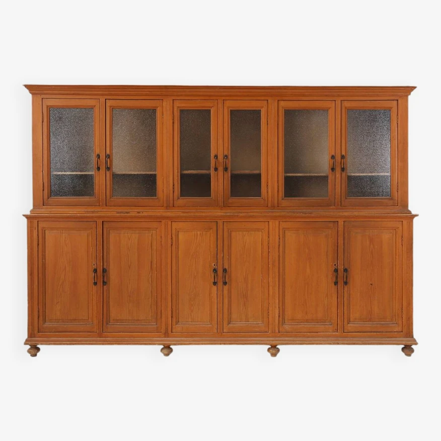 An impressive belgium monastery or display cabinet in pine with 6 wood doors on the bottom and 6 figured glass doors on top.
