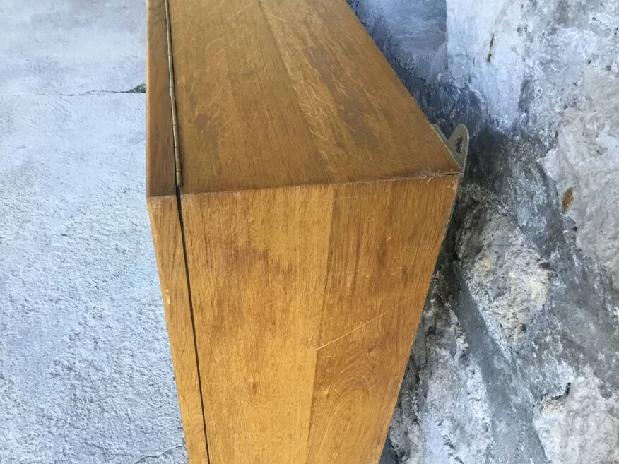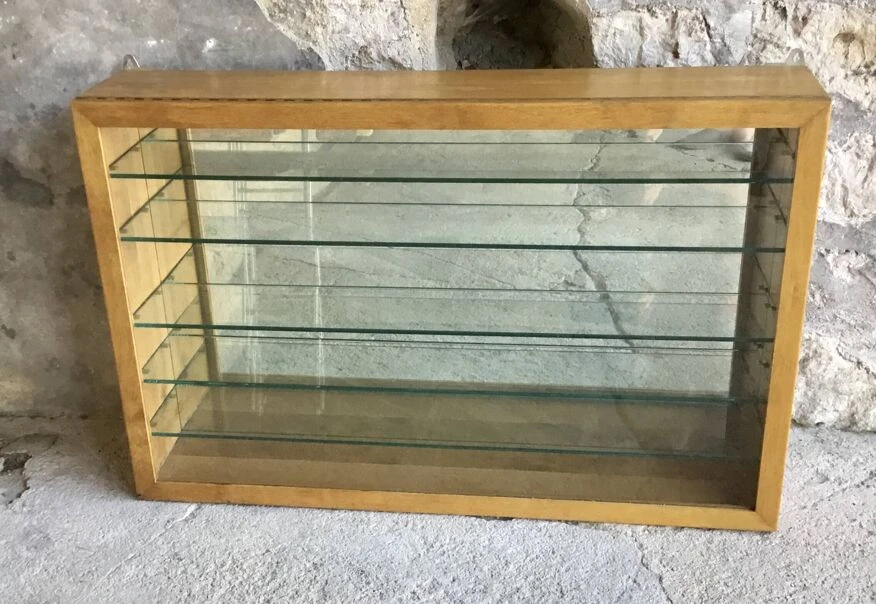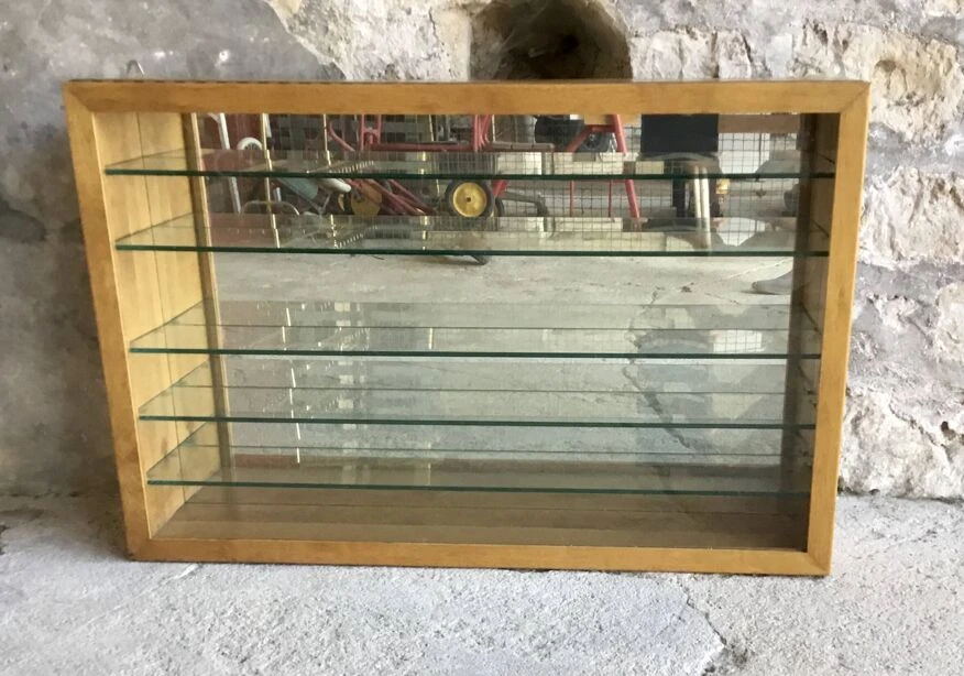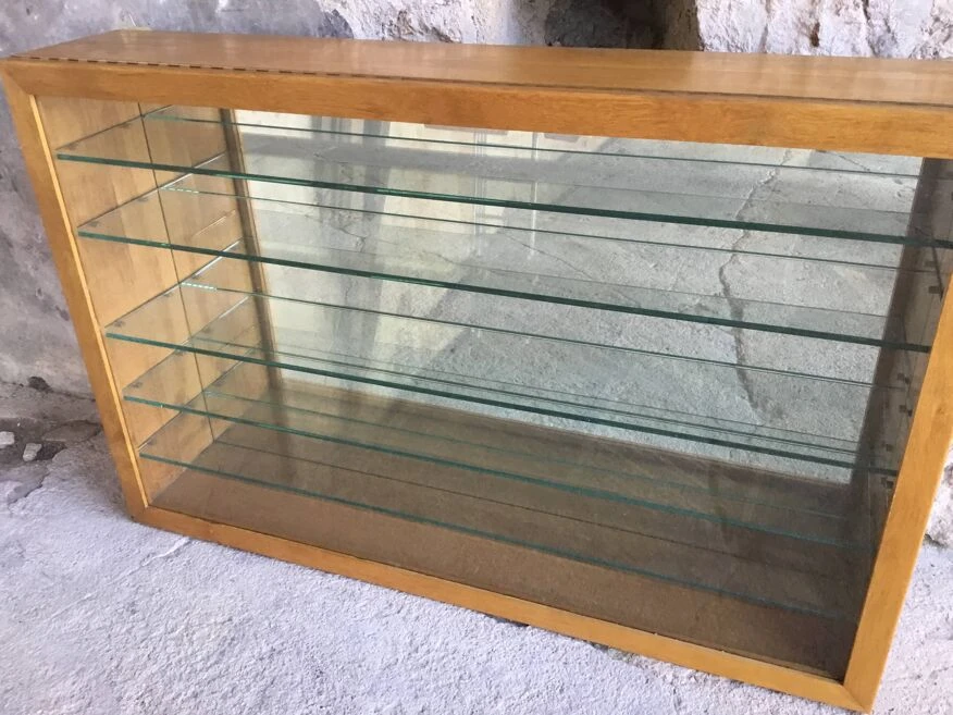 The display case includes 5 glass shelves supported by metal cleats (spacing between the shelves: 10 cm and 15 cm for the shelves located in the center.
