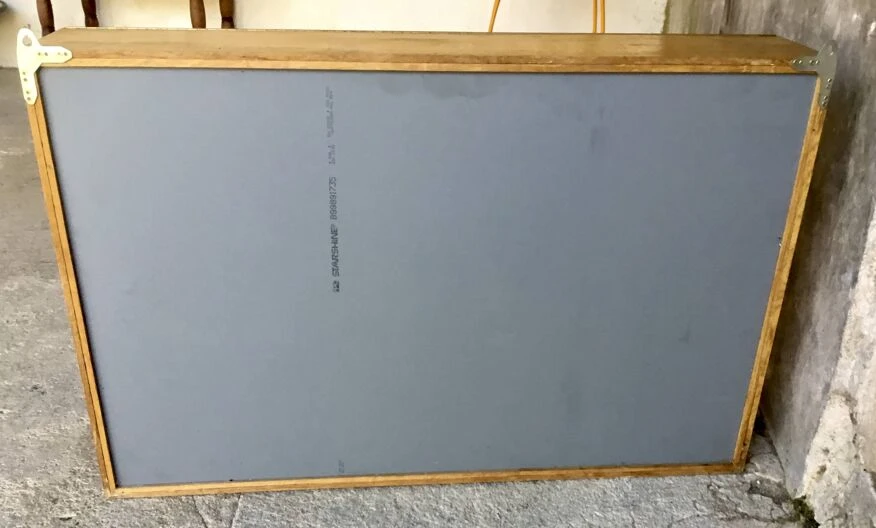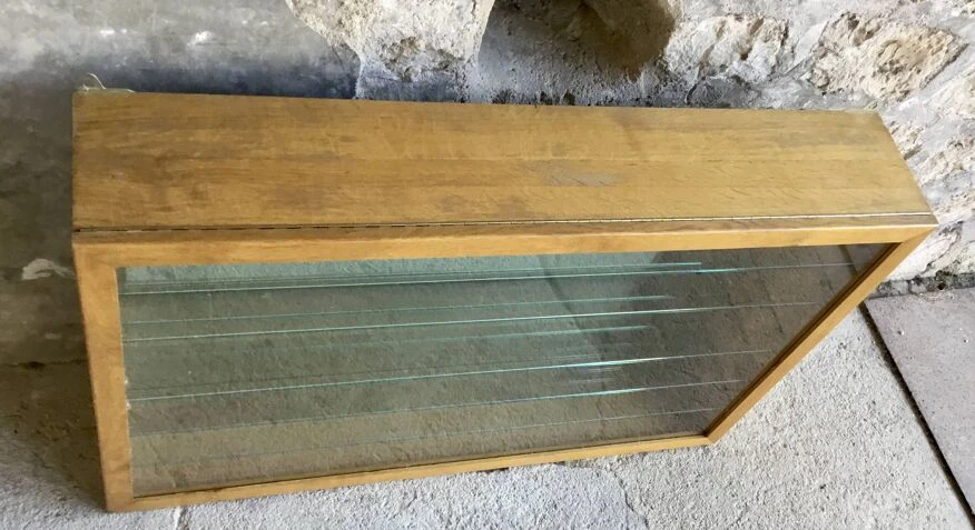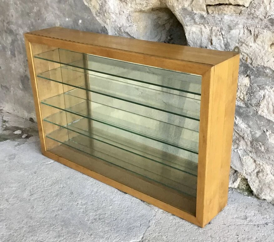 The display case is closed by a glass door which opens from below (hinge visible on the top of the furniture).