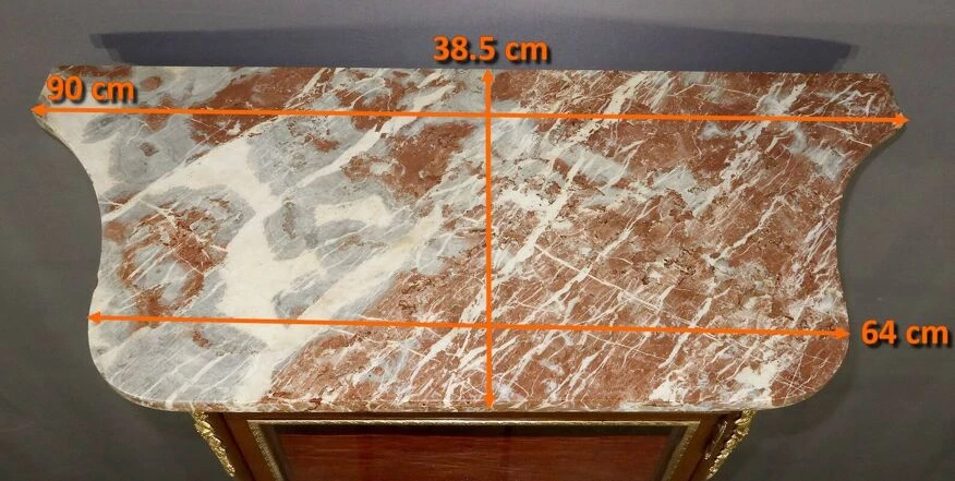 The upper rail of this furniture is decorated with molded strips, a large bronze frieze forming volute flowers and leaves with an engraving in the center representing putti playing in the grass.
