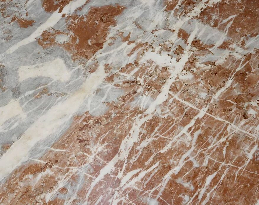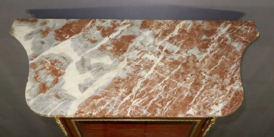 The top is topped with pink pyrenees marble with rounded front corners to match the shape of the piece of furniture.