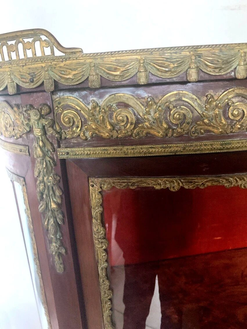Curved napoleon III mahogany display case beautiful chiseled bronze ornamentation rests on four arched legs veined red marble top certis with an openwork brass gallery purple velvet interior good general condition dimension h 140 X l 67 X 33 cm period late 19th century beginning of the 20th century.