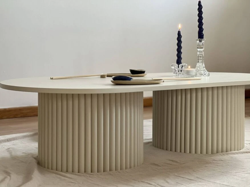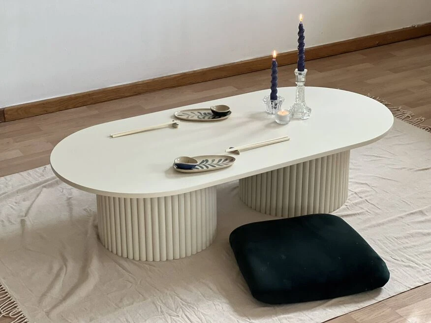 A clean, minimalist coffee table covered with acrylic paint in light beige.