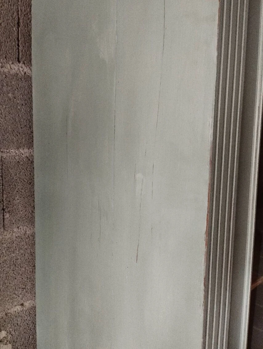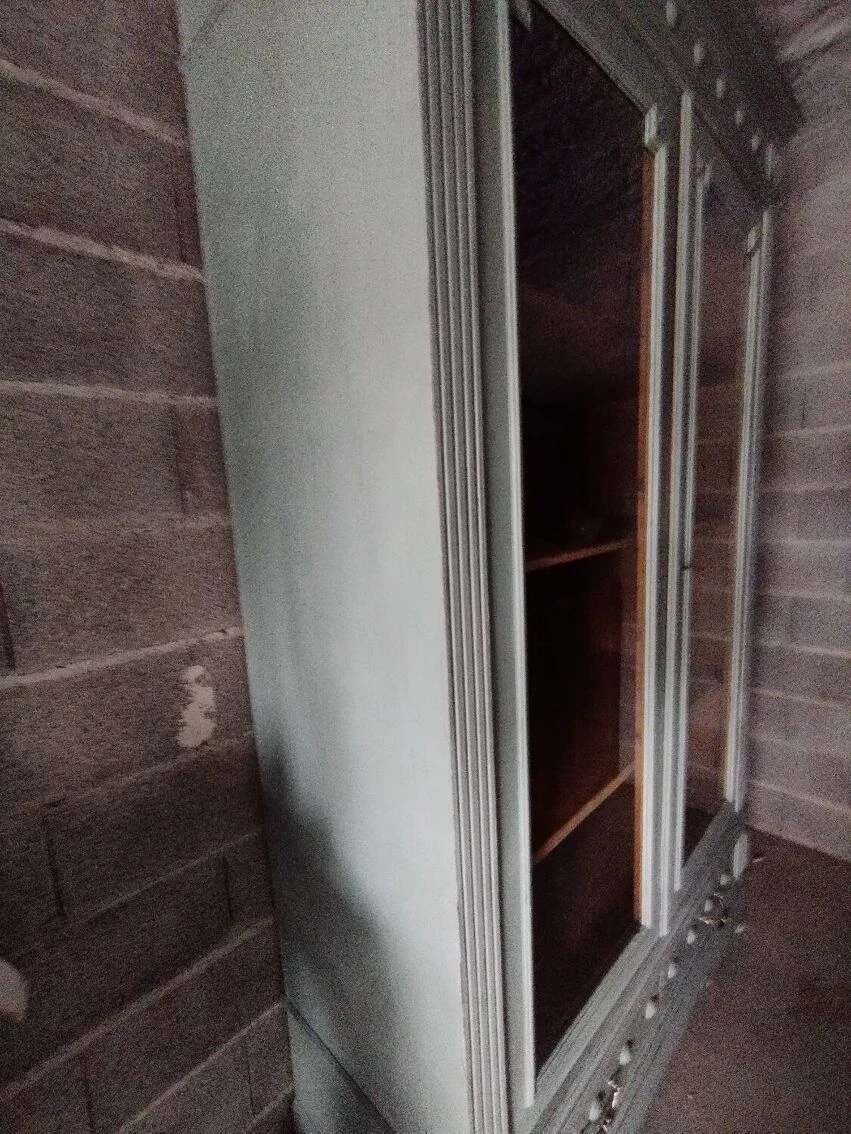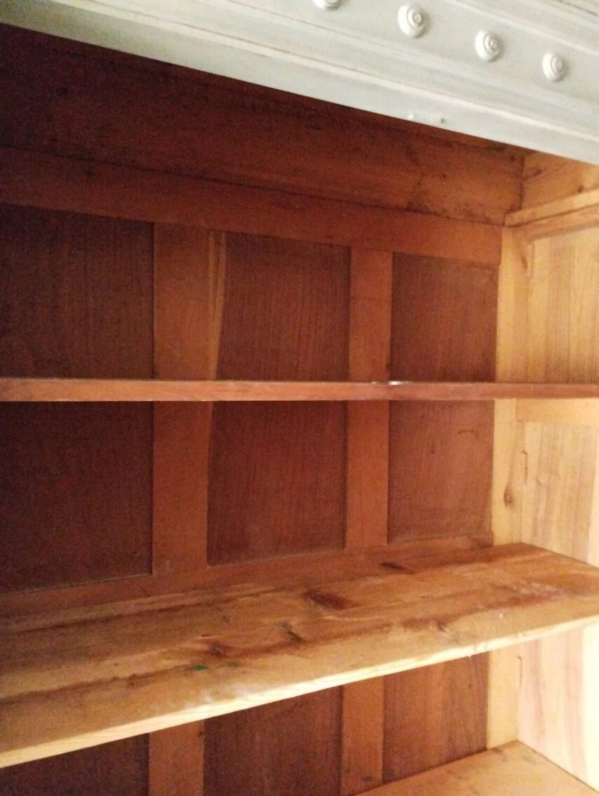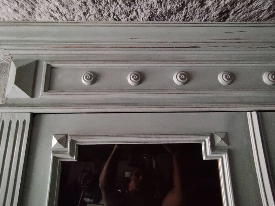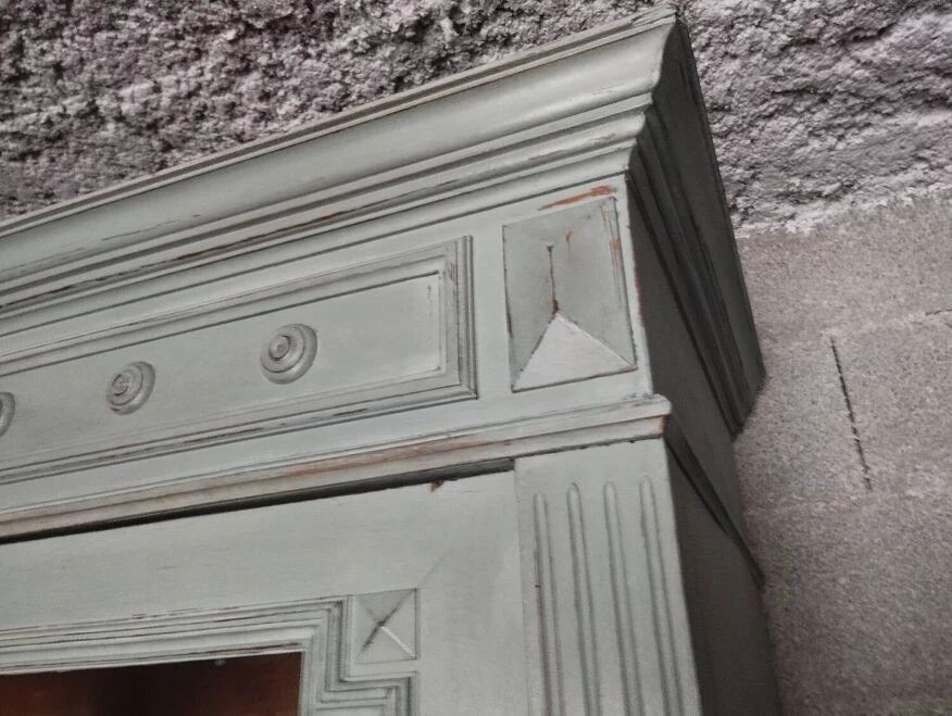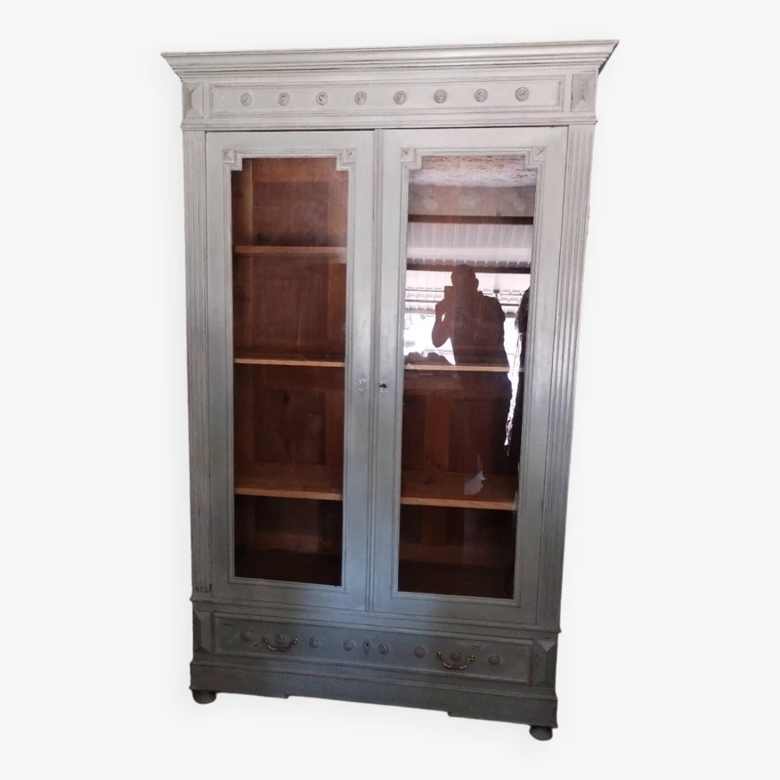 Old bookcase with two glass doors, chalk paint duck egg blue patina. Beautiful state of conservation. Wood interior. A drawer with two brass handles. Dimensions. Height 234 cm. Width 134 cm, cornice level width 142 cm. Depth 50 cm. Cornice level depth 54 cm. Do not hesitate to contact me for any information, thank you.