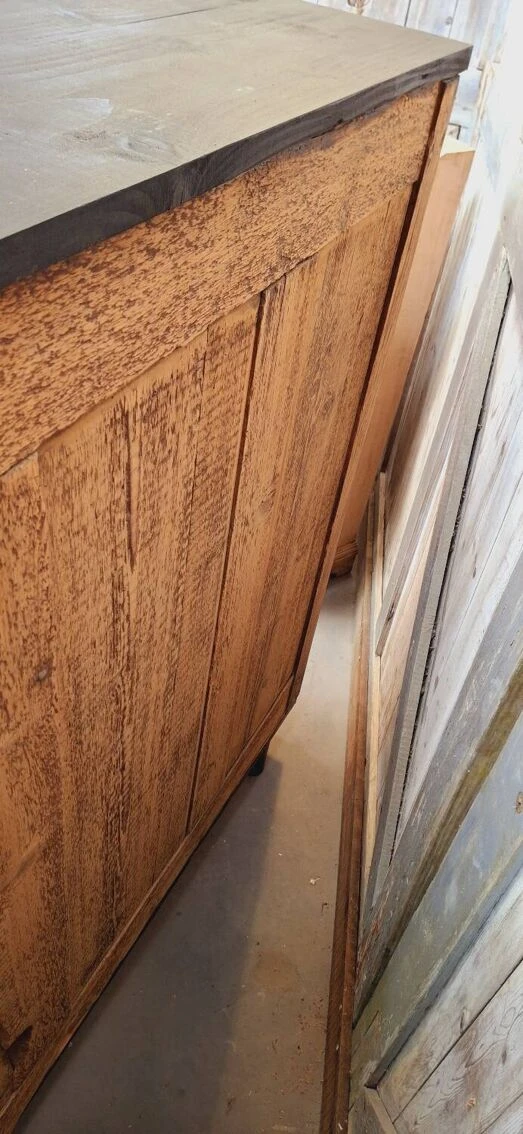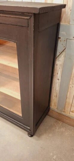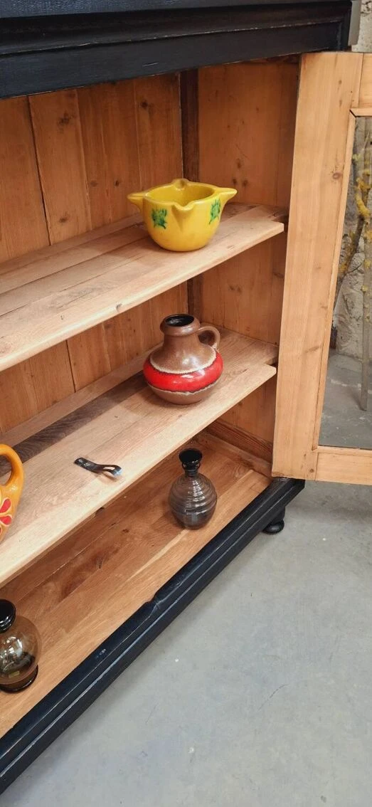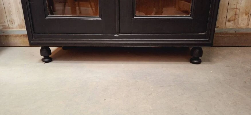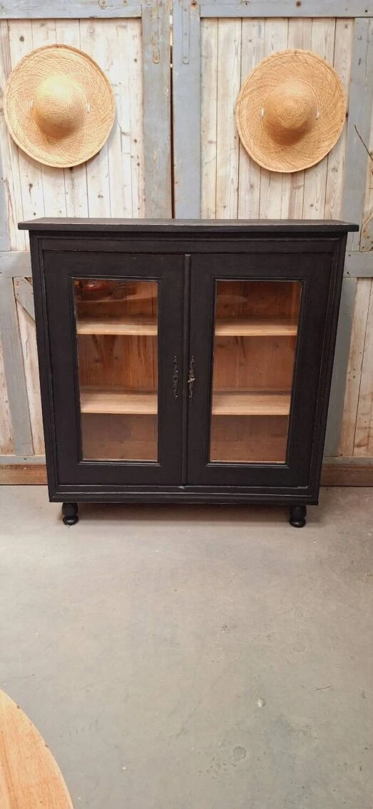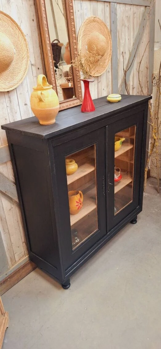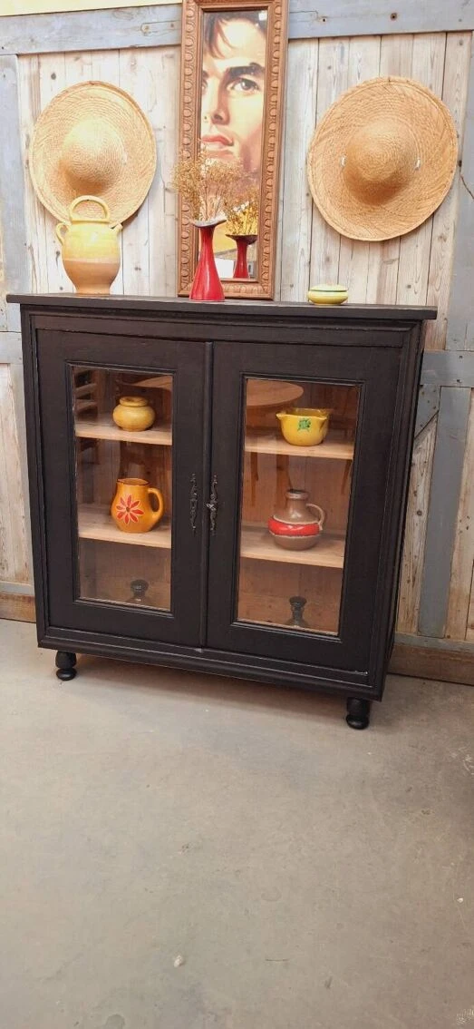 The lock works with its original key, the glazing of the 2 doors is in good condition (no chips or various gaps) showcase completely renovated (cleaning, stripping, sanding, making a satin black patina, replacement of the boards in the upper part above ) it will be ideal in a living room or kitchen.