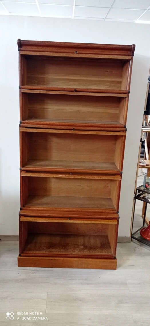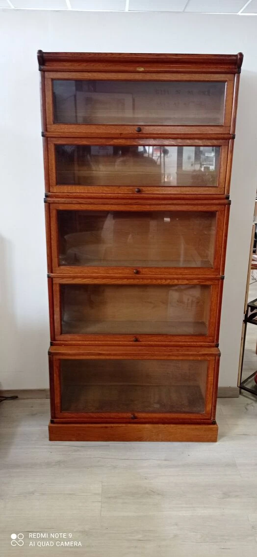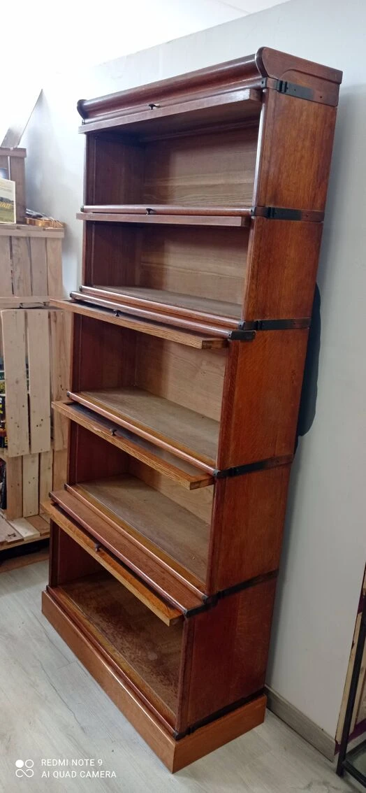 Old English library/showcase in solid oak. It measures 188 cm high, 89 cm wide, 36 cm deep. Consists of 3 parts, 61 cm high for the highest part, 75 cm for the middle part and 52 cm for the bottom part.