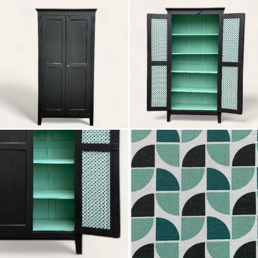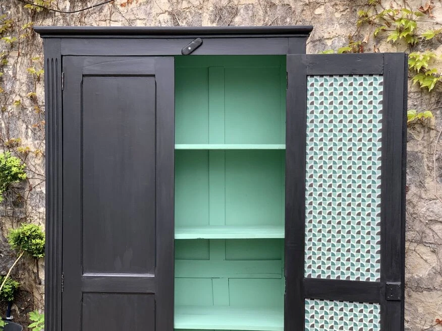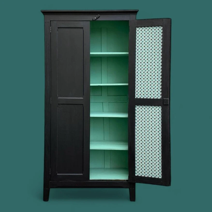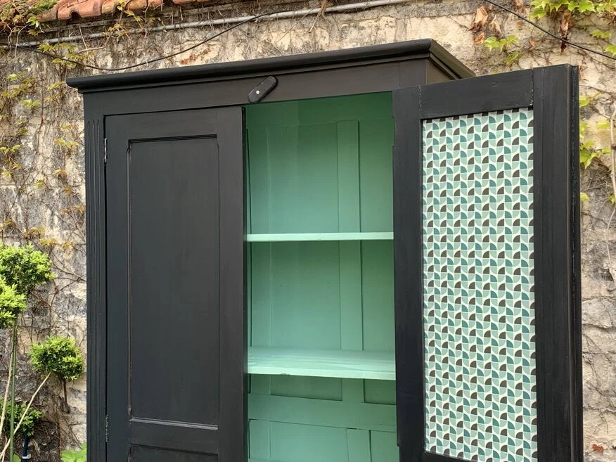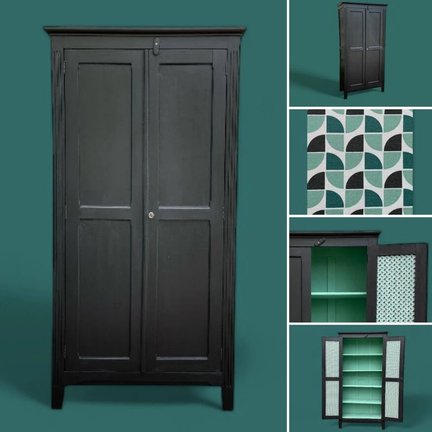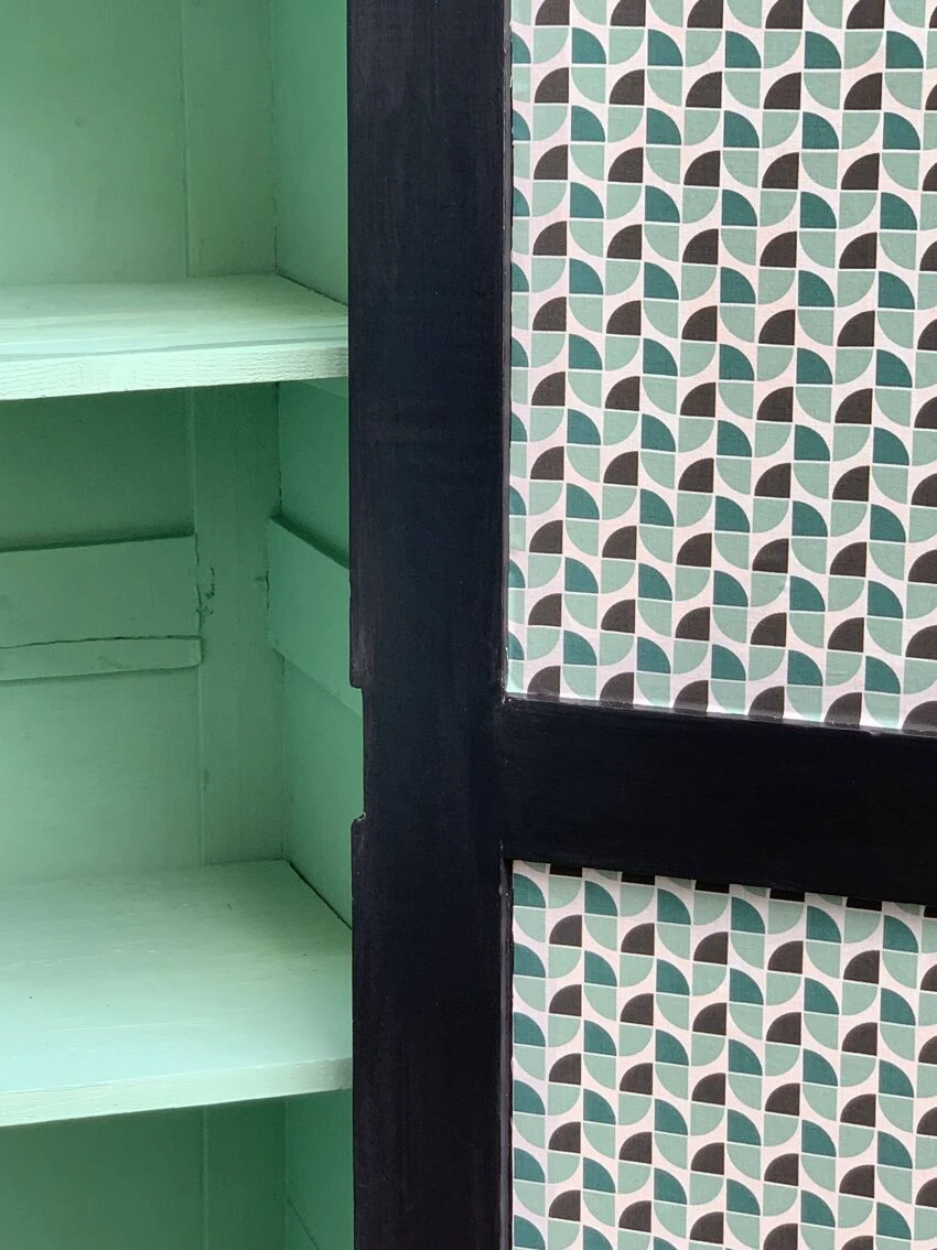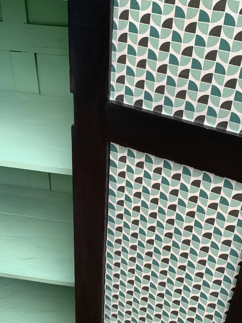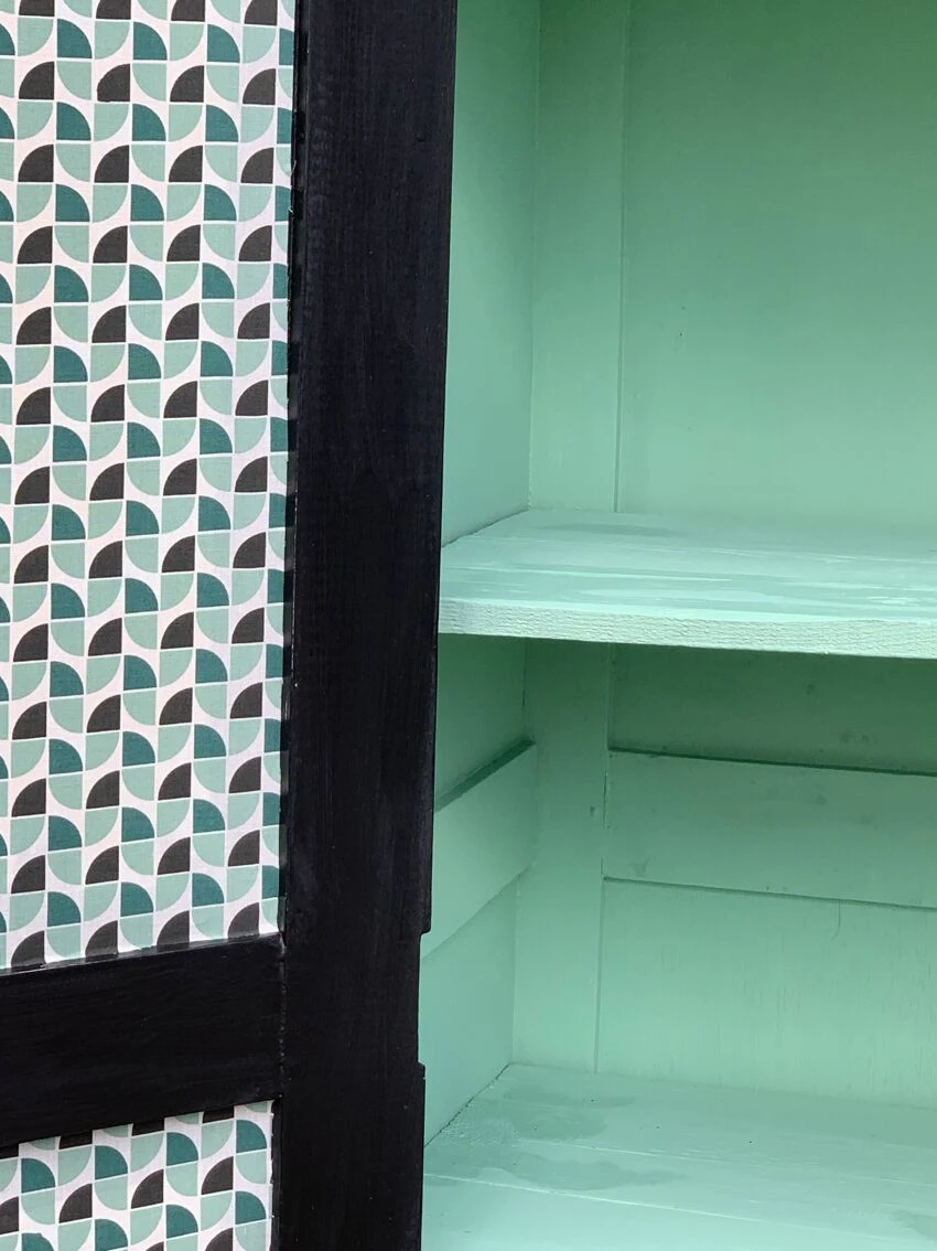 Black paint, arsenic farrow&ball interior, a geometric fabric has been applied.