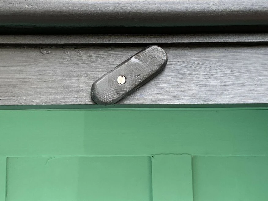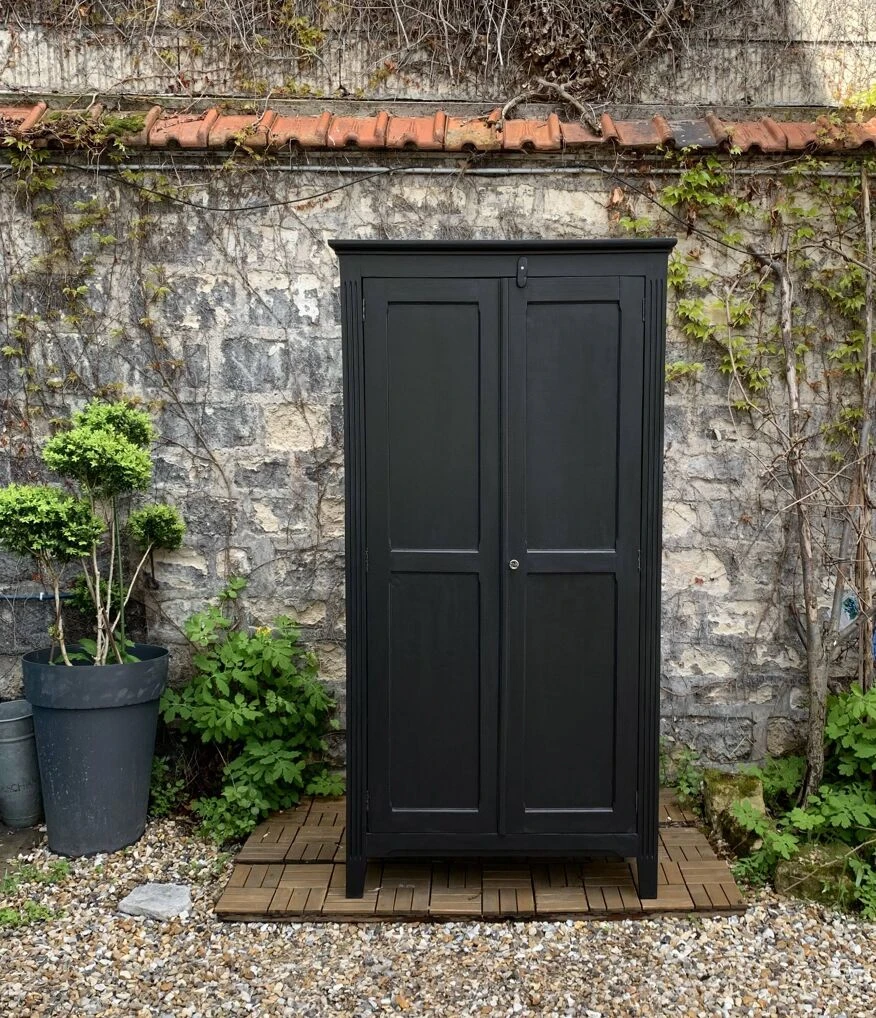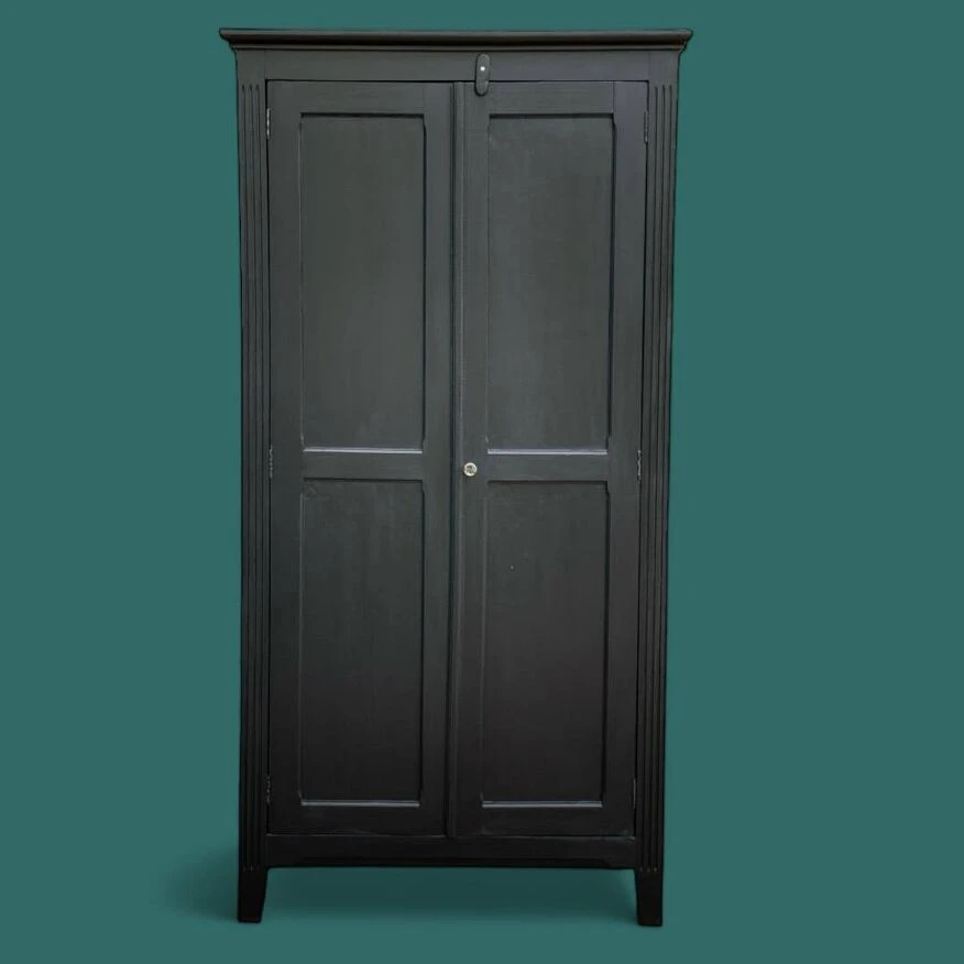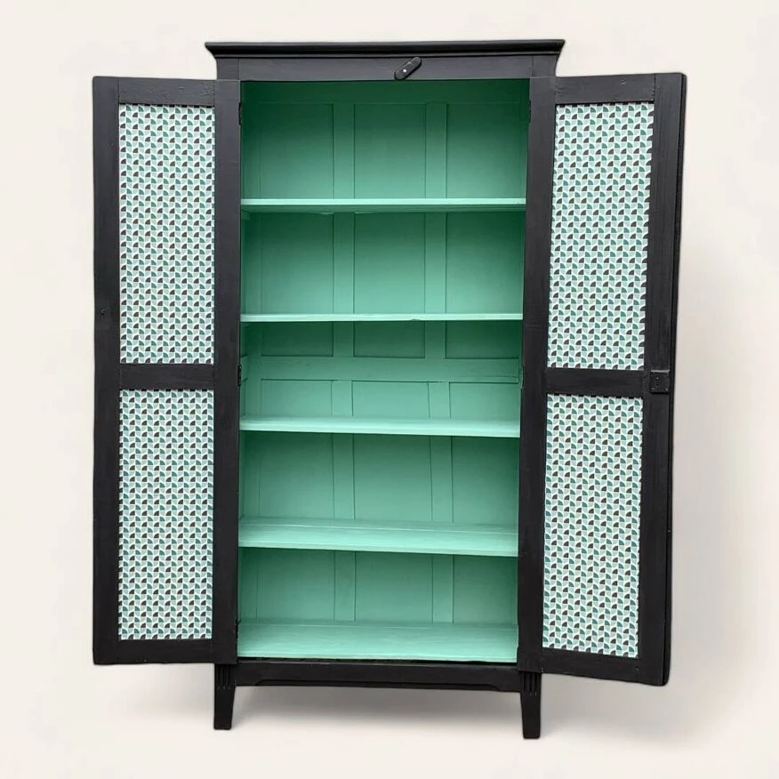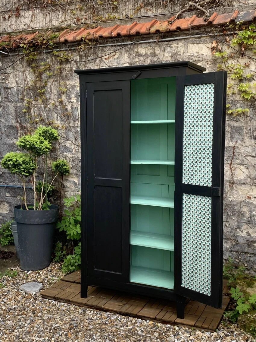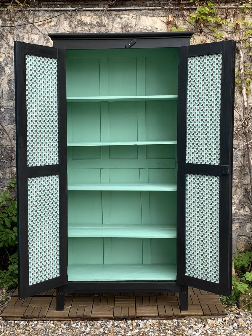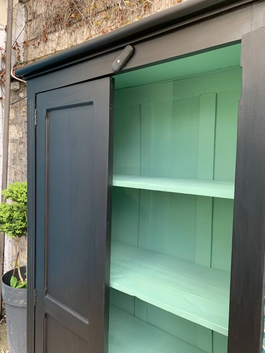 Black paint, arsenic farrow&ball interior, a geometric fabric has been applied.