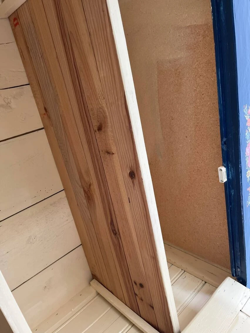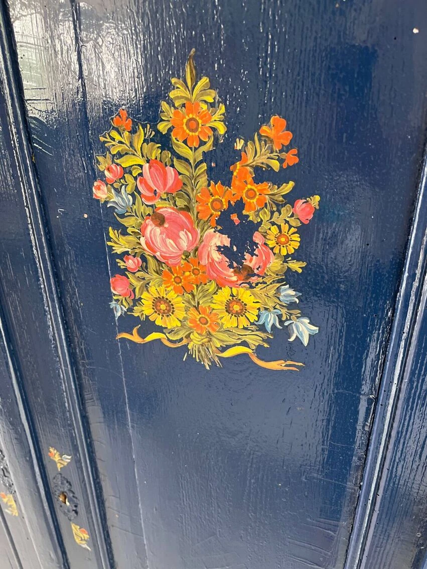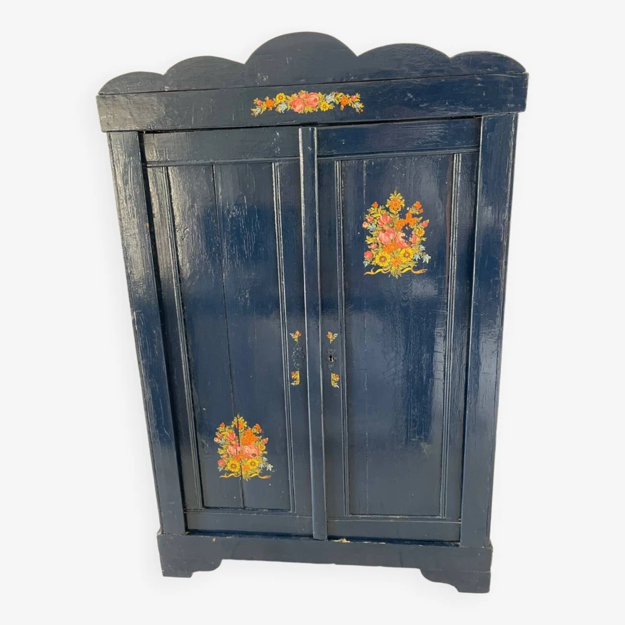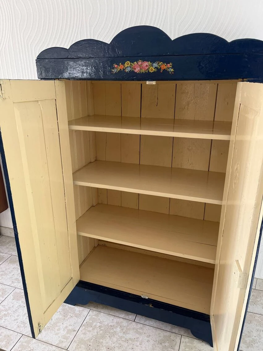 Old parisian wardrobe comprising 3 shelves made up of boards to assemble (numbered) 2 doors which close with magnets painted in midnight blue on the outside and cream on the inside with floral motifs (glued which I think can be removed) very robust and heavy!