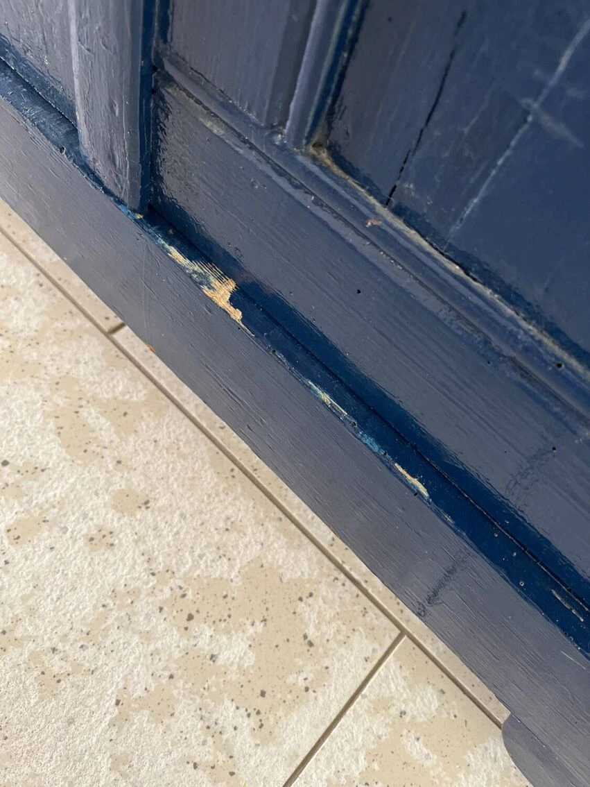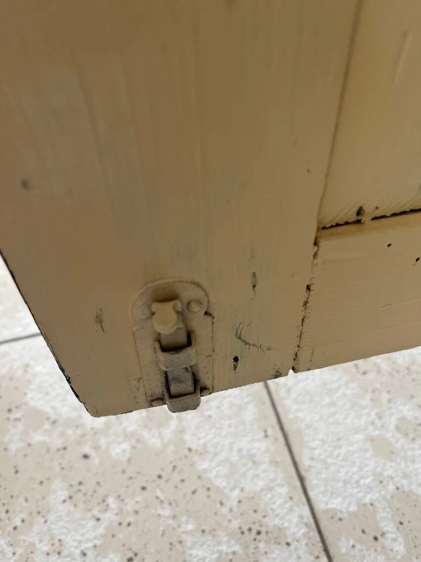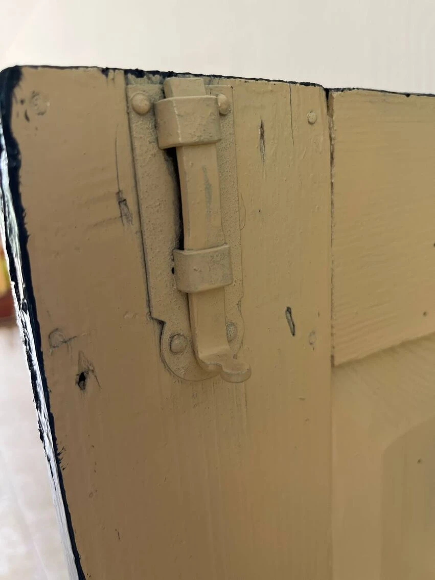 Old parisian wardrobe comprising 3 shelves made up of boards to assemble (numbered) 2 doors which close with magnets painted in midnight blue on the outside and cream on the inside with floral motifs (glued which I think can be removed) very robust and heavy!