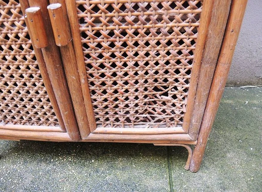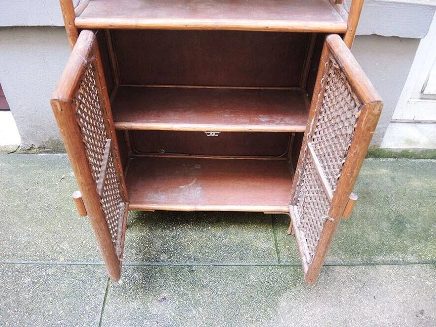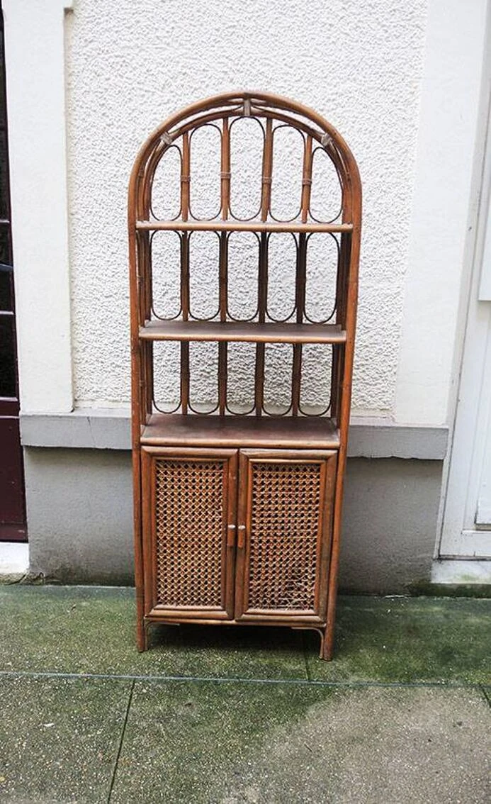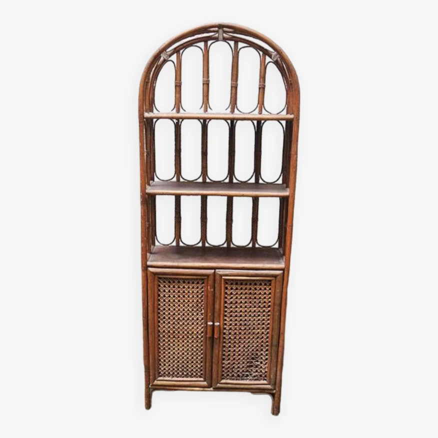 Superb vintage rattan bookcase with a rounded shape, composed of 3 shelves as well as a niche closed by two caned doors.