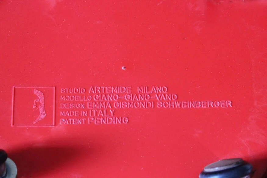 Superb (and rare in pairs!!) pair of red bedside tables, “giano vano” model designed in 1973 by the italian architect and designer emma schweinberger gismondi and produced by artemide.