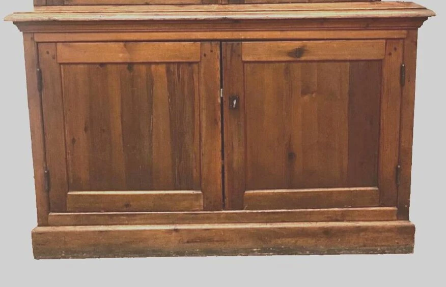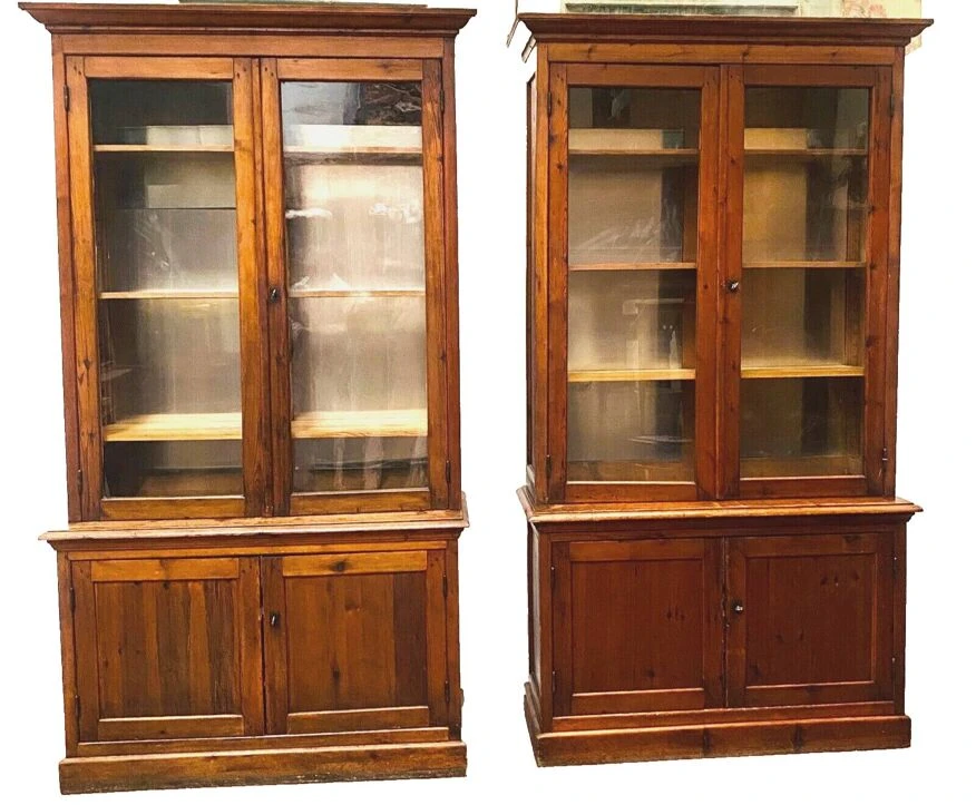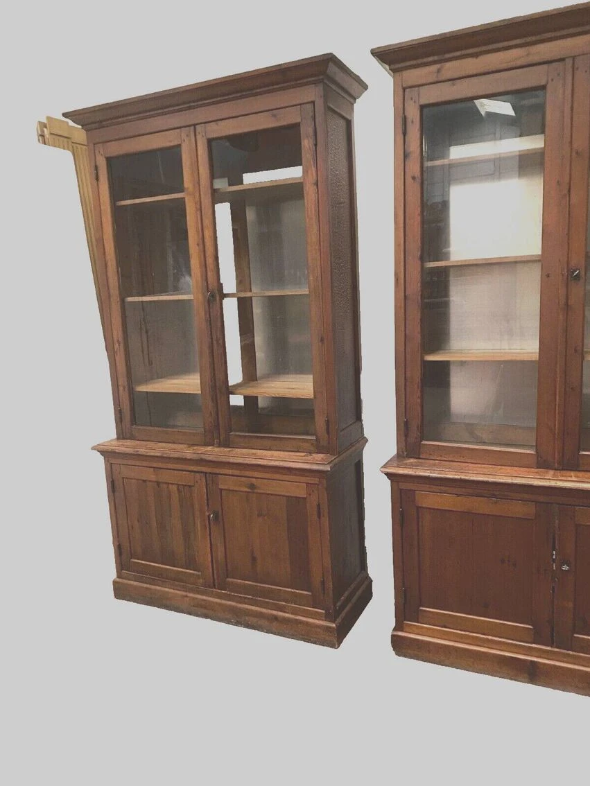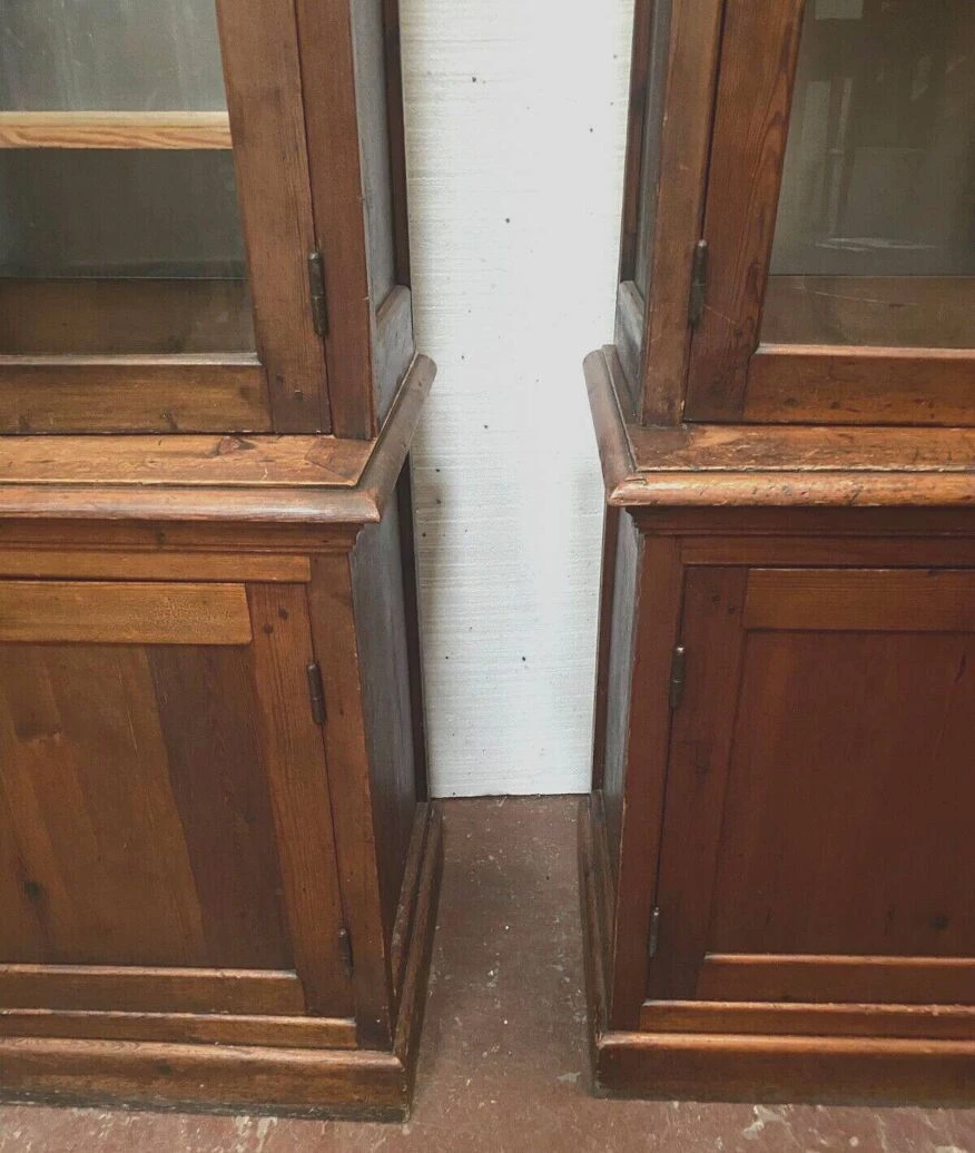 Pair of display cases in two rustic style bodies manufactured in solid fir on the front two glass doors and two lower framed doors storage shelves in both parts good condition dimension h 248 X l 133 X 52 cm upper part h 162 X l 125 X 38cm.