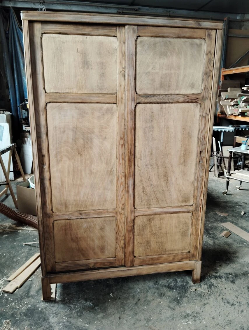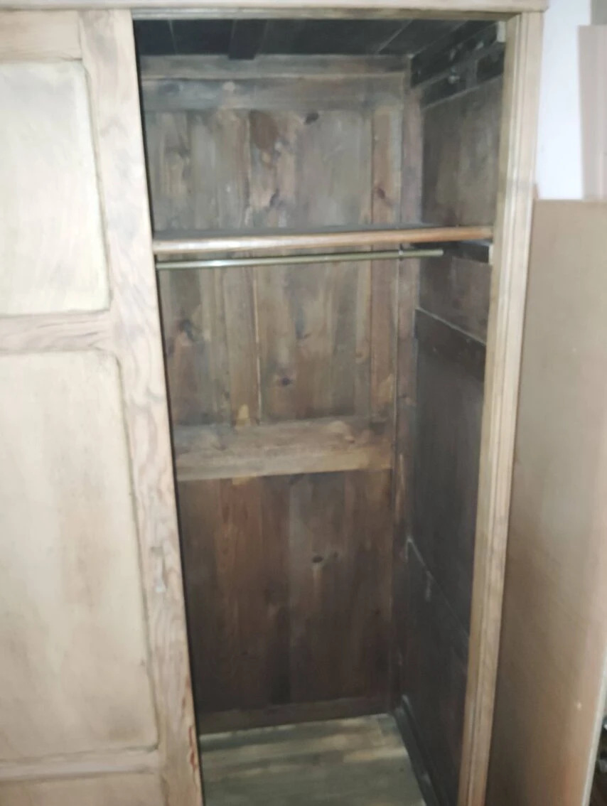 Here is a charming Parisian wardrobe with proportions that will go very well in an entrance or in a nook in which it will undoubtedly be useful. Inside, there is 1 shelf and a rod. Easily dismantled using 4 large screws (will be delivered disassembled) Total height 190cm, width 122cm, depth 56 cm. It was originally very dark, it was then sanded and then colorless varnished, taking care to keep its marks of time. Its wood has been worked a little, is not at all pitted and. Its doors slide well. Be careful, this piece of furniture has a soul!