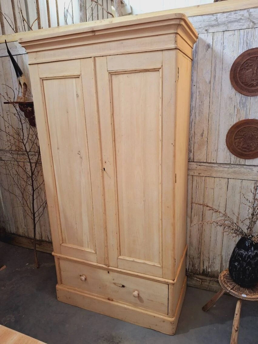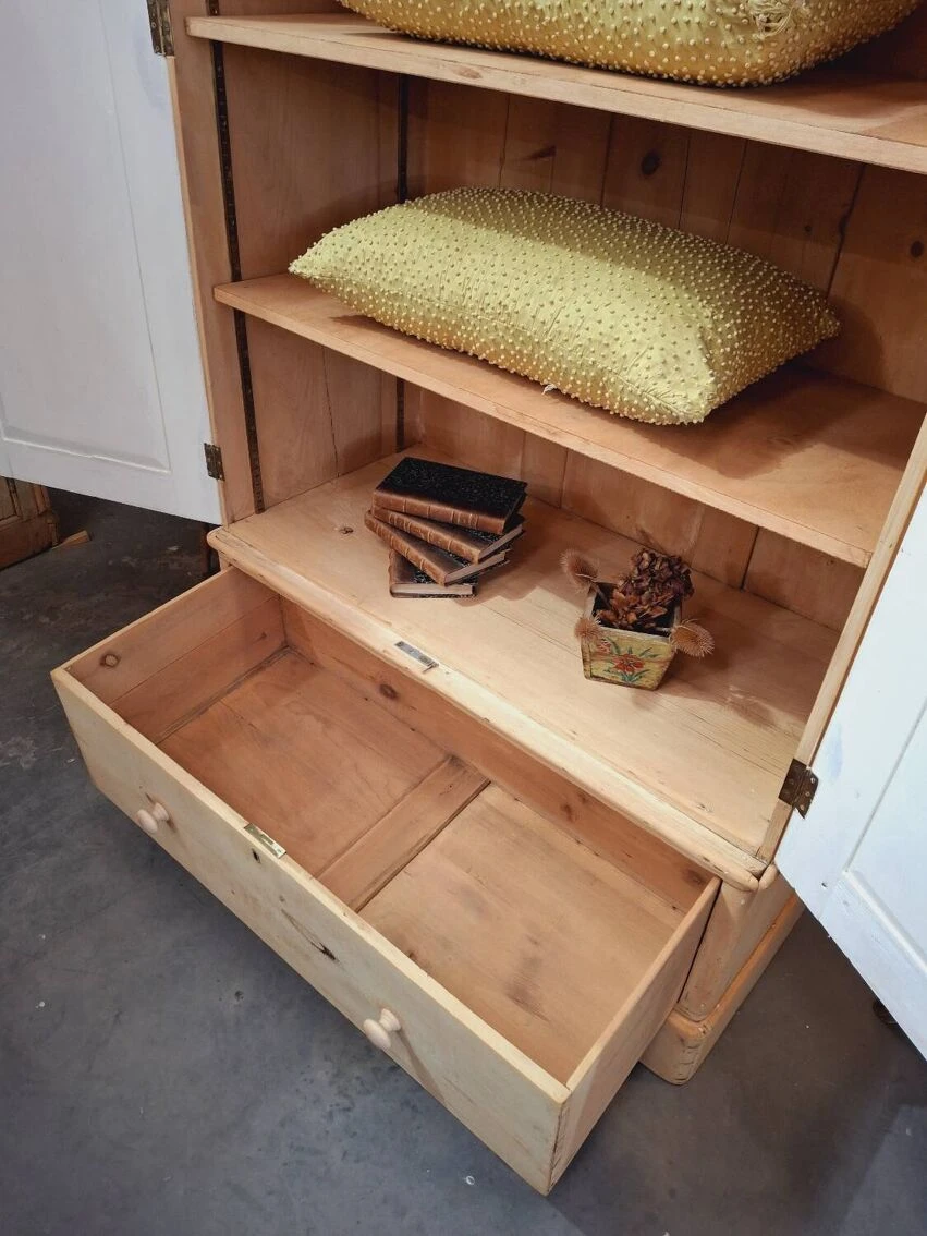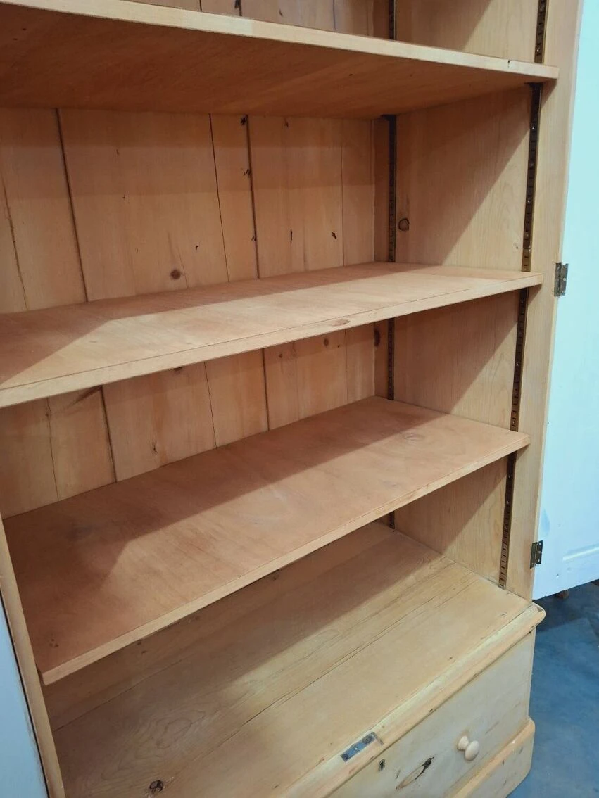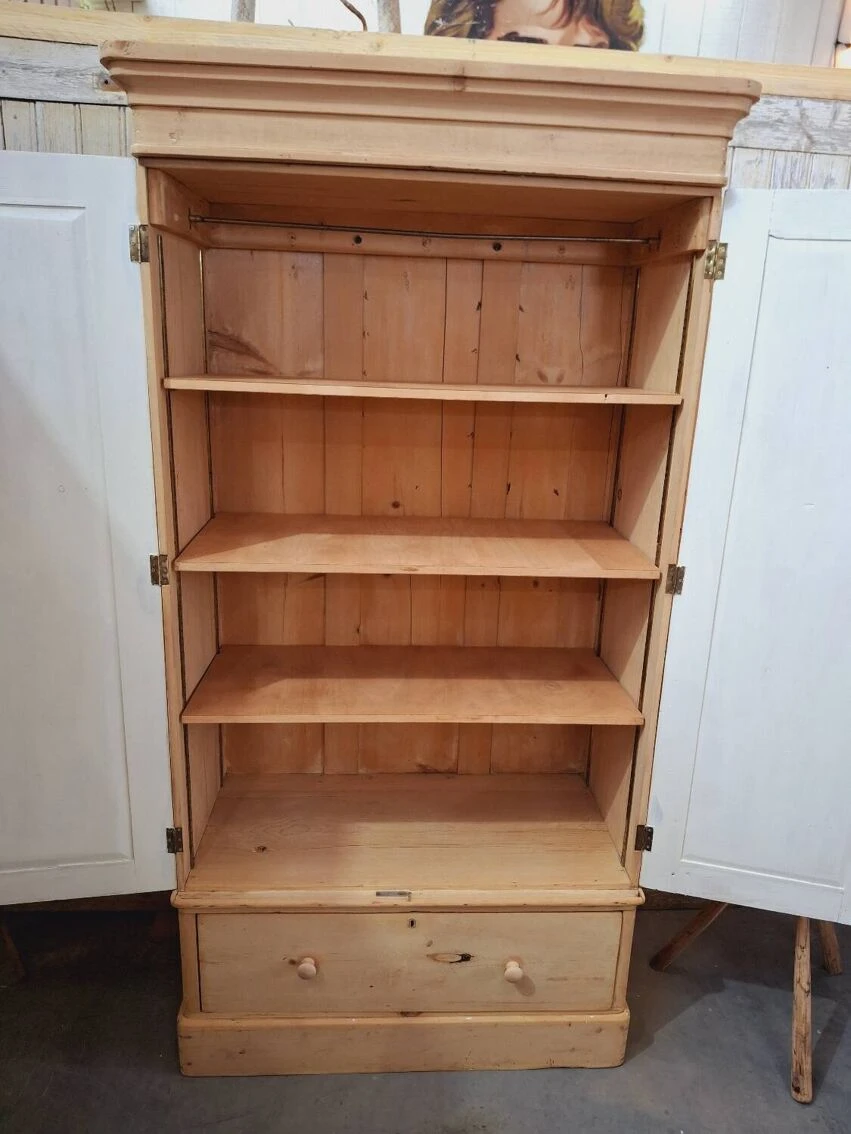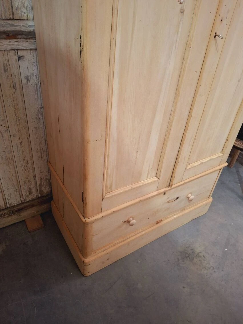 Old English-style pine cabinet dating from the 70s. Overall good condition, normal signs of use for its age. Completely renovated (cleaning, stripping, sanding, treatment against xylophages, restoration of the interior of the doors, change of the lock and the closing latch of the left door, white painting on the 2 interior doors) The structure is the feet are very stable. It consists of 2 doors revealing 3 modular shelves for various storage areas, possibility of installing a wardrobe in place of the shelves, a rod is already present. In the lower part there is a large, very good sliding storage drawer. The cabinet is left raw after sanding to give it a vintage look that is currently very trendy. It will be ideal in a bedroom or living room. Dimensions of the old English style pine cabinet. Width 1.05 m. Height 1.98 m. Depth 48 cm. Cabinet interior (3 modular shelves) Width 93.5 cm. Height 1.36 m. Depth 42 cm. Drawer. Width 87.5 cm. Height 23.5 cm. Depth 38 cm.