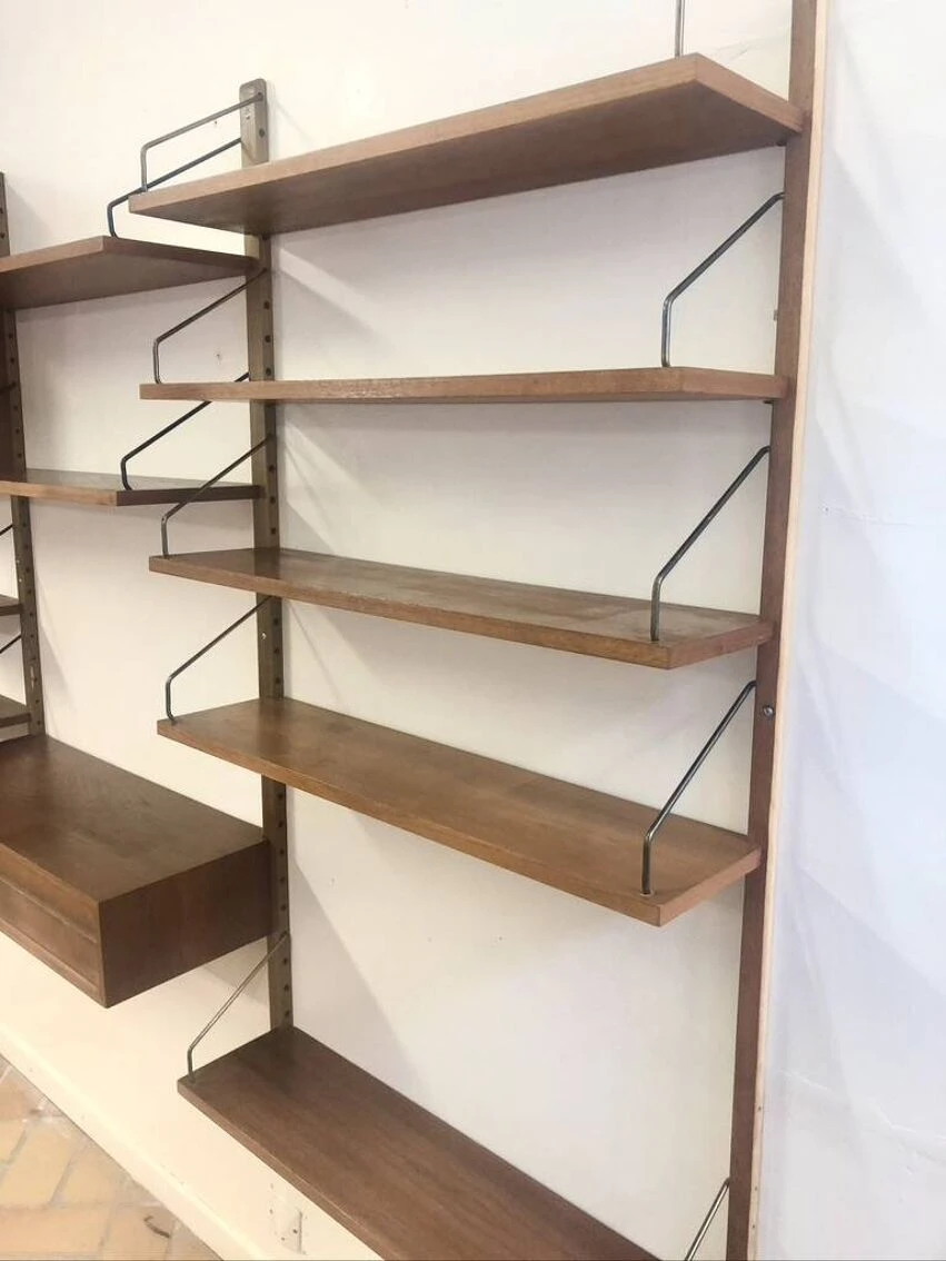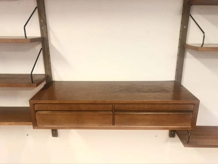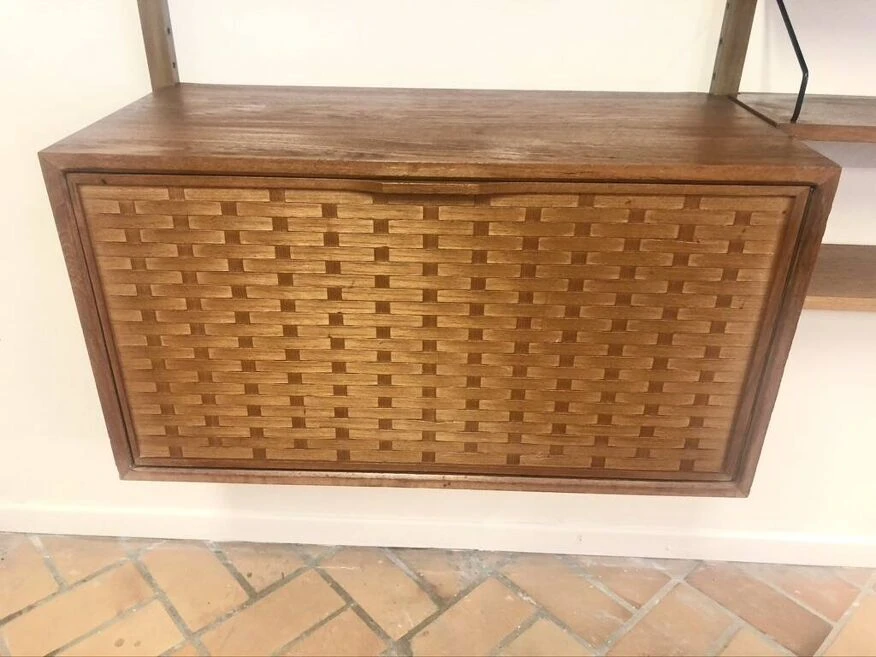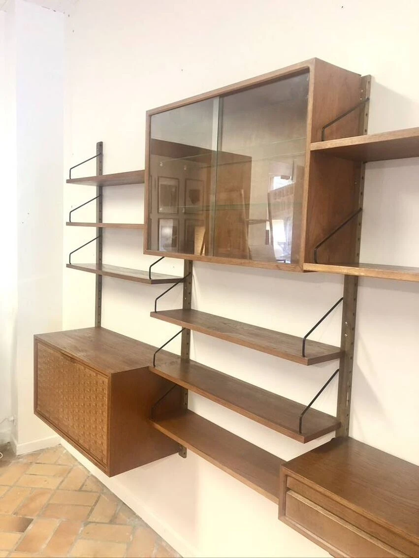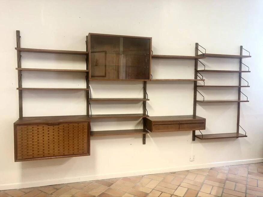 Large wall unit “royal system” model designed by the designer for cadovius for cado in the 60s. Teak elements, metal supports. This bookcase is modular and can be arranged according to your wishes. The set consisting of 4 bays includes: 5 wooden structures – 148 cm. 13 shelves – 80 x 20 cm. 1 box with 2 drawers – 80 x 30 x 16 cm. 1 glass box with 2 glass shelves – 80 x 24 x 54.5 cm. 1 wooden box with woven front -80 x 43 x 36 cm. Total length 320 cm. Good condition, some imperfections consistent with age and use (see photo).