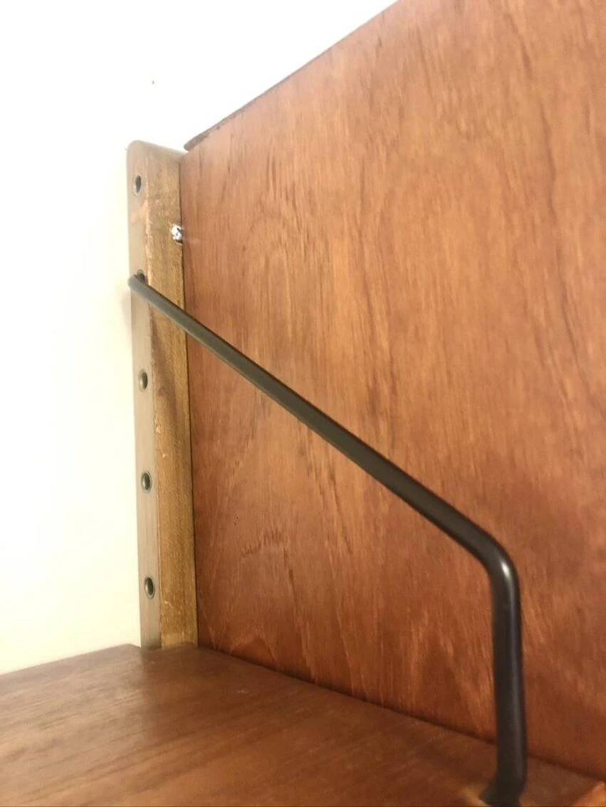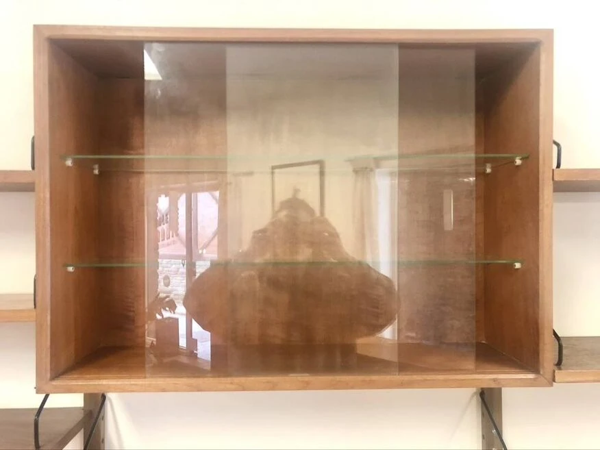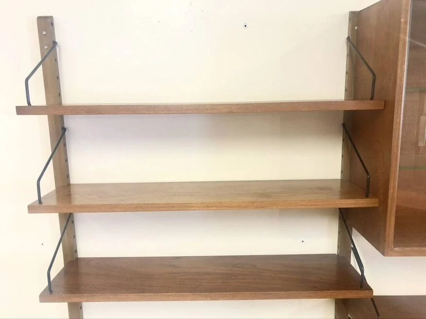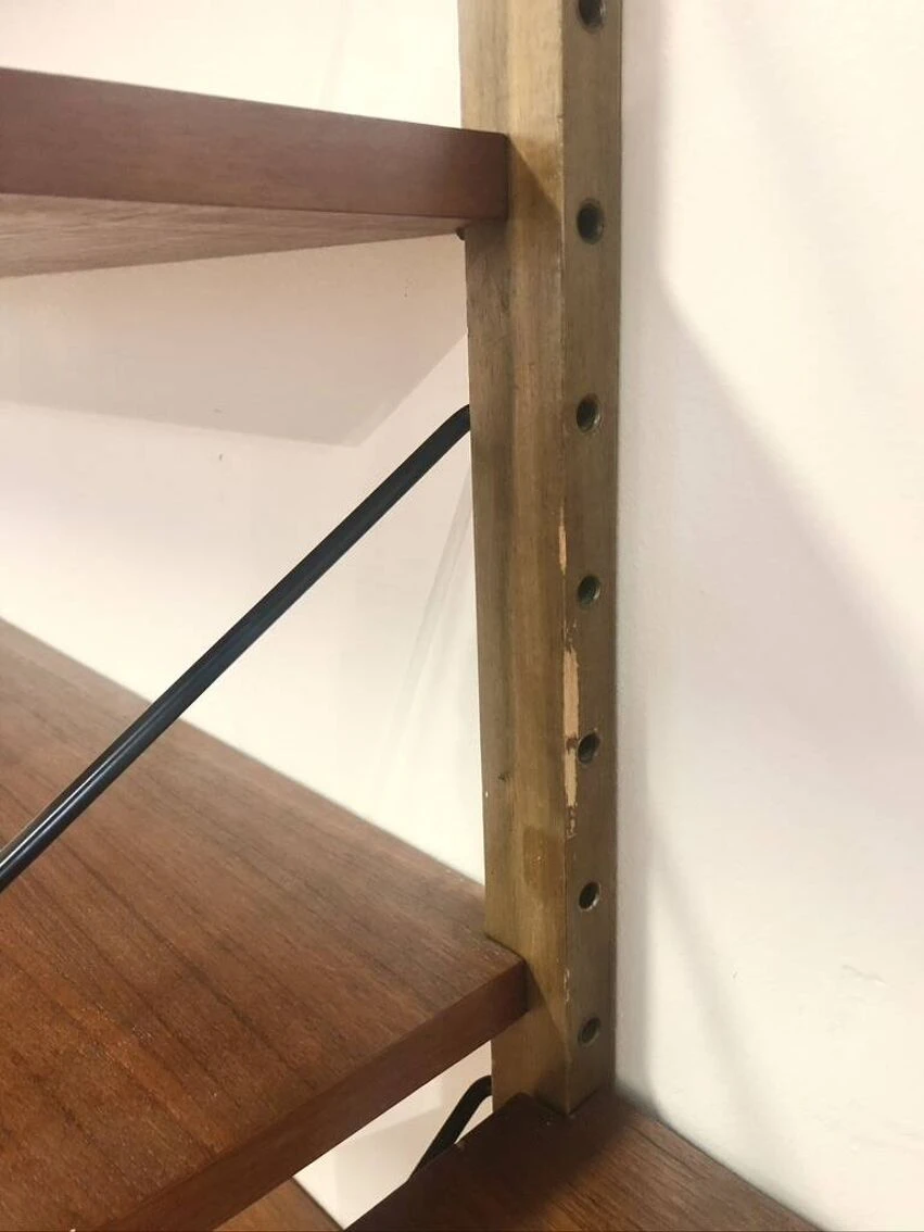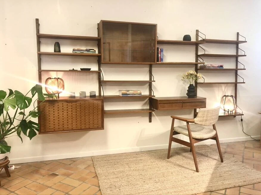 Large wall unit “royal system” model designed by the designer for cadovius for cado in the 60s. Teak elements, metal supports. This bookcase is modular and can be arranged according to your wishes. The set consisting of 4 bays includes: 5 wooden structures – 148 cm. 13 shelves – 80 x 20 cm. 1 box with 2 drawers – 80 x 30 x 16 cm. 1 glass box with 2 glass shelves – 80 x 24 x 54.5 cm. 1 wooden box with woven front -80 x 43 x 36 cm. Total length 320 cm. Good condition, some imperfections consistent with age and use (see photo).