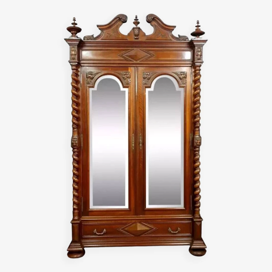 Renaissance library cabinet for a hunting lodge in solid walnut front opening with 2 glazed and paneled leaves and a drawer decorated with twisted columns and various sculptures loaf feet on low cornice, 1850 period circa.