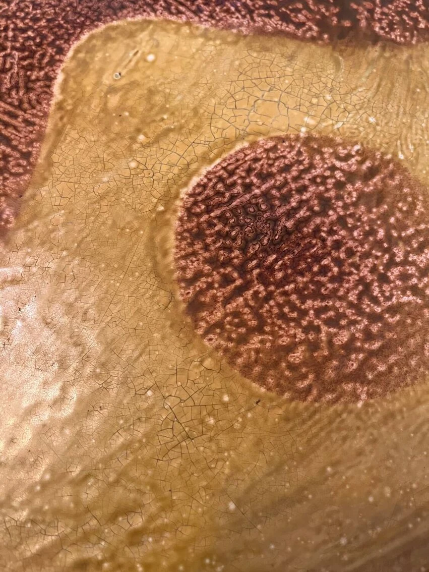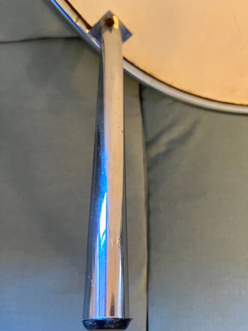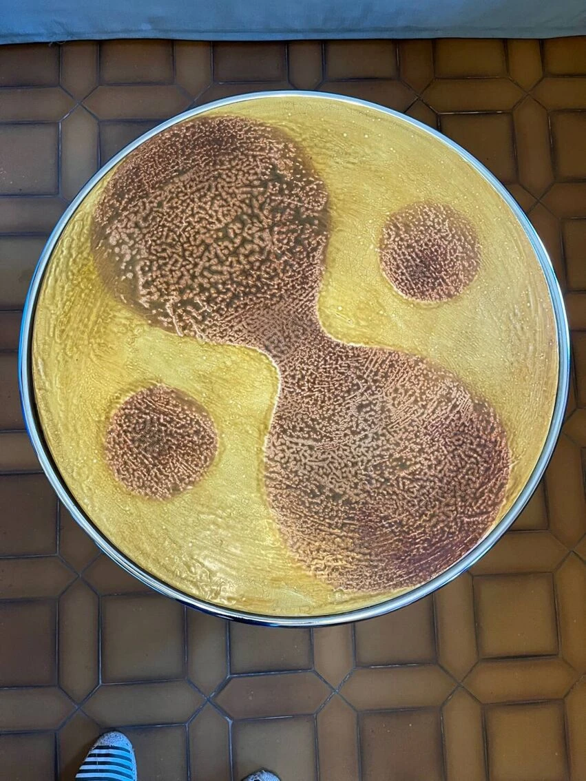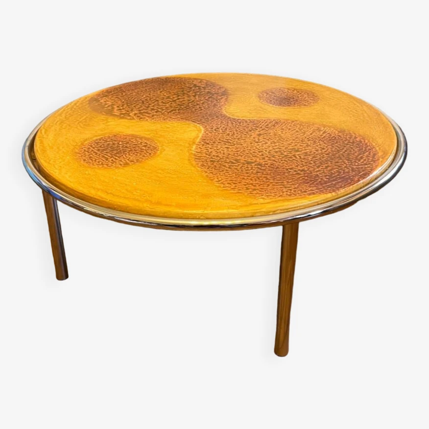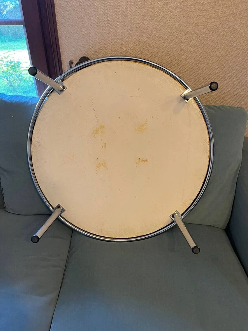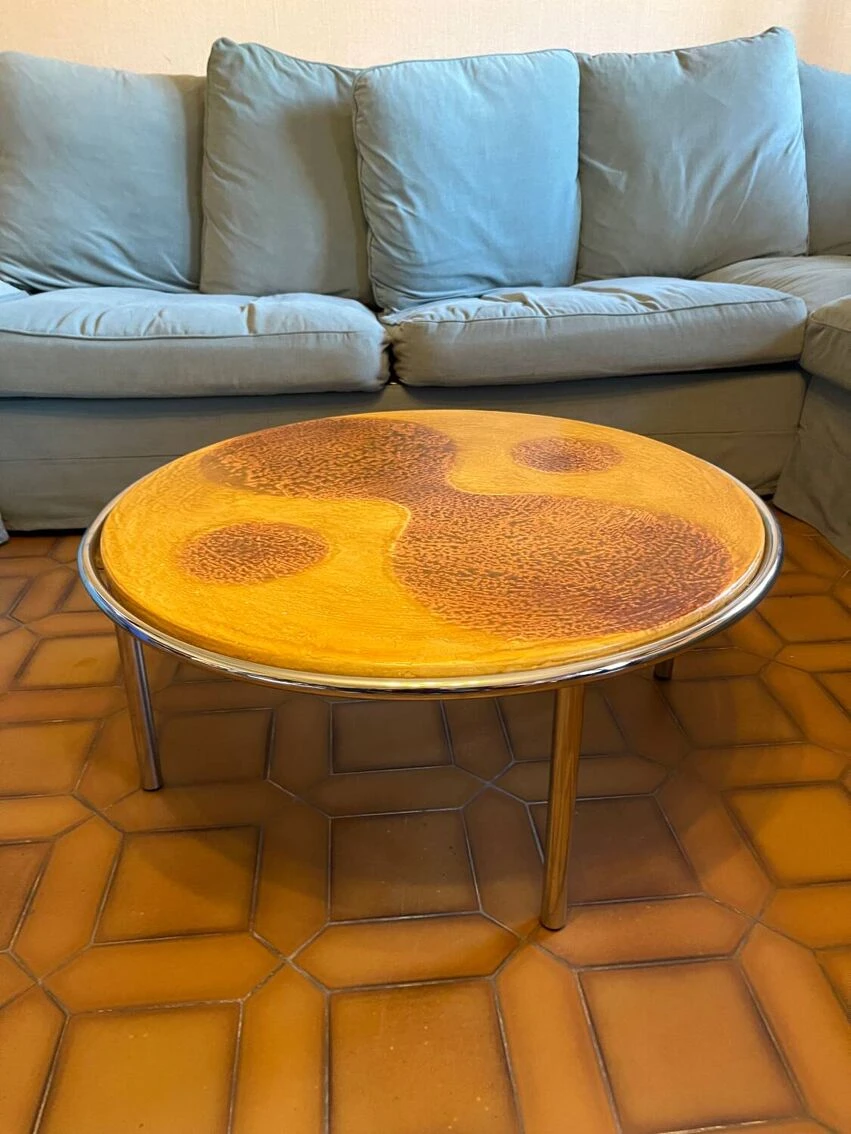 Slightly cracked resin top, resting on a tubular chrome steel base.