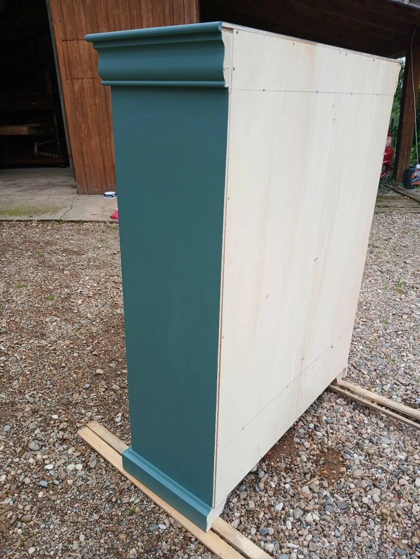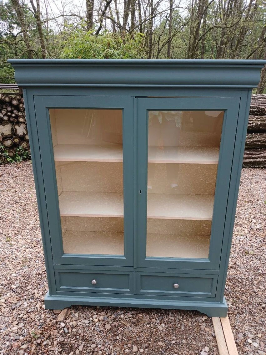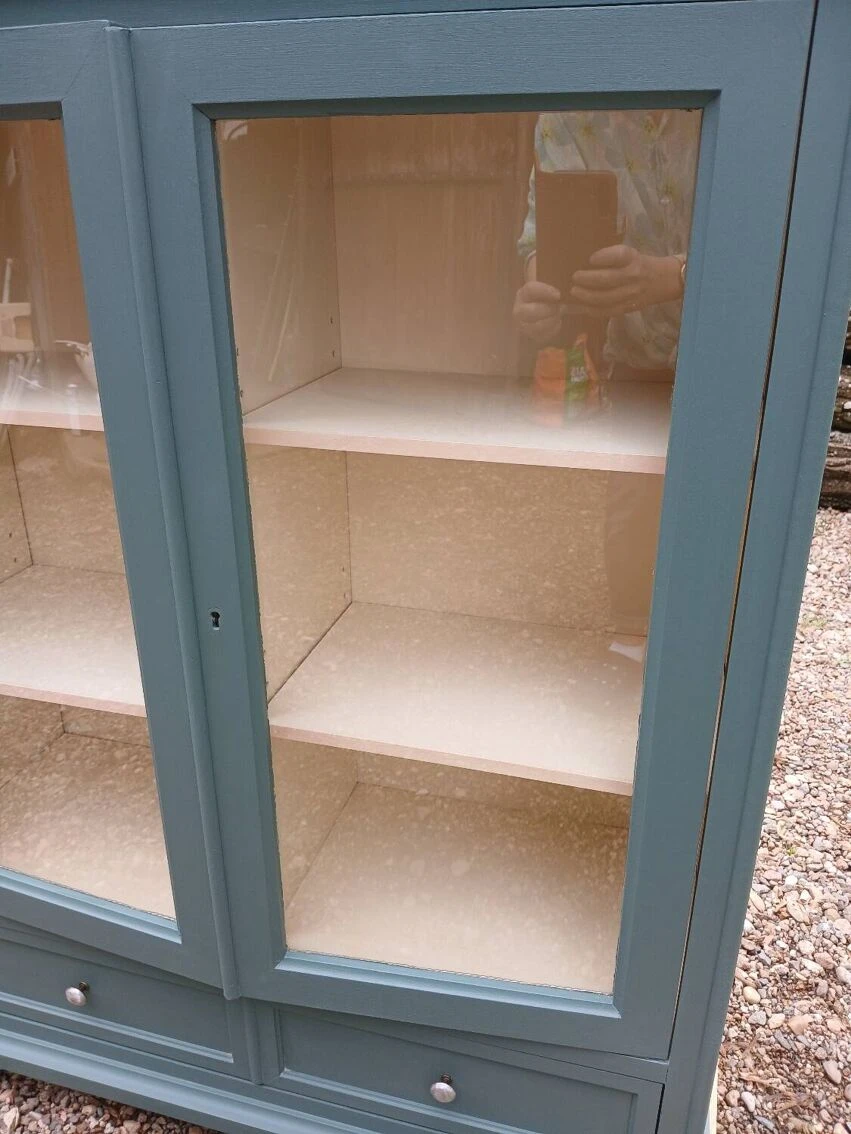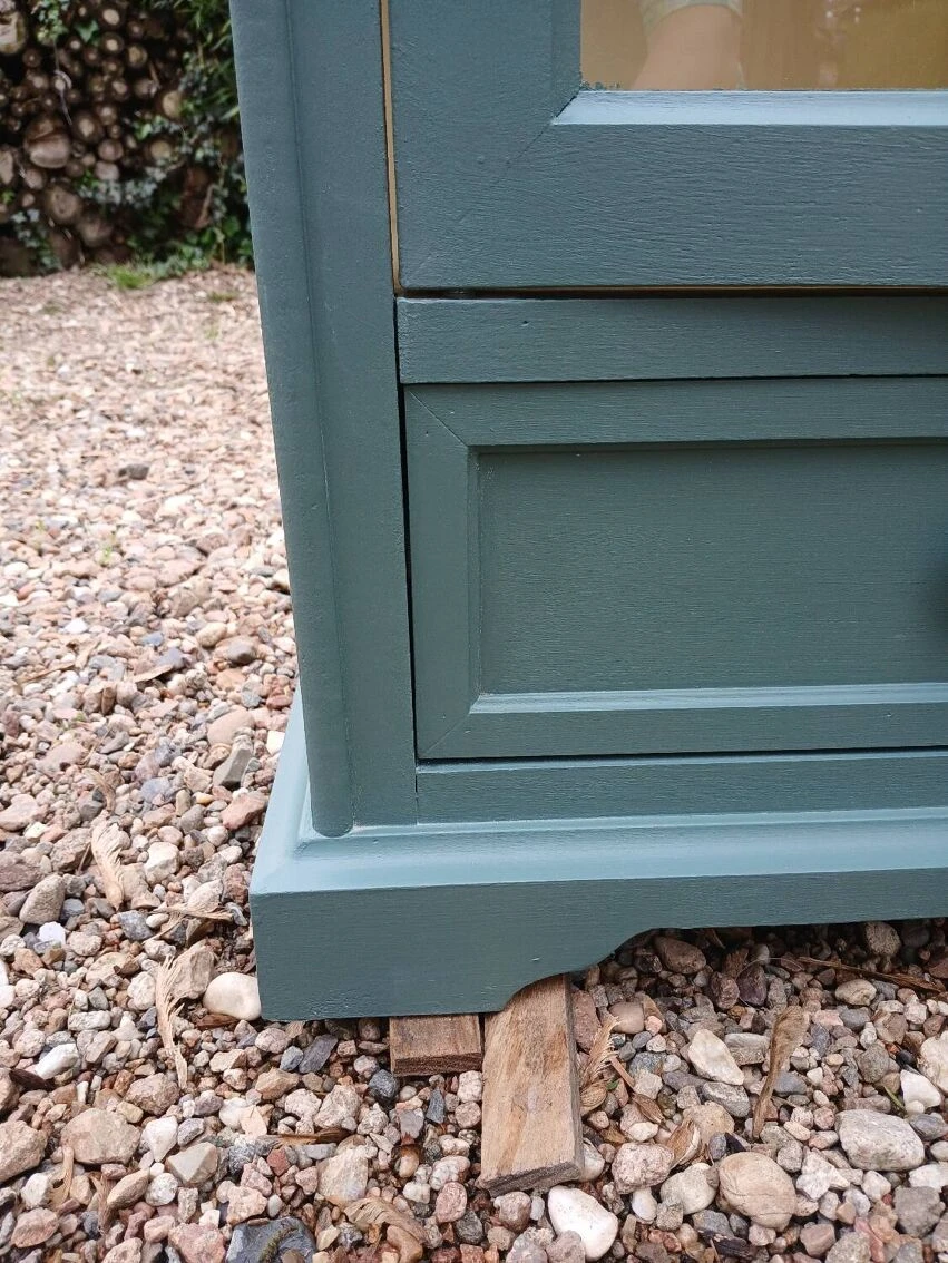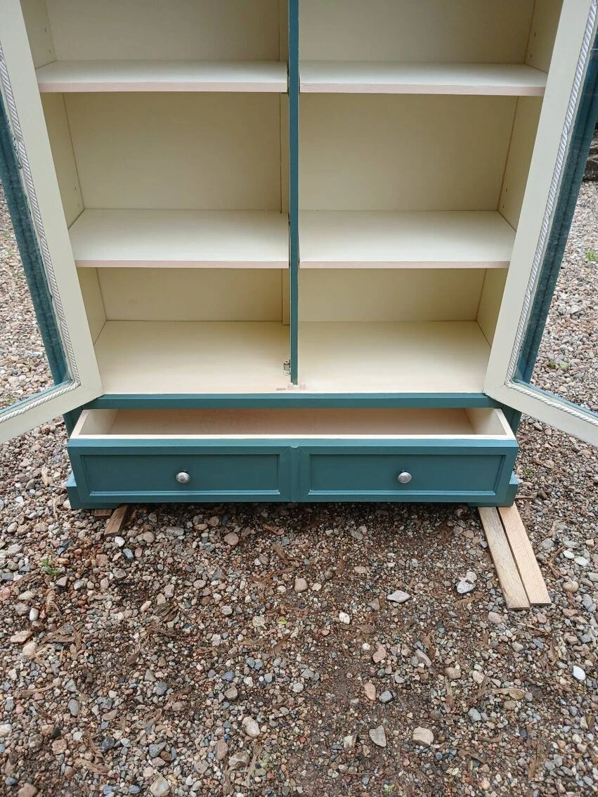 Wooden glazed furniture. 2 glass doors, 1 large drawer at the bottom, 3 shelves. Repainted in “ballina green” color from goodhome (see internet for the exact color / close to khaki) Height 115 cm. Width 91 cm. Depth 34 cm. In very good shape. No key but still closed.