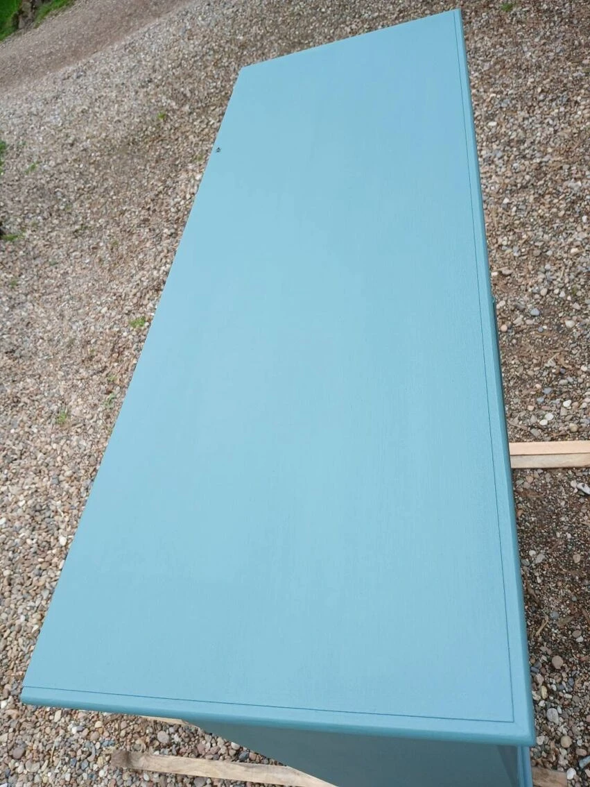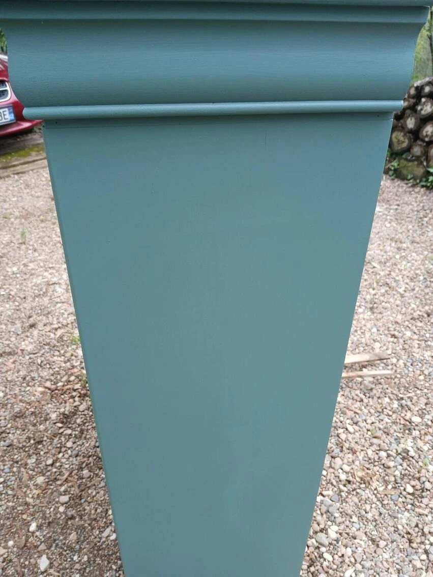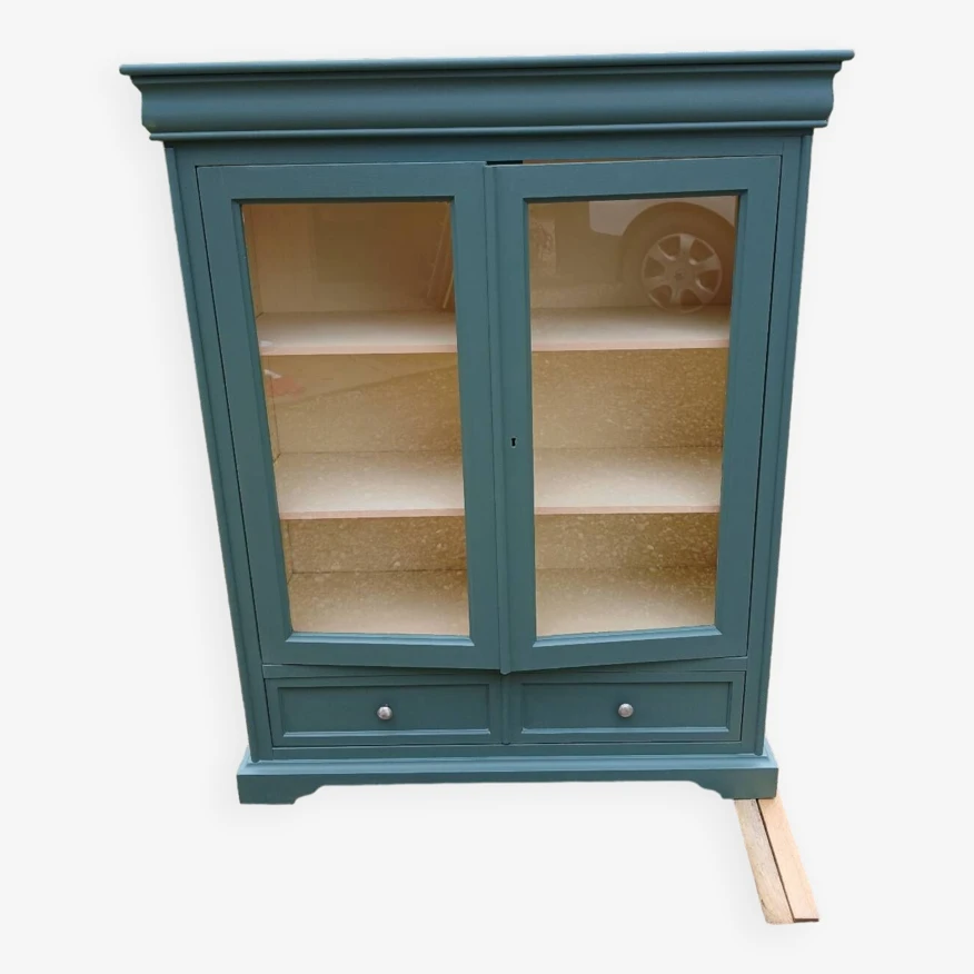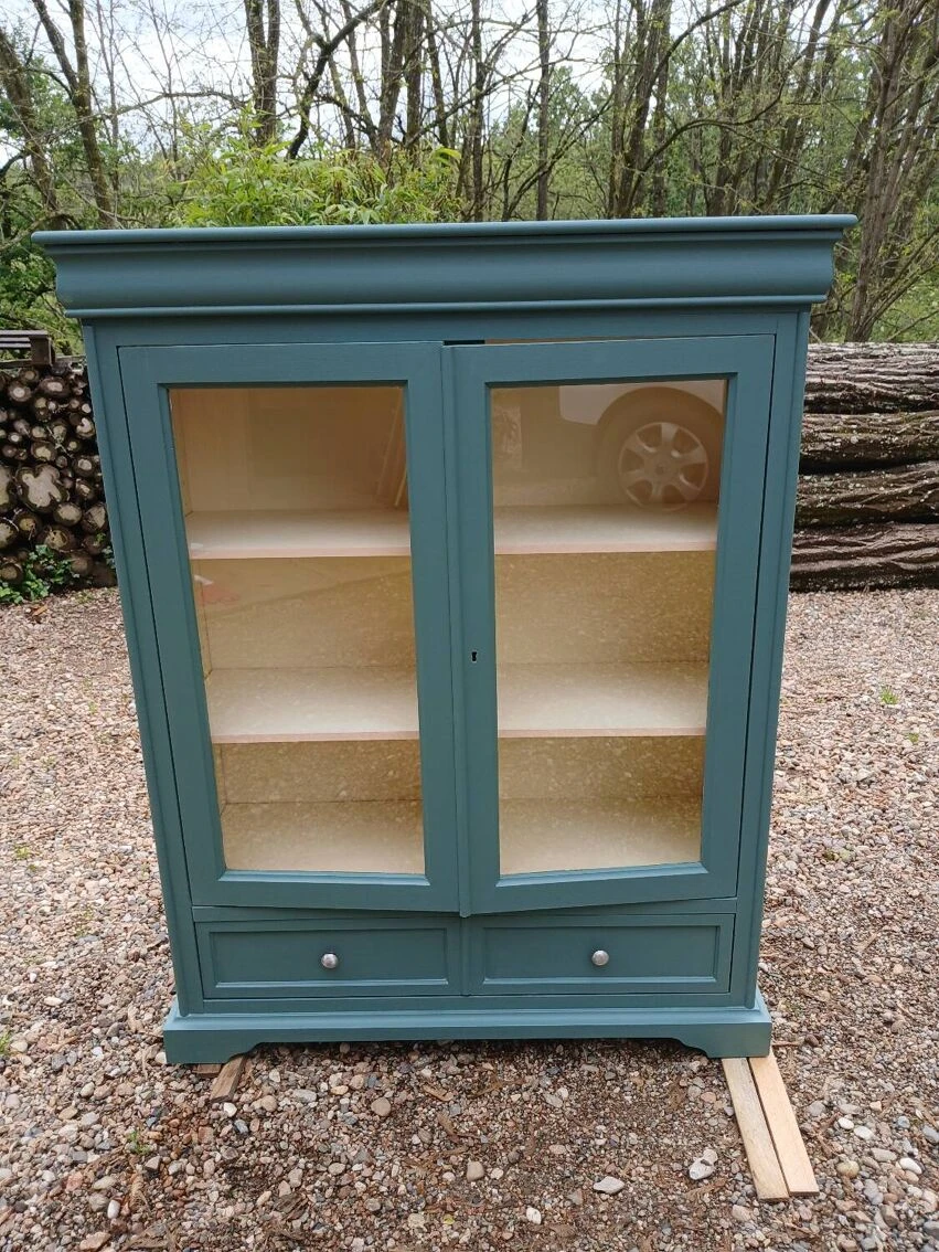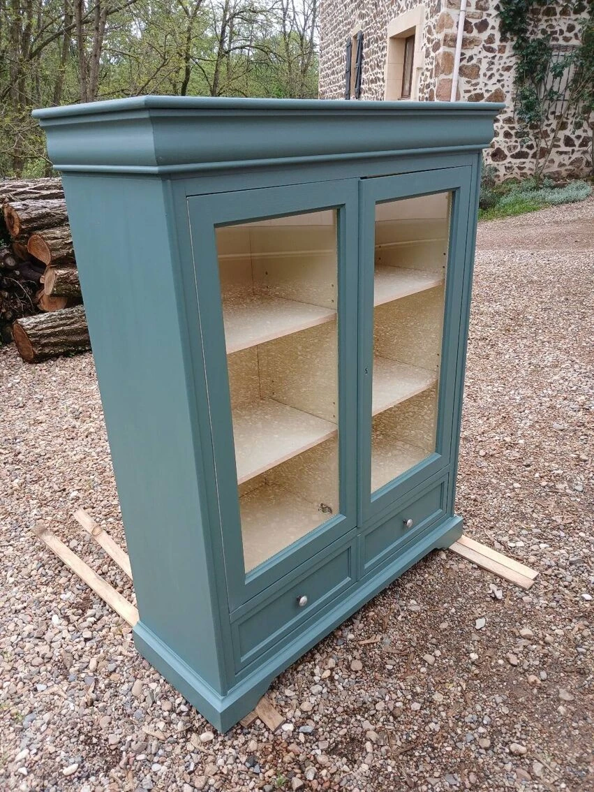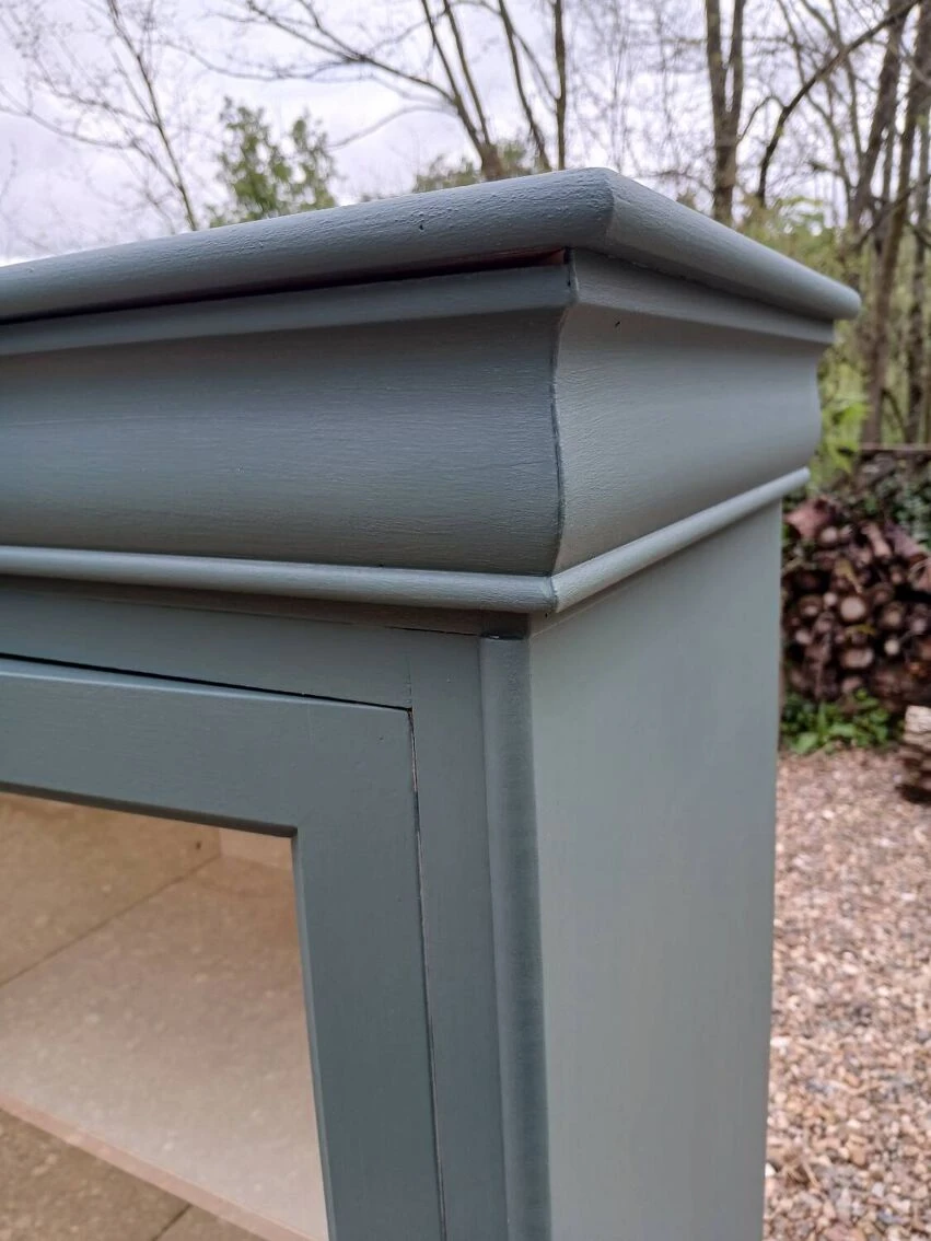 Wooden glazed furniture. 2 glass doors, 1 large drawer at the bottom, 3 shelves. Repainted in “ballina green” color from goodhome (see internet for the exact color / close to khaki) Height 115 cm. Width 91 cm. Depth 34 cm. In very good shape. No key but still closed.
