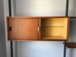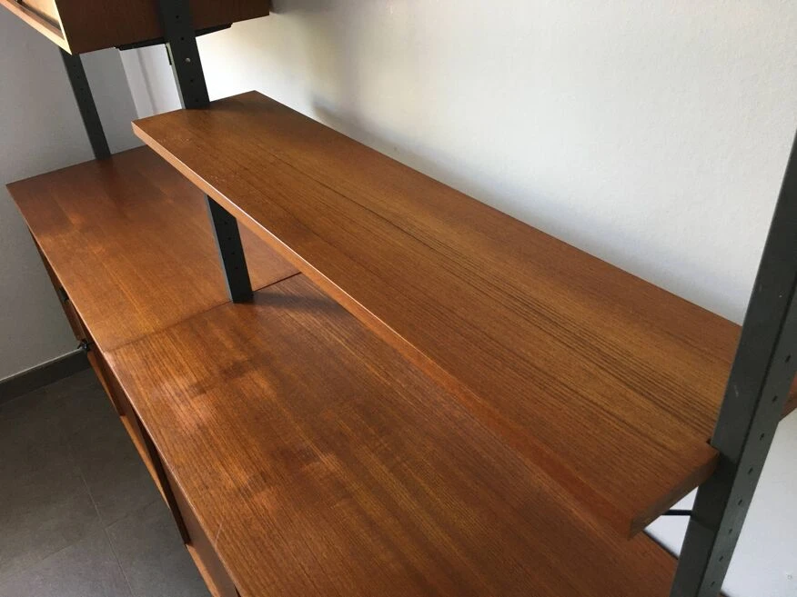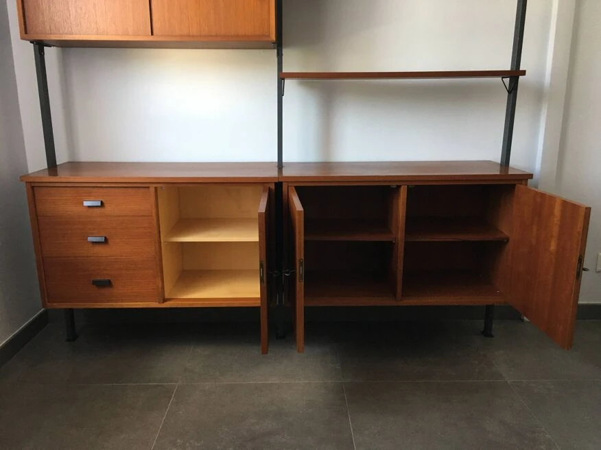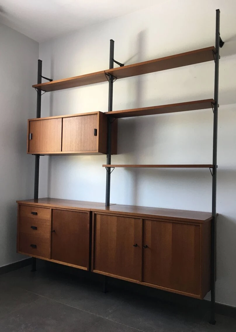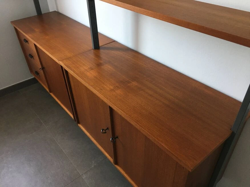 Scandinavian modular bookcase pira mobel system year 60 1 module with 3 drawers and a door, a module with 2 doors, a module with 2 sliding doors 4 shelves 90/20 cm, modules 90/40 cm a module 90/30/35 cm width total 182 cm depth 41 cm total height 220 cm the whole is modular over the entire height, good general condition, some small traces of vintage use.