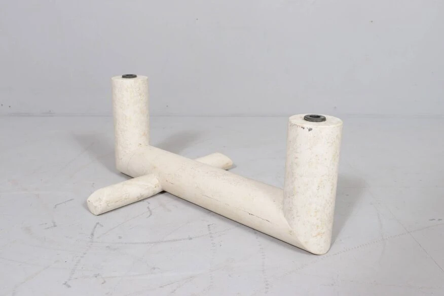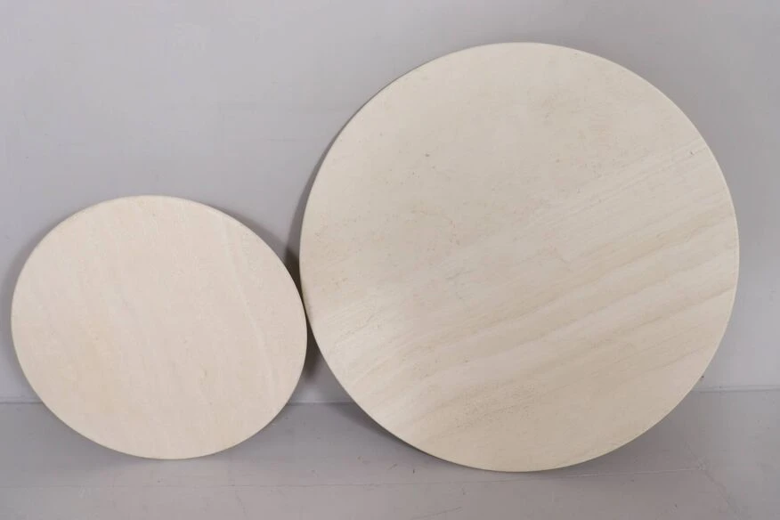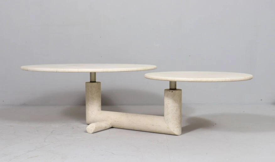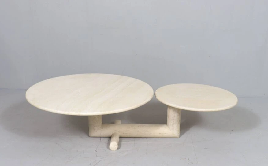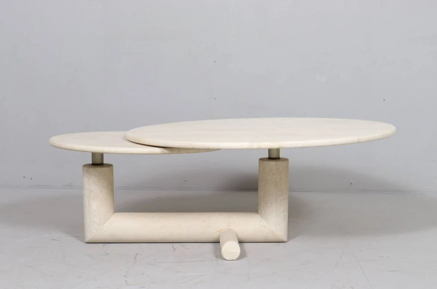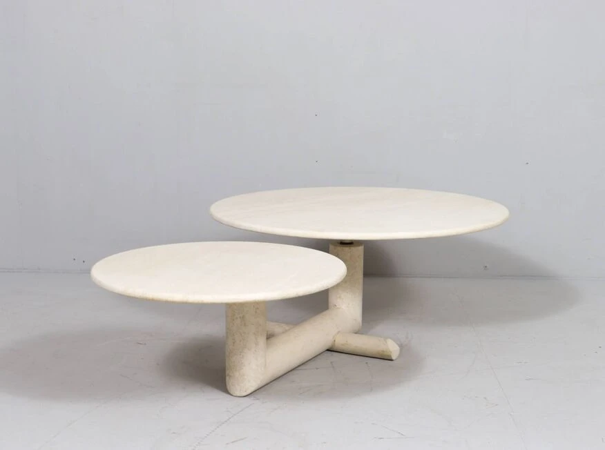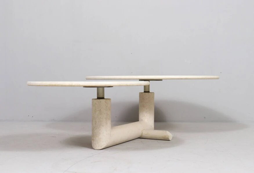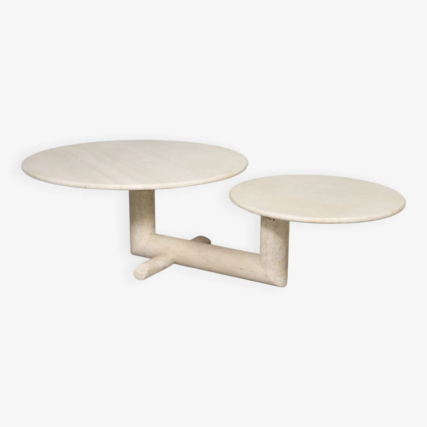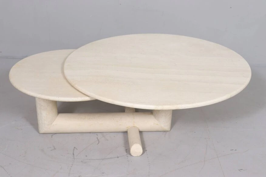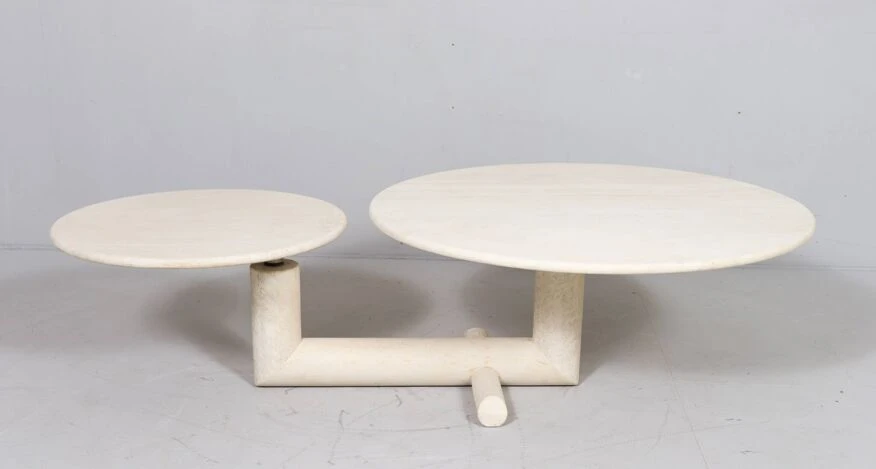 Sculptural coffee table made of travertine, italy 1980s, construction made of travertine with a cross-shaped base and two round, rotating table tops in two sizes, h.37 – 41cm, l.117-154cm, w.60 – 90cm.