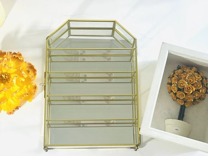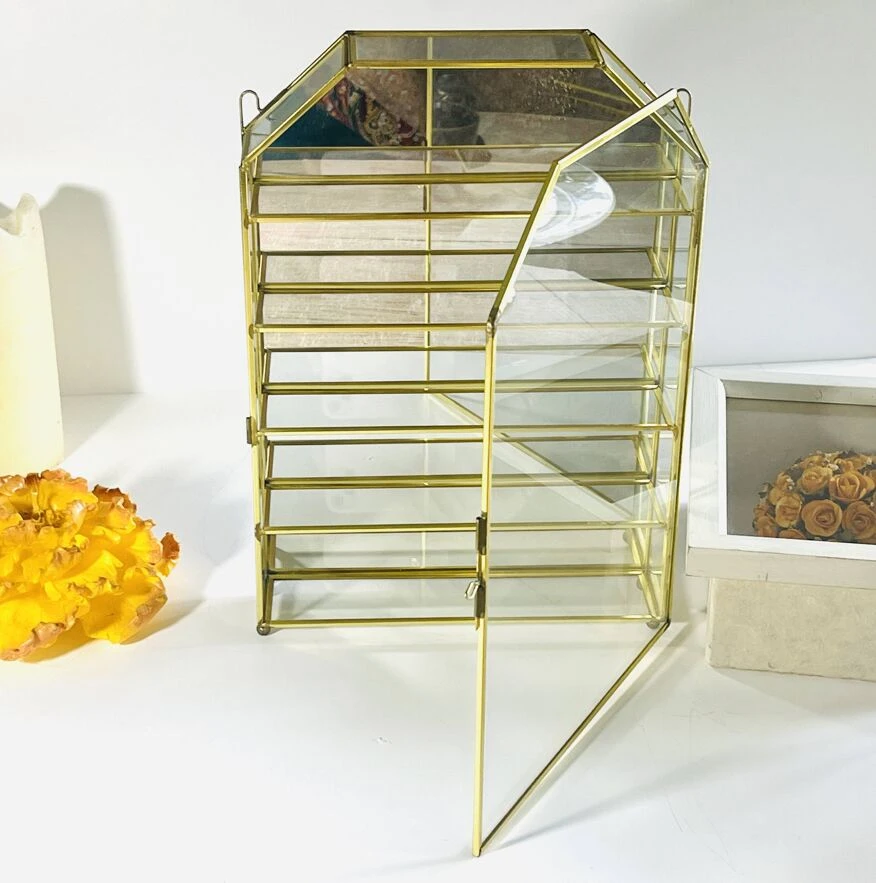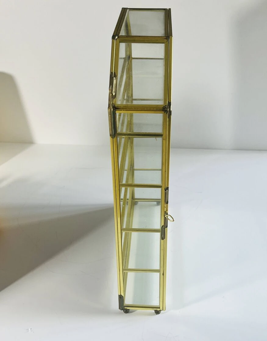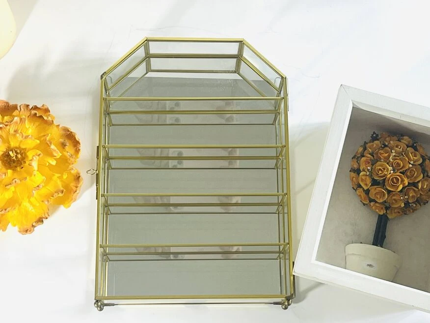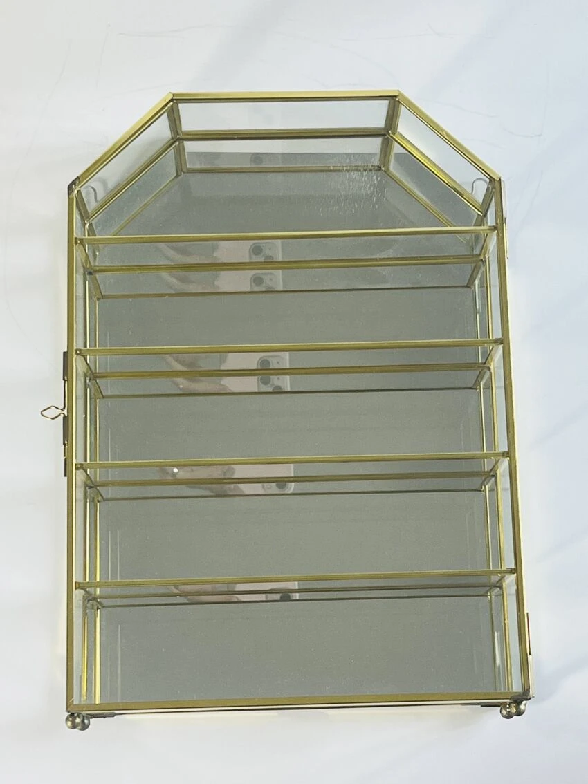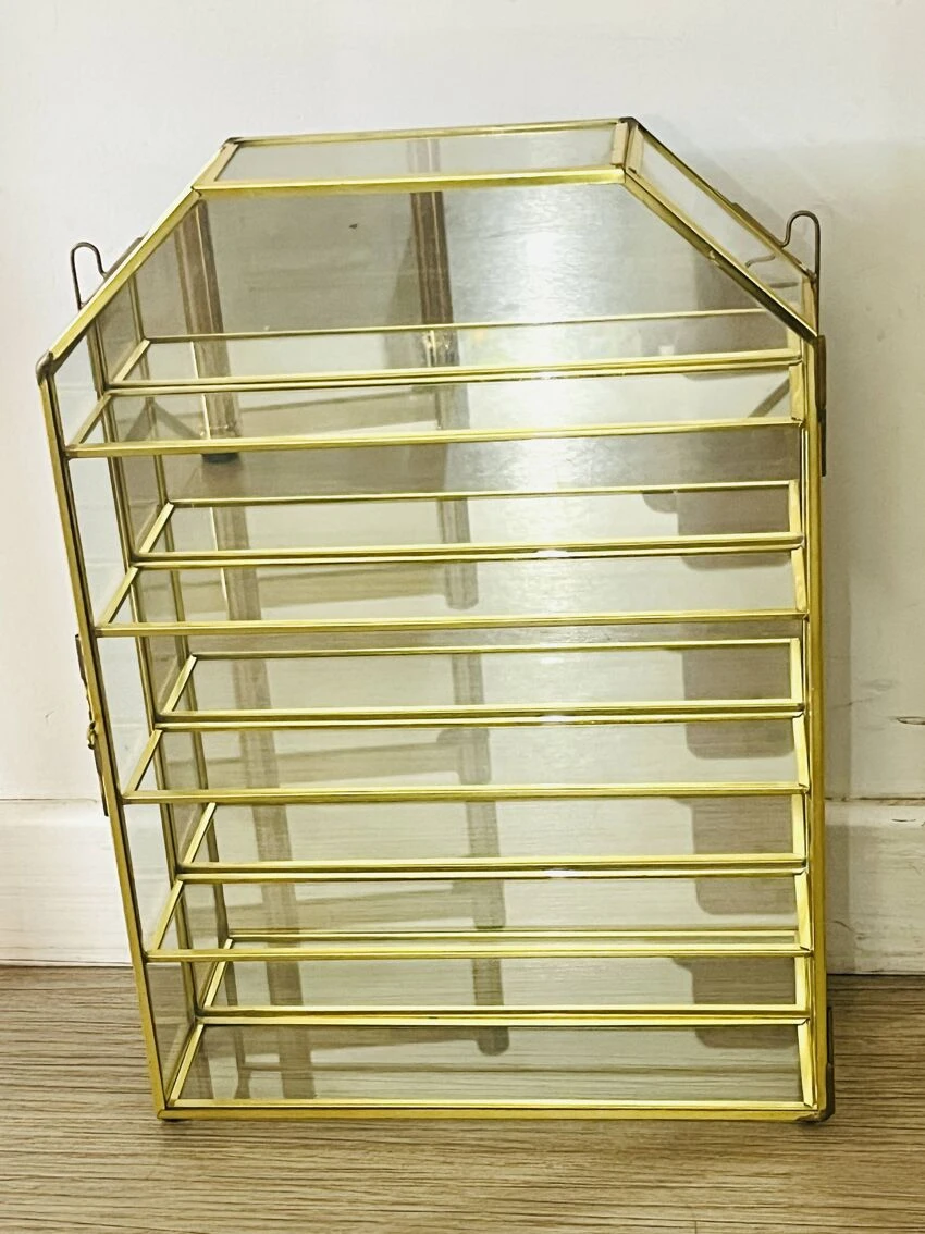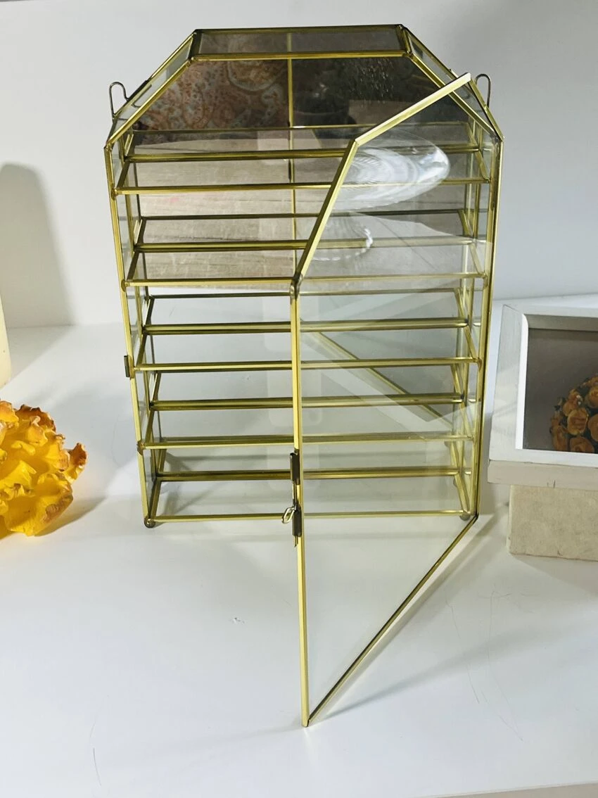 Description; high display case in the shape of a vintage golden house, ideal for old-world decoration while showcasing your jewelry or small accessories.