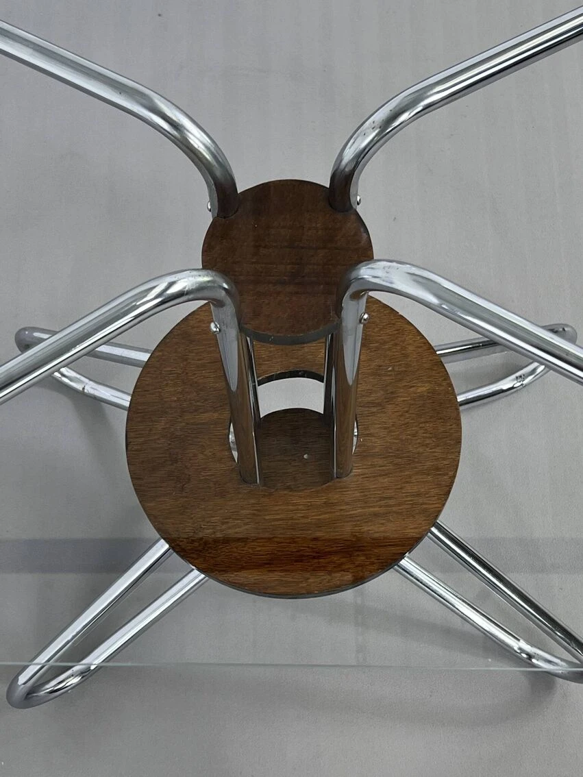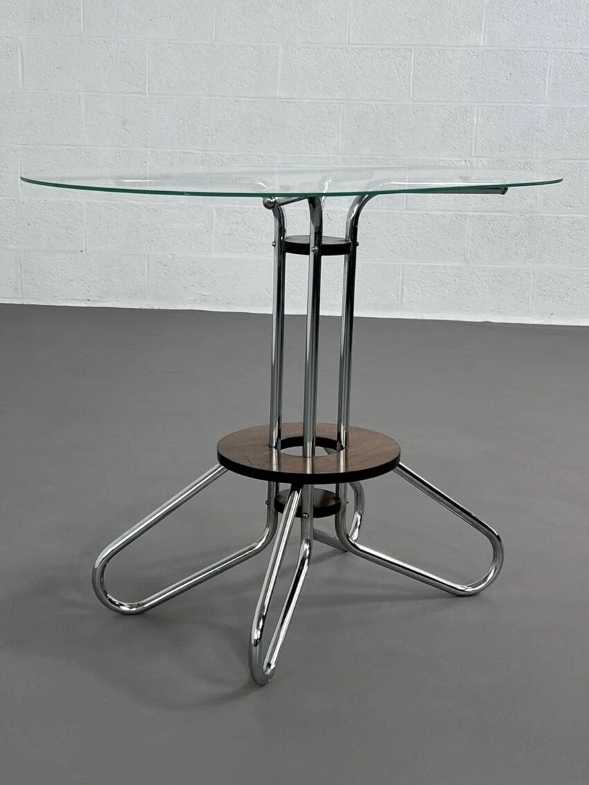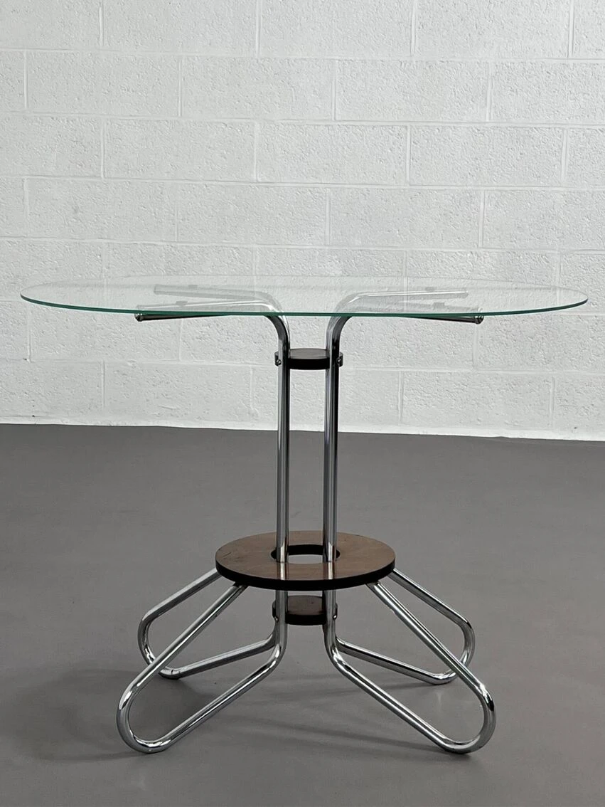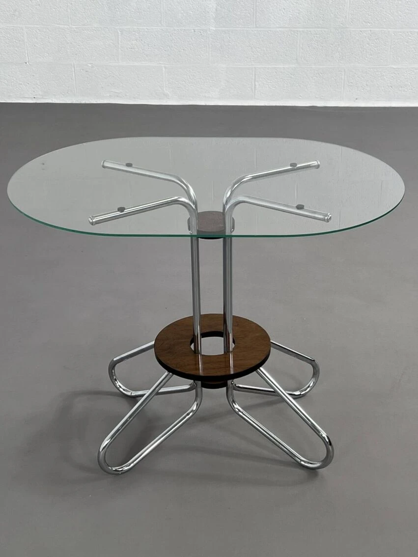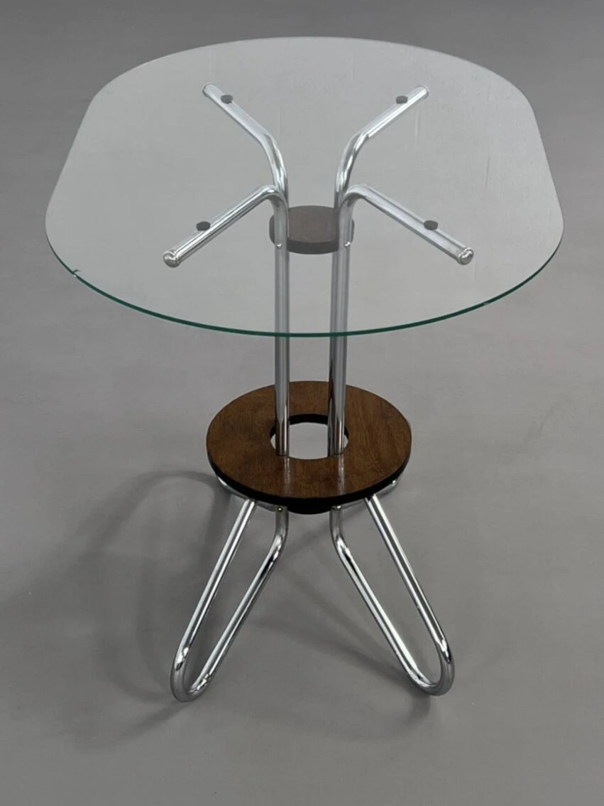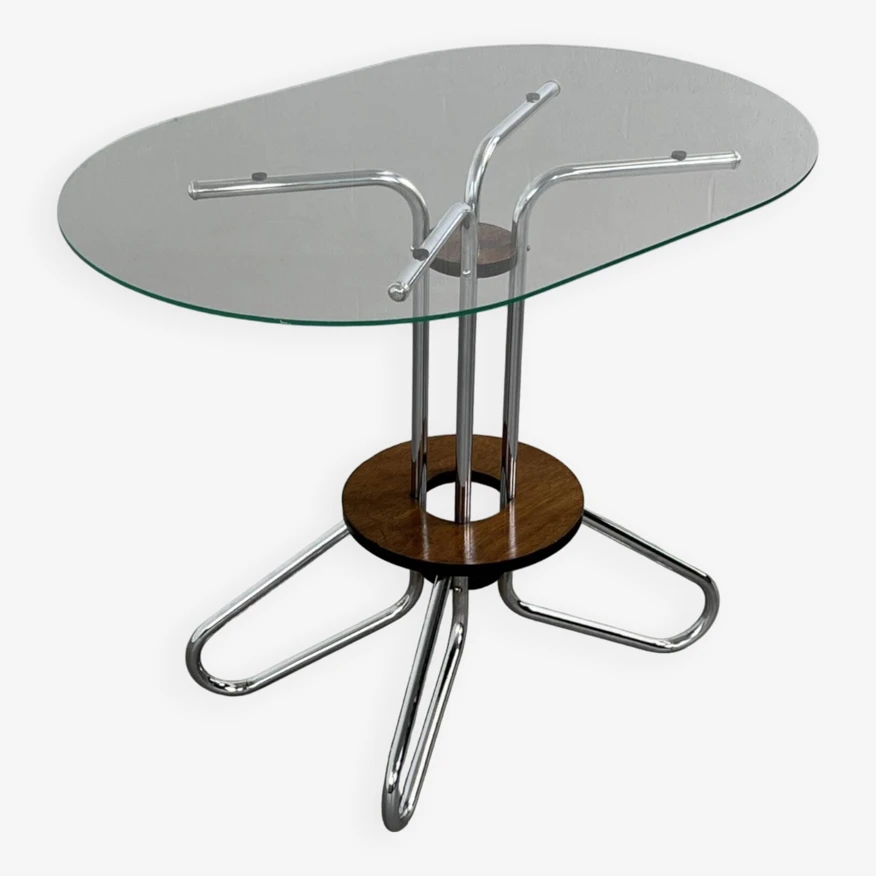 Side table / pedestal table from the beginning of the century and bauhaus style with a curved and chromed tubular structure, decorated with wooden pieces and an oval glass top.