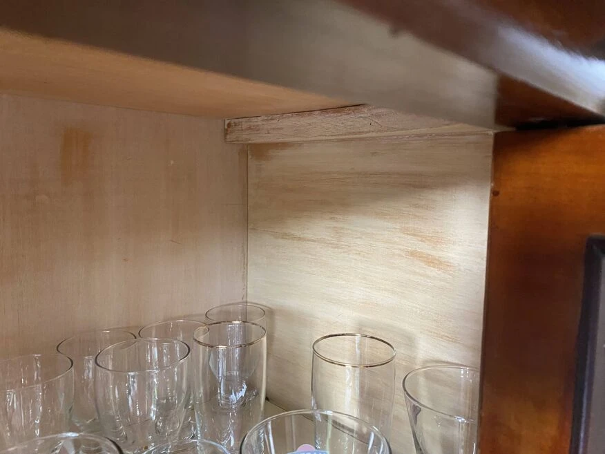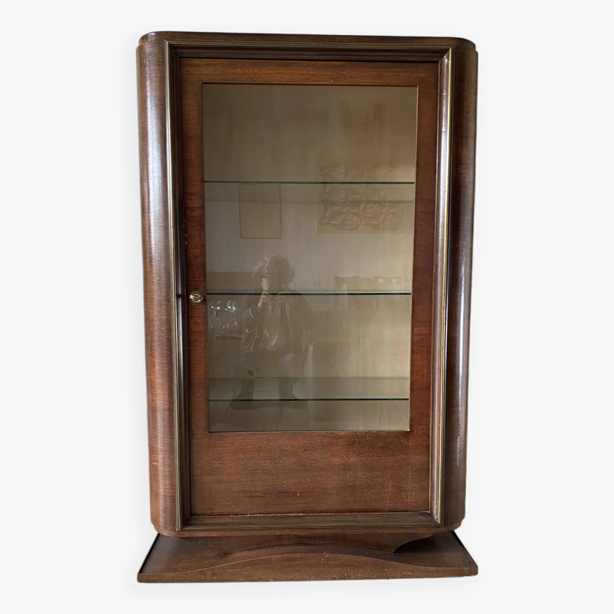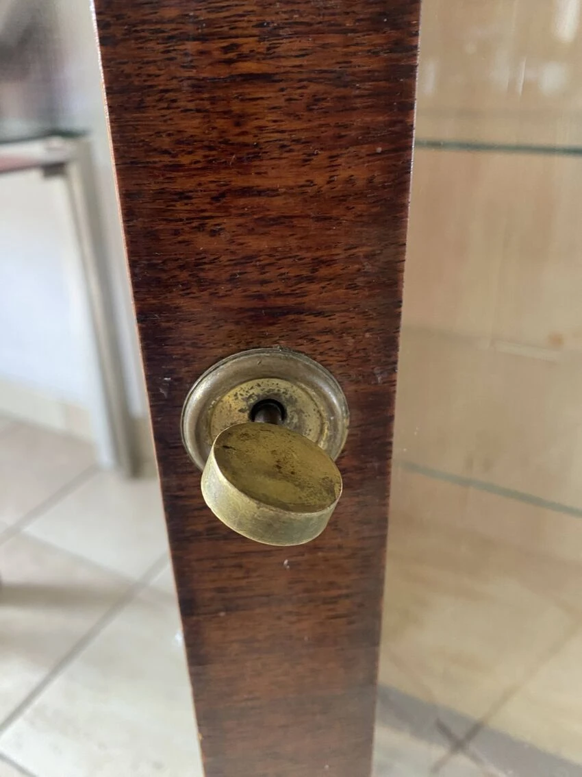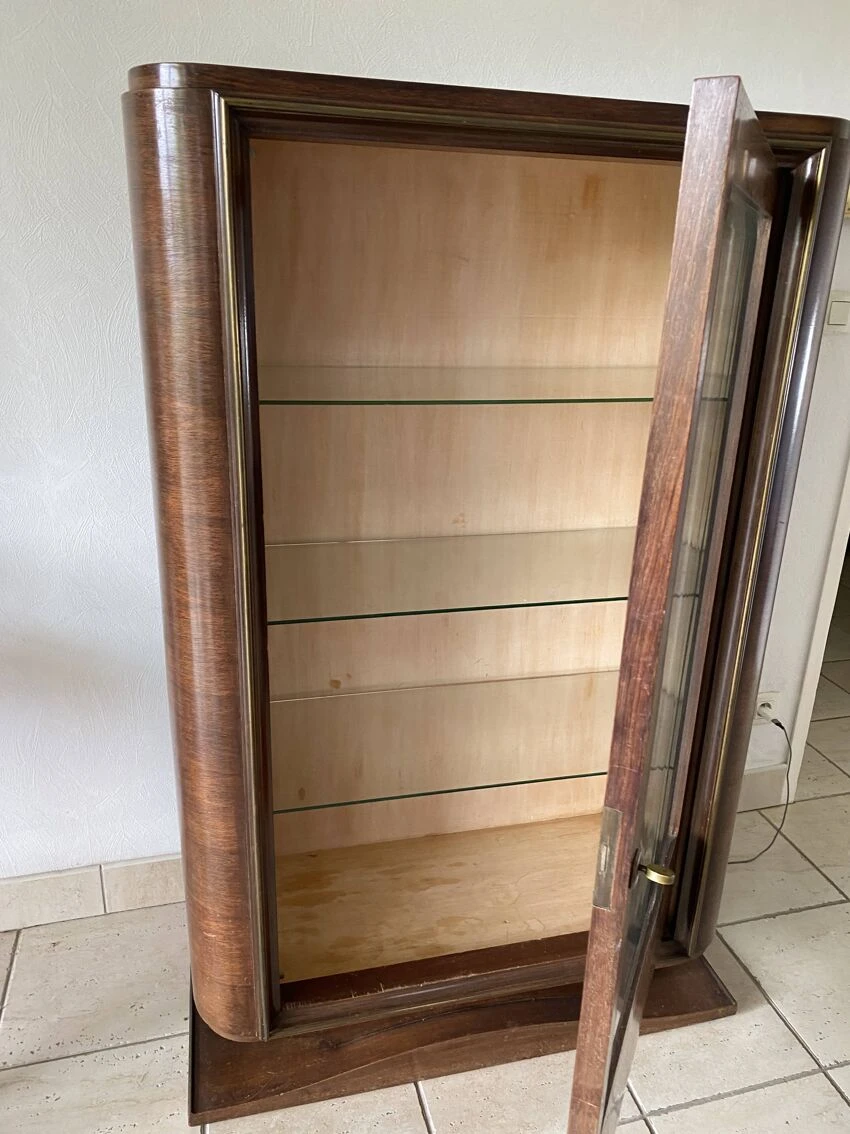 Furniture in its original condition, no recovery or restoration, mahogany exterior wood and sycamore interior, glass shelves.