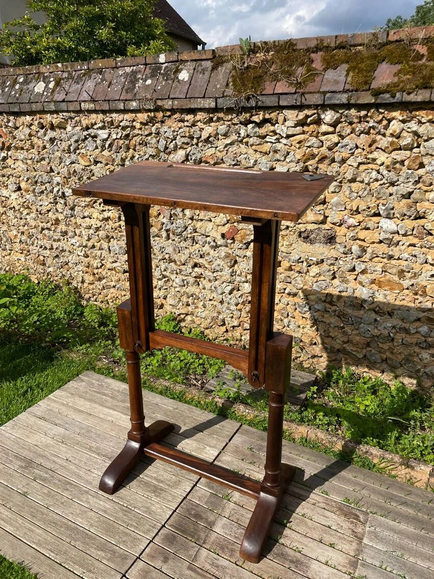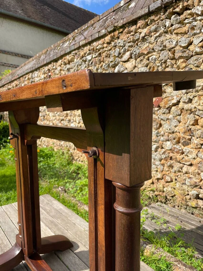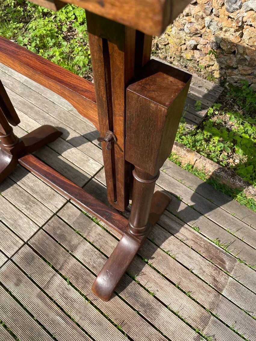 At the lowest the table is at the the rear has h 77.5 closed and the front h 72.19th century craft furniture from an old bookbinder’s workshop, solid mahogany table, works perfectly.