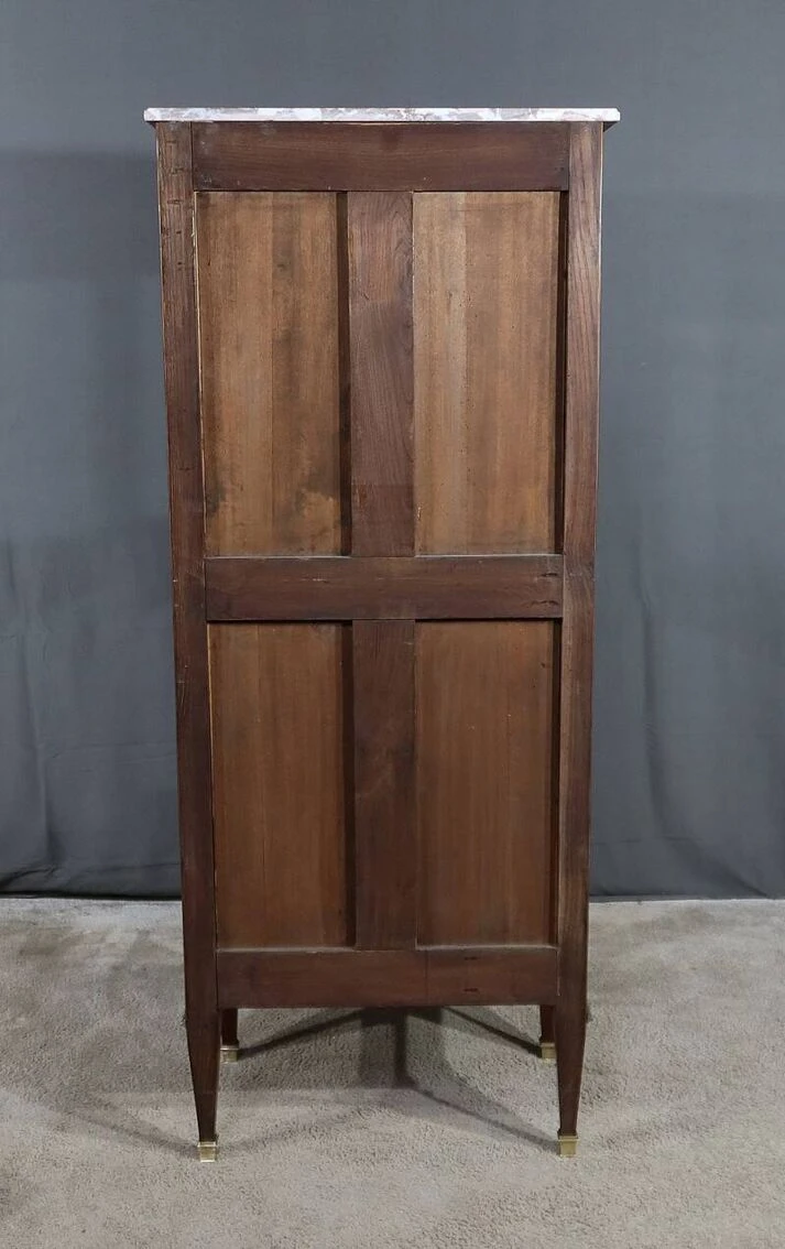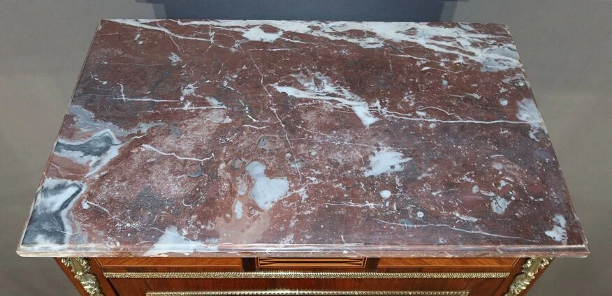 The uprights of this piece of furniture are garnished with bronze scraps in the upper part and inlaid with light wood and rosewood fillets to create a trompe l’oeil effect.